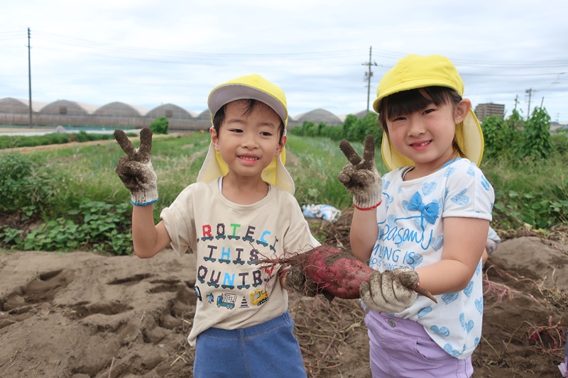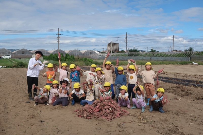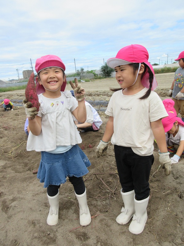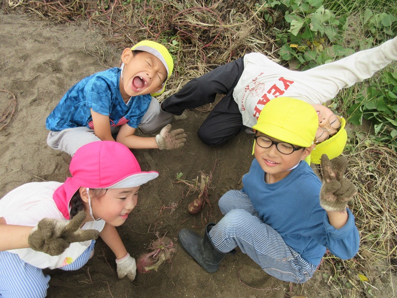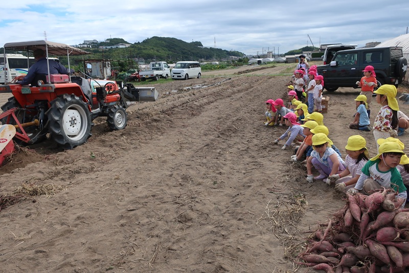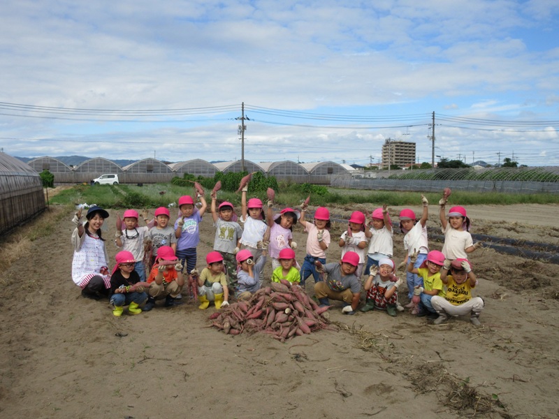 今日は、らいおん組さん、きりん組さんでおいもほりに行きました! 昨日お話してから明日はお芋ほり~♬と楽しみにしていた子どもたち♡ いつもより大きなバスに乗って遠足気分です(*^-^*) おいも畑に着くと、お芋を育てて下さった方にきちんとご挨拶をして・・ 軍手をつけた手で力強く掘り進めていきます! でも大きなお芋は一筋縄ではいかず・・きりんぐみ、らいおん組協力して 『ここ大きいお芋があるよ!手伝って~』と声を掛け合いながら、一生懸命掘り進めました♪ 途中で折れてしまうお芋や掘りかけのお芋があったりしたので、『自分の掘ったお芋はさいごまでしっかり掘って折れないように抜くこと』を目標に頑張りました! おいもが採れたときの子どもたちはとってもニコニコ(*^-^*) 素敵な笑顔がたくさん見れました(^^♪ 最後は仕上げにトラクターでおいもを掘ってもらいました! 最後はさつまいもを育ててくださった方、お手伝いをしてくれた方にお礼を言って帰りました! 今回も普段はなかなかすることができない素敵な経験ができました! お家で、園でみんなで採ったさつまいもをたくさん食べてもっと大きくなろうね☆ |
