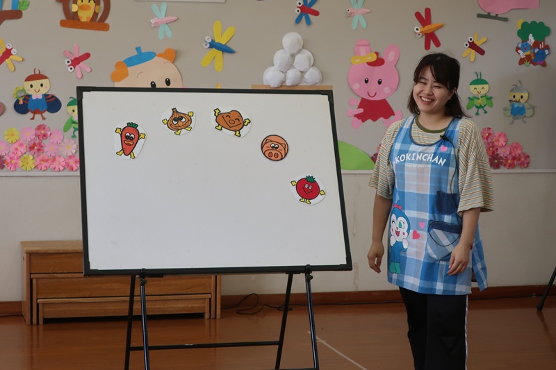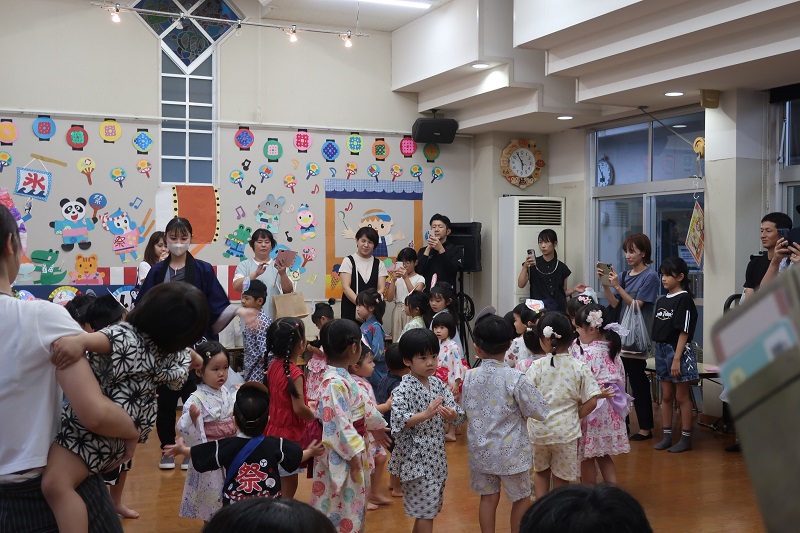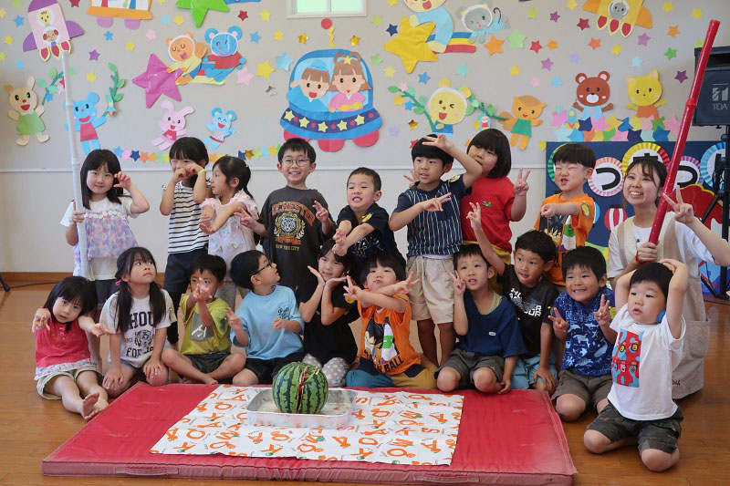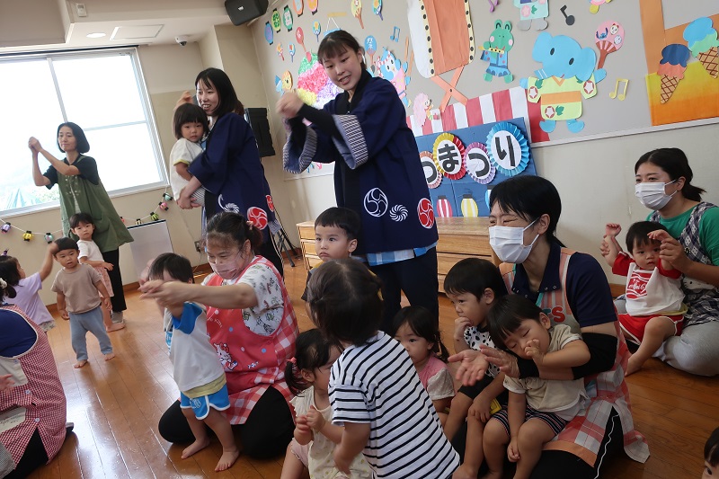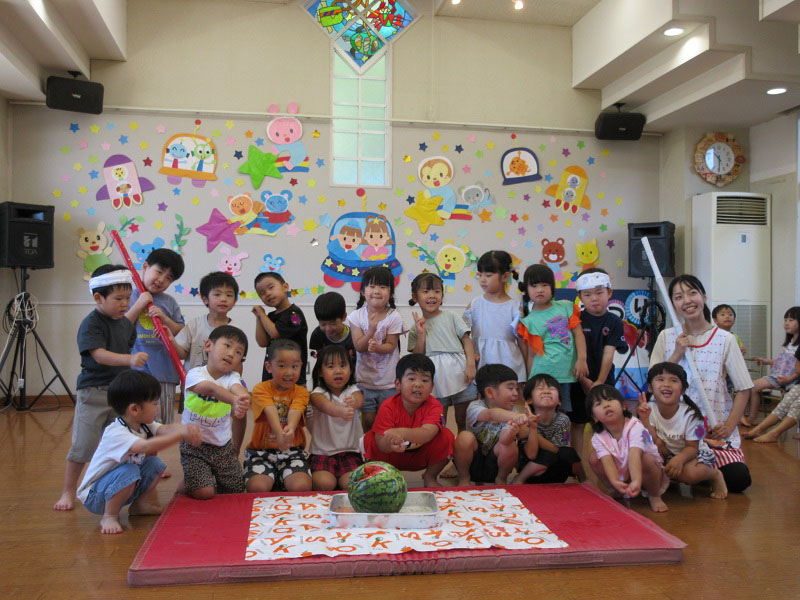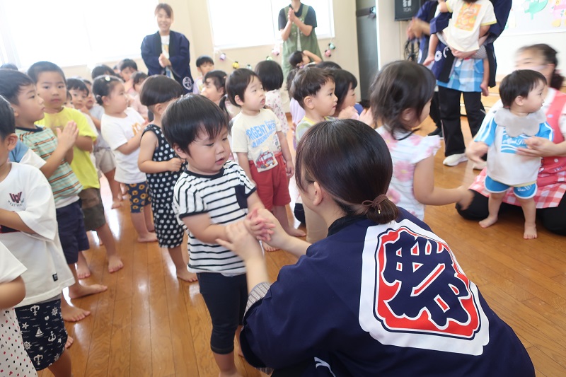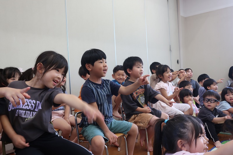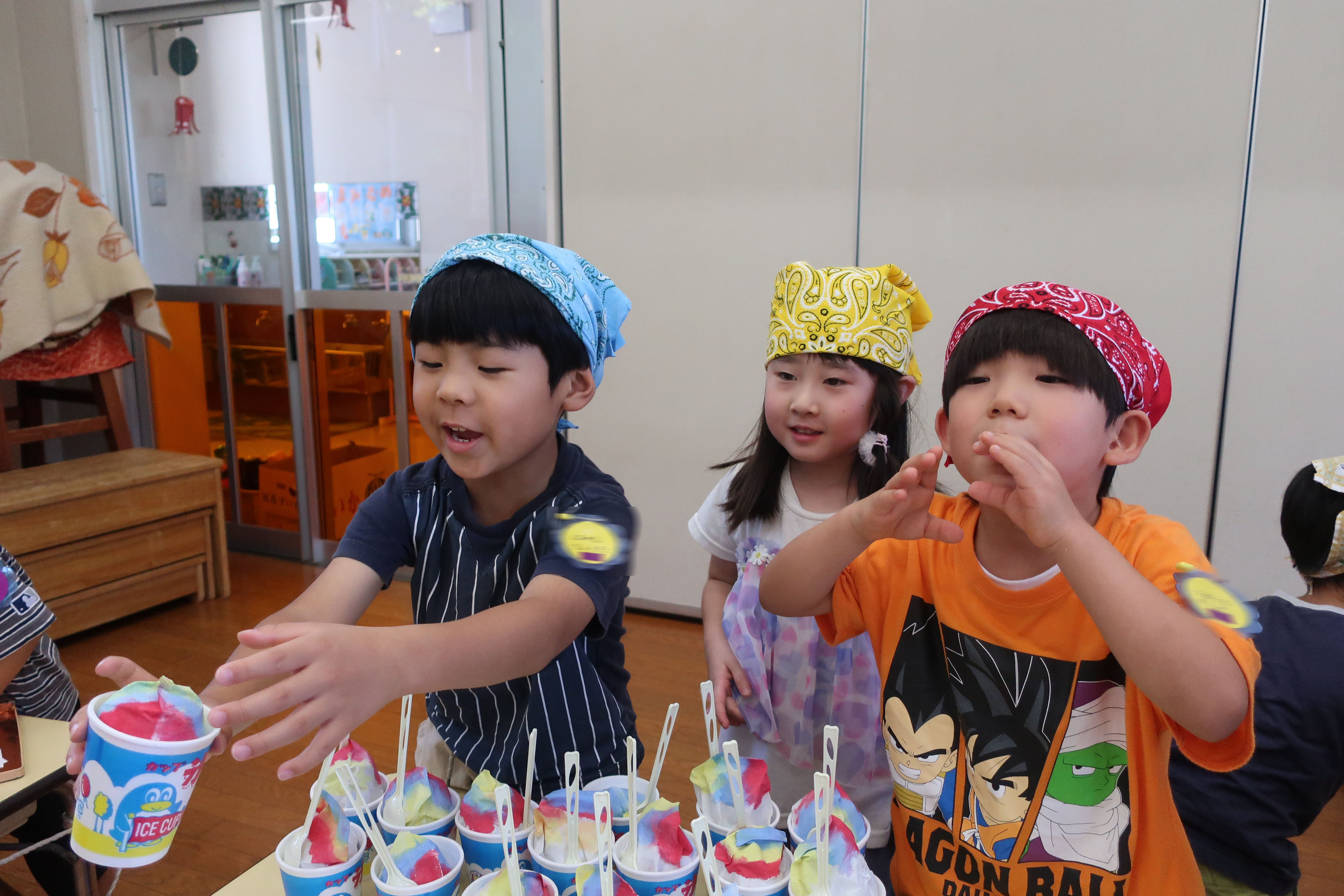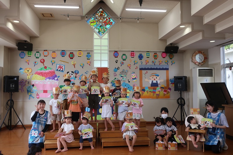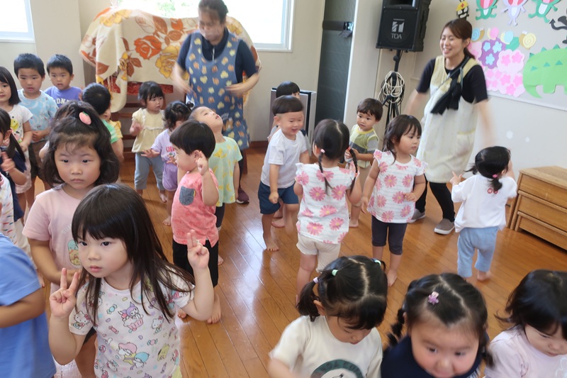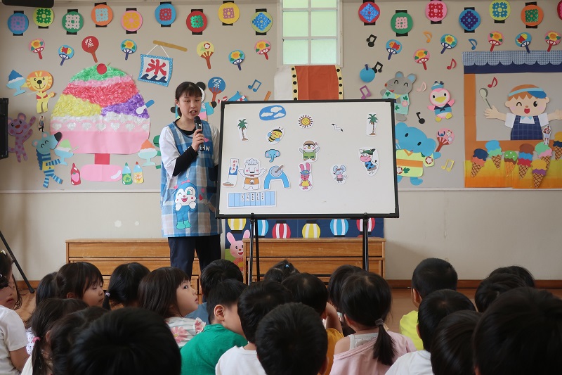 今日は、8月生まれのお友だちのお誕生日会がありました。 らいおん組・きりん組・ぞう組のお友だちは「名前」「何歳になったか」「大きくなったらなりたいもの」、りす組・ひよこ組のお友だちは「名前」「何歳になったか」「好きな食べ物」を答えました!少し緊張気味のお友だちもいましたが大きな声で応えたり、名前を呼ぶと手を挙げて返事をすることげできました♪ たんたんたんたん誕生日やおばけなんてないさ、アイスクリームを歌ってお祝いをしました。リズムに合わせて身体を左右に揺らしたり、手拍子をしたり、大きな声で歌っていましたよ。 先生からの出し物ではパネルシアター「しろくまさんのなぞなぞかき氷」を見ました。なぞなぞに答える事ができるとかき氷を食べる事ができます。「れいぞうこに隠れている動物ってなとなぞなぞを出すときりん!らいおん!といろいろな動物が出てきました。ヒントでシルエットを出すとみんなで「ぞう!」と答え、無事かき氷を食べる事ができました! 最後に盆踊り「やさいおんど」を踊りました。振付をしっかり覚えていて楽しく踊っていましたよ♬ |