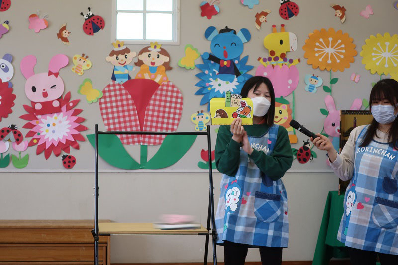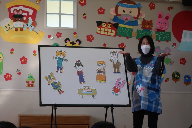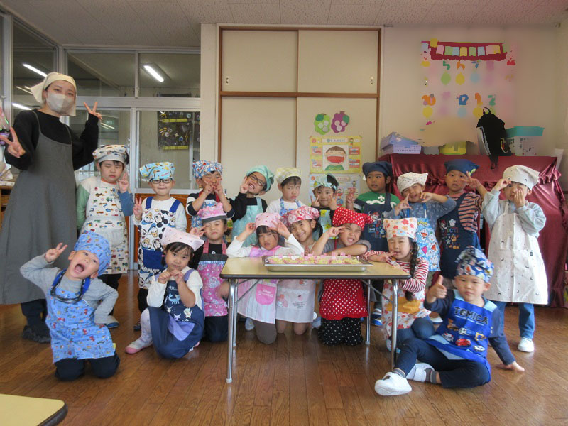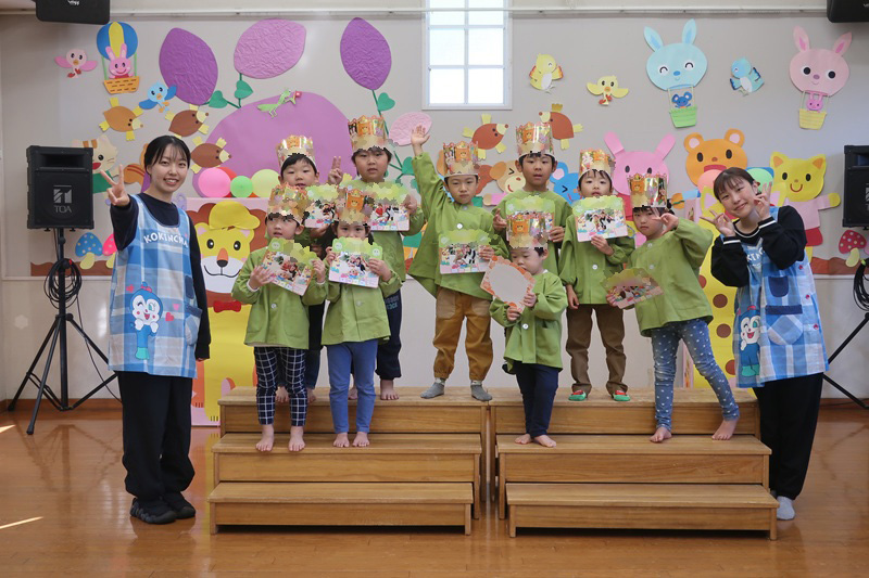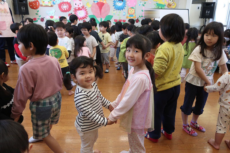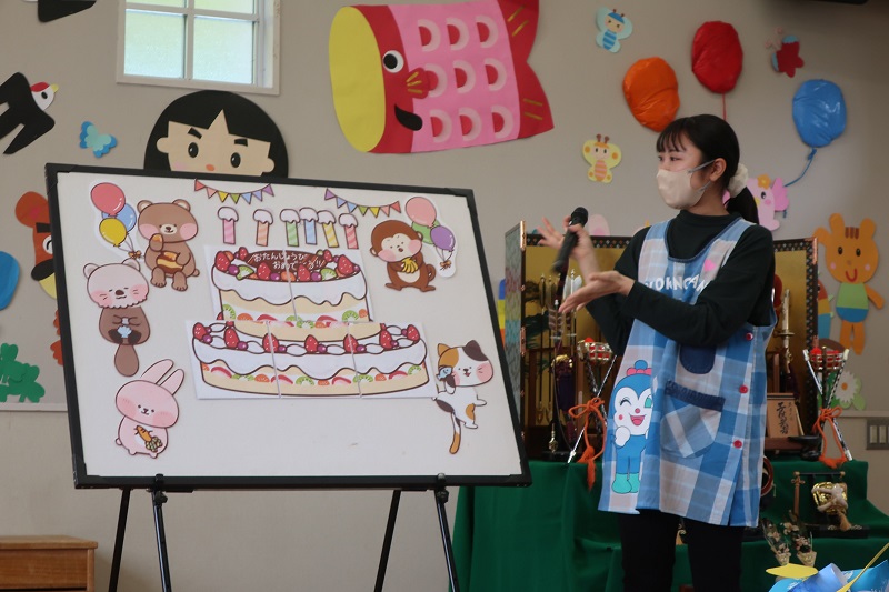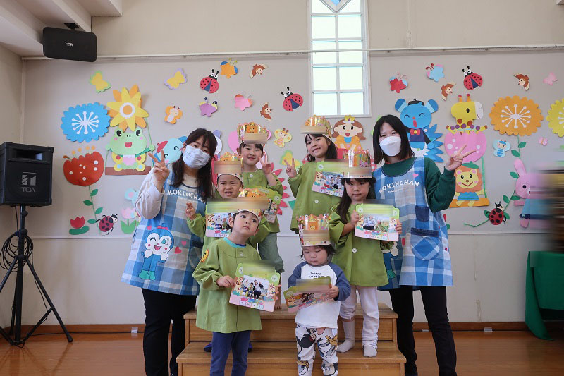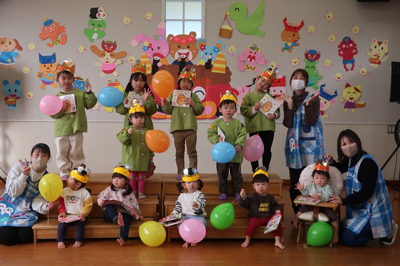 11月のお誕生日会をしました!今月は6人の誕生日のお友だちがいましたよ。 お誕生日のお友だちには ・なまえ ・年齢 ・大きくなったらなりたいもの を聞きました!大きな声で答えてくれましたよ☆ 先生からの出し物は「おおきなかぶ」のエプロンシアターでした!「うんとこしょ、どっこいしょ」とみんなで言いながらかぶを抜きました。最後にはお誕生日のお友だちにも出てきてもらい、大きいかぶを抜くことができました(^^)/ 鞆消防署から借りた「しまじろうの消防隊」というDVDも見ました。子どもだけでは火遊びをしない、ストーブの近くには燃えるものは置かないとお約束をしました! 最後はみんなで「うーぱー!るーぱー!」というダンスをしました!簡単な振り付けだったので小さいお友だちも上手に踊っていましたよ! お誕生日のみんな、おめでとう! |