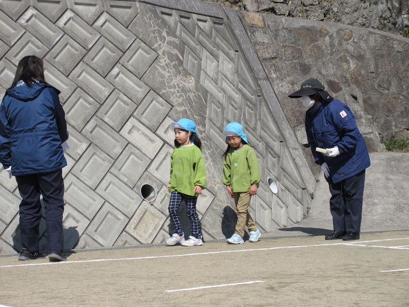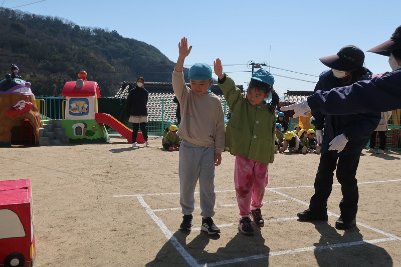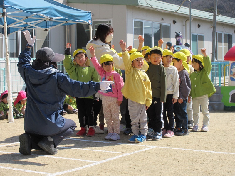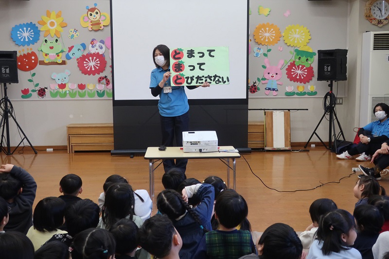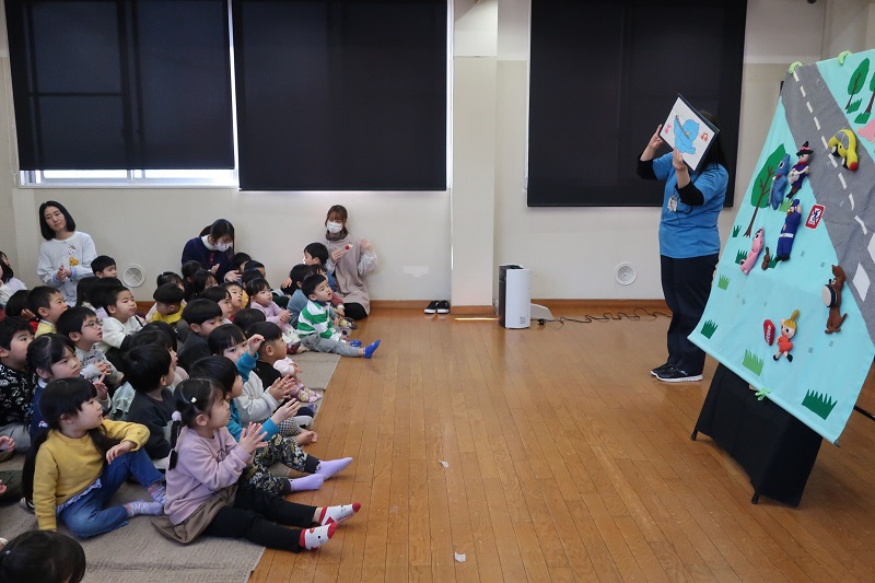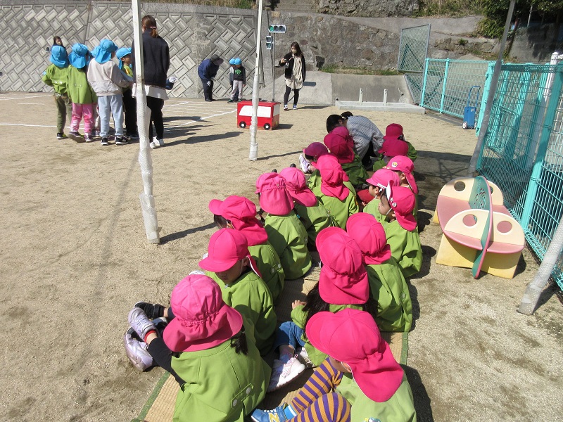 今日は、福山市役所の方々が来てくださり、年に一度の交通安全教室がありました! まず始めに、ムーミンのパネルシアターとDVDの鑑賞をしました。 可愛い人形が道路の渡り方を教えてくれて、小さいお友だちも静かに見ていましたよ☆ 道路を渡る時のお約束 [と・ま・と] を教えていただきました! ☆と・・・とまって ☆ま・・・まって ☆と・・・とびださない この約束をしっかり覚えた後に、実践練習を園庭でしました! 実践練習に参加したのは、4歳児と5歳児です。 3歳児は見学をして、その他のクラスは各部屋で過ごしました。 「右手を挙げて、右・左・もう一度右」を見てから横断歩道を渡る事、 道幅が狭い歩道は、右側を歩く事を教えてもらいましたよ! みんな教えてもらったことをしっかり意識して練習に取り組みました☆ 最後に、4・5歳のお友だちは、自転車についての約束も教えてもらいました。 ☆道路に飛び出さない ☆道路で遊ばない ☆自転車に乗る時はヘルメットをかぶる です!! 今回の交通安全教室で教えてもらった事をしっかり守って、安全に お散歩やお出かけを楽しんでいこうと思った子どもたちでした。 お土産に塗り絵を頂きましたので、お家でもお話をしながら塗り絵を 楽しんでいただけたら嬉しいです。 |