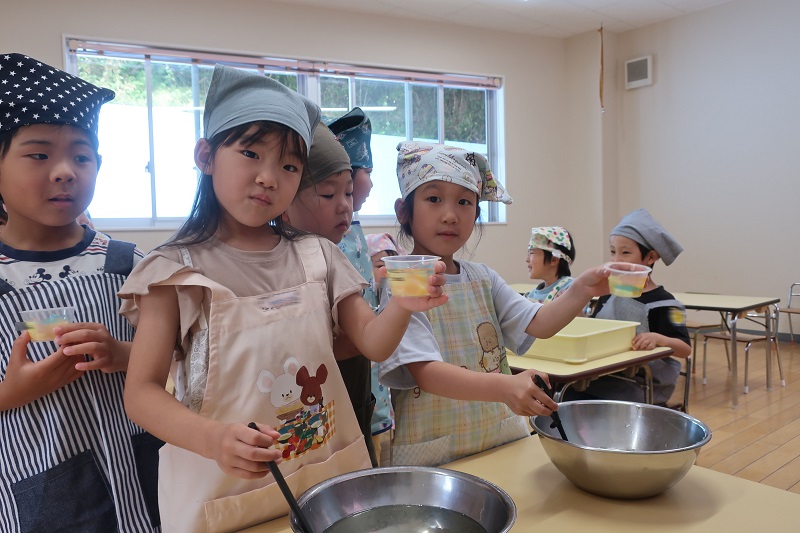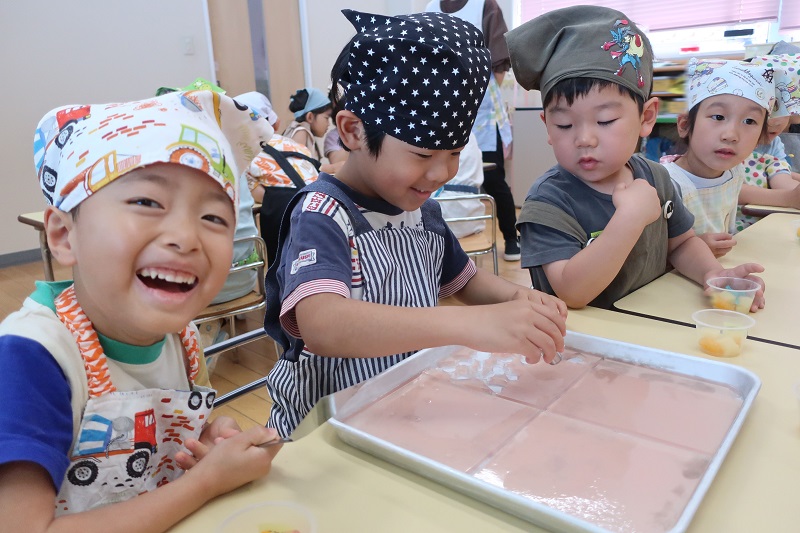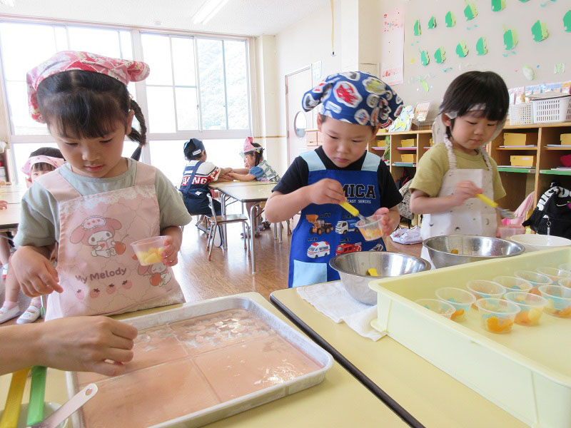 「クッキング~♪」 今年度 第1回目のクッキングは…! 四苦八苦しながら、先生に手伝ってもらいながら着て、やる気 満々!!ゼリーの作り方を真剣に聞きフルーツを上手に2個ずつ スプーンで入れたりゼリーの型抜きをしましたよ♪ 作っている最中には「いい匂い~!!」「早くたべたいな~」と 楽しみでたまらないぞう組さんでした