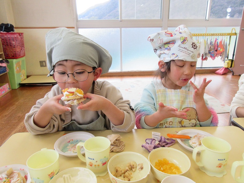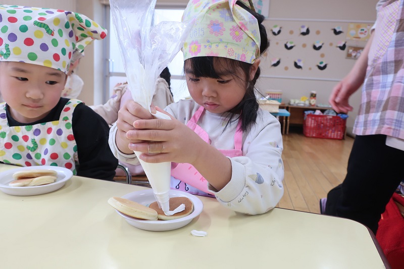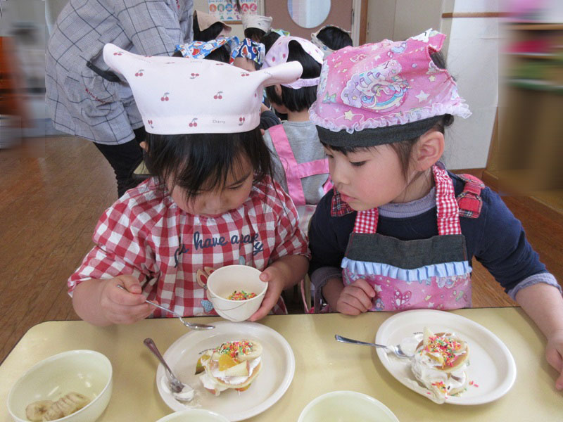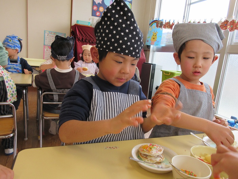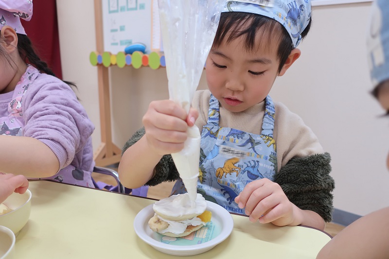 今年度3回目のクッキング♬ 【作り方】 各クラスの様子です( *´艸`) 一枚のホイップクリームをスプーンで好きな量を塗りりんご・バナナ・オレンジを乗せその上からまたホイップクリームを塗ってもう一枚ホットケーキを乗せ、同じようにホイップクリームやフルーツを乗せて最後にカラースプレーをかけました♬りんごを沢山のっけたり、ホイップクリームをたくさんつけたりと自分好みのホットケーキが完成しました(*'▽')からスプレーをのせるときにしっかり順番を守り仲良く乗せることができ、最後に先生がかけるとき沢山かかってとても喜んでいました☆おかわりもたくさんしていました! きりん組は、、、 朝から「ケーキ作るんでしょ~!」と楽しみにしていたきりん組さん!生クリームをたくさん塗って、果物もたくさん乗せておいしそうなオリジナルケーキができあがりました♡出来上がったケーキはみんな揃っていただきますをして食べました!あまりのおいしさにフォークを使わず手で持って食べる子も・・・(笑)「またおうちでもつくるんだ~( *´艸`)」と言っていましたよ!おうちでも作ったらまた感想を教えてくださいね(^^)/ らいおん組は、、、 |