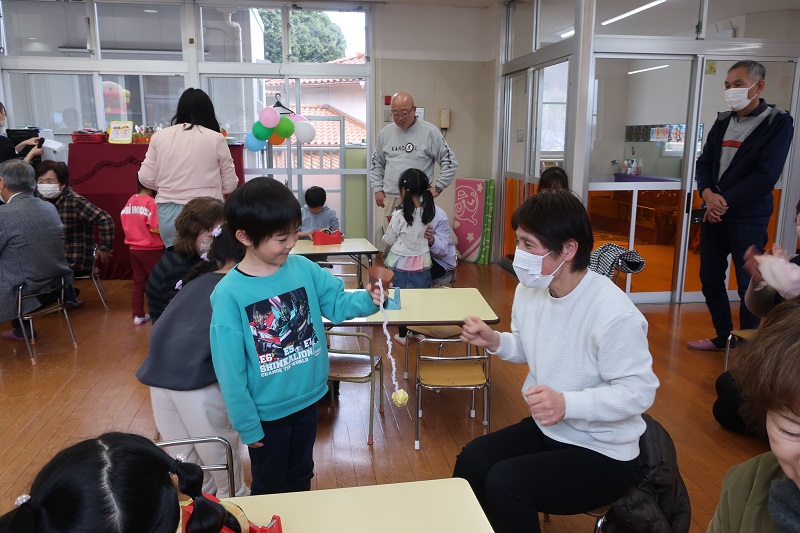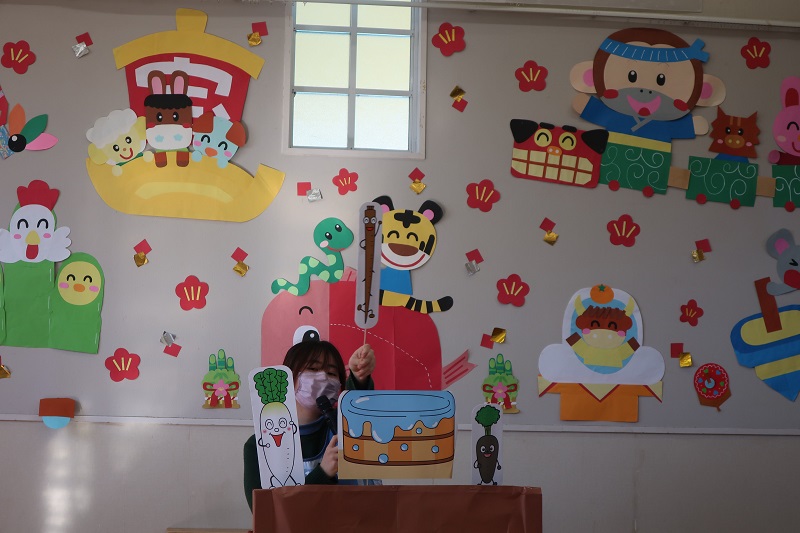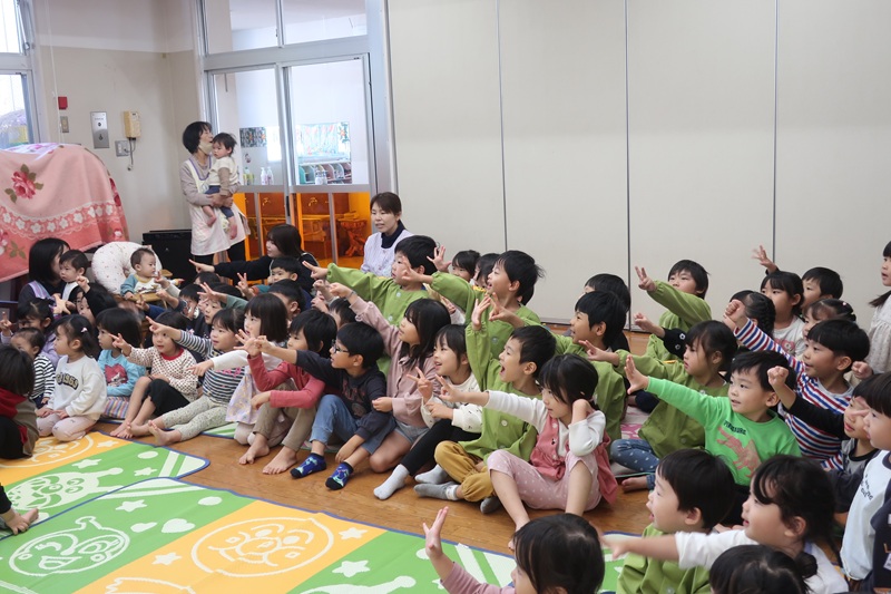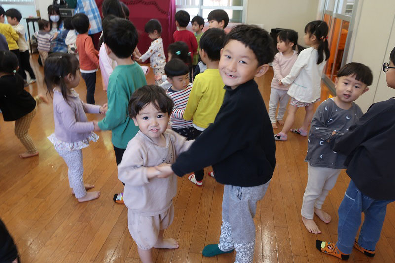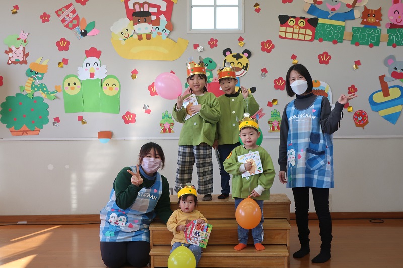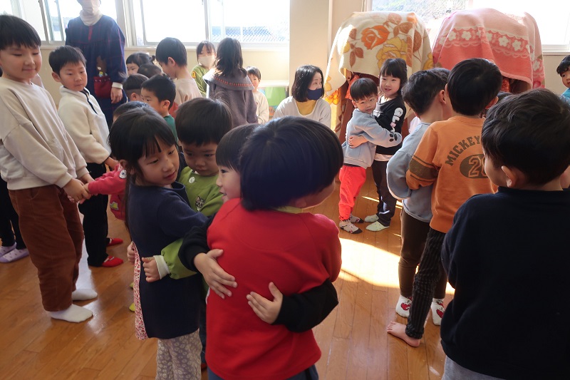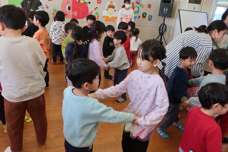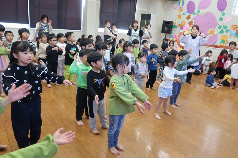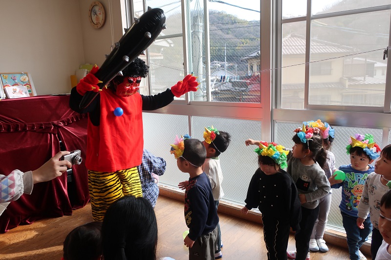 今日は、2月生まれののお友だちのお誕生日会と節分の行事がありました! 2月生まれのお友だちと1月のお誕生日会をお休みしていたお友だちを合わせて11人のお友だちのお祝いをしましたよ(*^▽^*) 大きなクラスも小さなクラスもなりたいものや好きな食べ物を質問すると元気に答えてくれました!! 季節の歌は節分に合わせて『豆まき』と『鬼のパンツ』でした♪ クラスでもよく歌っている歌でみんな大きな声で歌うことができていましたよ(*'▽') 先生からの出し物は『節分のお話』と『はたらくくるま』のパネルシアター!! みんな『へー!そうなんだ!』と先生の出し物を興味津々で見ていましたよ( *´艸`) 出し物が終わると・・ たじりこども園にも鬼さんがやってきました! 豆の代わりにカラーボールで『鬼は外!福は内!』とボールを投げて鬼を退治する子どもたち! みんなのおかげで怖い鬼さんから優しい鬼さんに変わり、仲良く写真を撮る事が出来ました(#^.^#) 泣いてしまうお友だちもいましたが、みんなで頑張って鬼を退治できたので、今年一年も元気に健康にすごせることでしょう( *´艸`) |