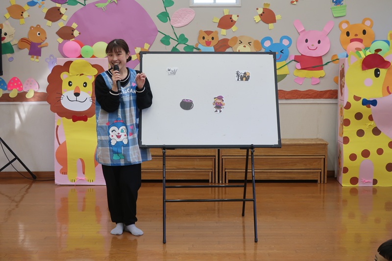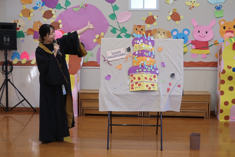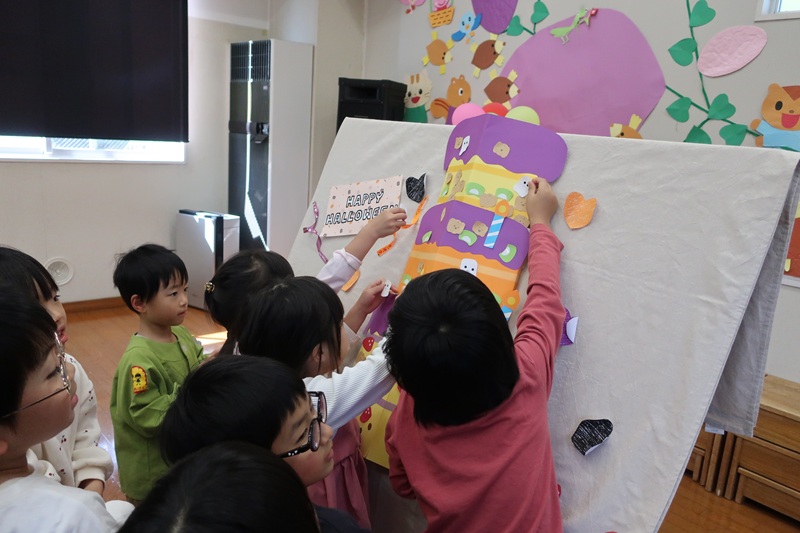 今日は、10月のお誕生日会☆ お誕生日のお友達には、 ・名前 ・何歳になったのか ・大きくなったらなりたいもの(小さいクラスの子は好きな食べ物) を聞きました☆ みんなからおめでとうのお祝いを受けて照れちゃう姿もあったお友だち でした( *´艸`) 今月の季節の歌は、 ・どんぐりころころ ・やきいもグーチーパー の2曲です! みんな元気よくノリノリで歌ってくれましたよ♪ 続いて、先生からの出し物! 拍手をしたり、足踏みをしたり、手をぐるぐると巻いて助けて会えることに成功!!最後は「トリックオアトリート」とみんなで言ってお菓子をみんなに渡すことができました(*^^) |