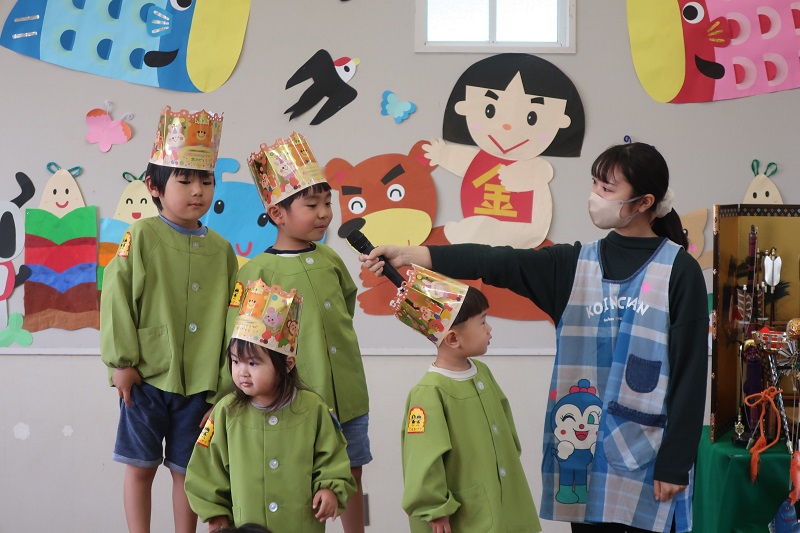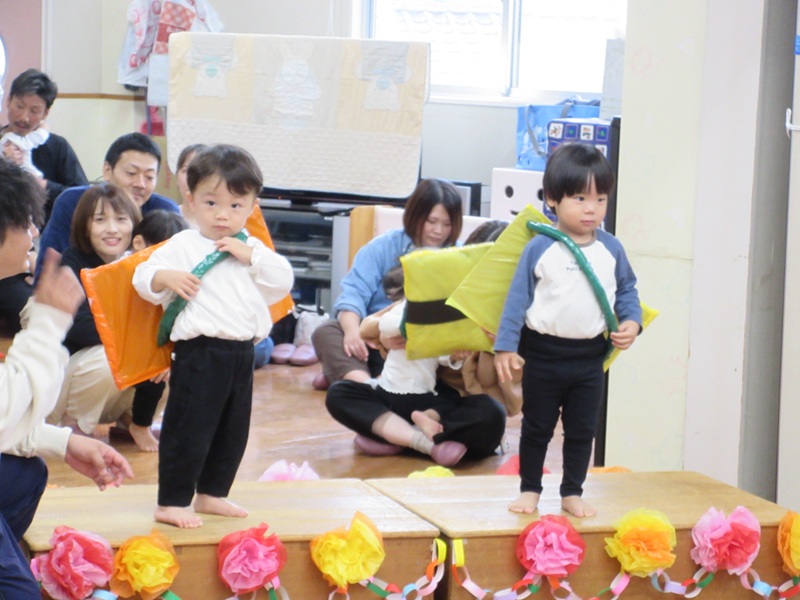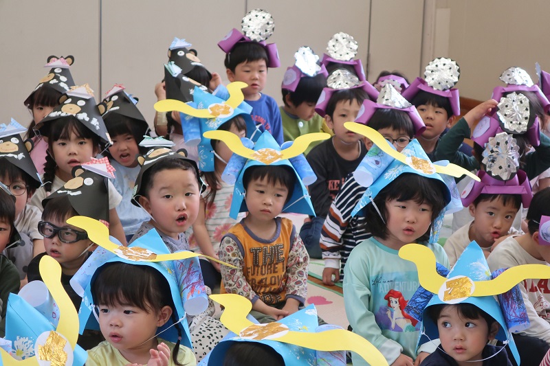 今日は、5月生まれのお友だちのお誕生日会と子どもの日の行事がありました! それぞれのクラスで製作したかっこいい兜をかぶって集合~!! 個性あふれるかわいいカッコイイ兜たちが集まりました(*^^*) こどもの日に向けてこいのぼりも製作したので、誕生日会の前にクラスごとに兜とこいのぼりの紹介をしてもらいました!! ぱんだ組、りす組は先生に説明してもらい、らいおん組、きりん組、ぞう組は前に出て子どもたちにどんな製作をしたのか発表してもらいました(*^^*) 緊張しながらも一生懸命に説明してくれましたよ! 絵の具を使ったり、クレヨンを使ったり、ハサミで切ってみたり、、 色々な製作方法を使ってかわいい兜やこいのぼりが完成したんだね! 今回の5月生まれのお友だちは6人! キラキラの冠をかぶって・・ 名前や何歳になったか、好きな食べ物や大きくなったらなりたいものを聞きました(*^^*) みんなで誕生日の歌を歌ってお祝いしたり、大きな声で『こいのぼり』『おつかいありさん』を歌ったりして、楽しみました♪ 先生からの出し物はパネルシアター二つとみんなで楽しめる体操!! 『こいのぼりのおさんぽ』と『お誕生日会にきたのはだあれ?』というパネルシアターで、みんな夢中になって見入っていましたよ!(*´▽`*) 最後に『じゃんぐるぐるぐる』という体操でジャングルの中のいろいろな出来事をくぐり抜けて、、 5月のお誕生日会はおしまいです(*^^*) 5月生まれのお友だち!お誕生日おめでとう♪ |