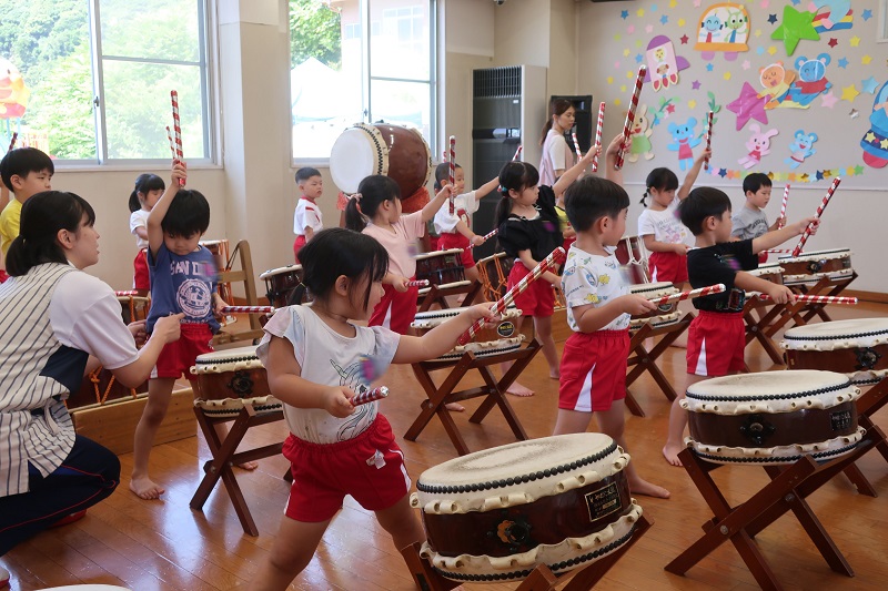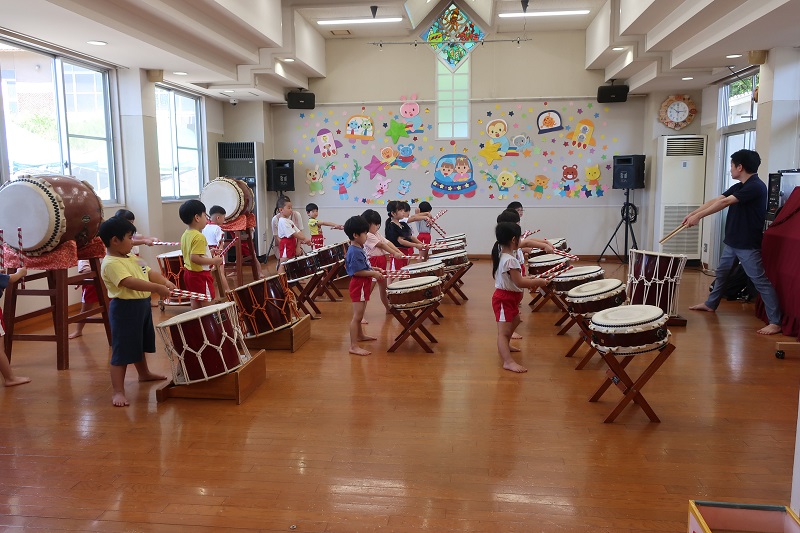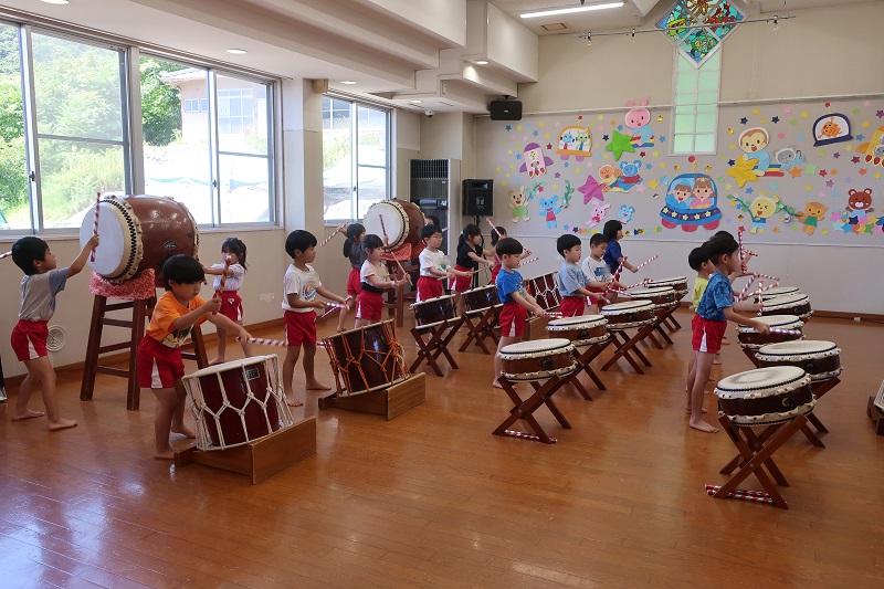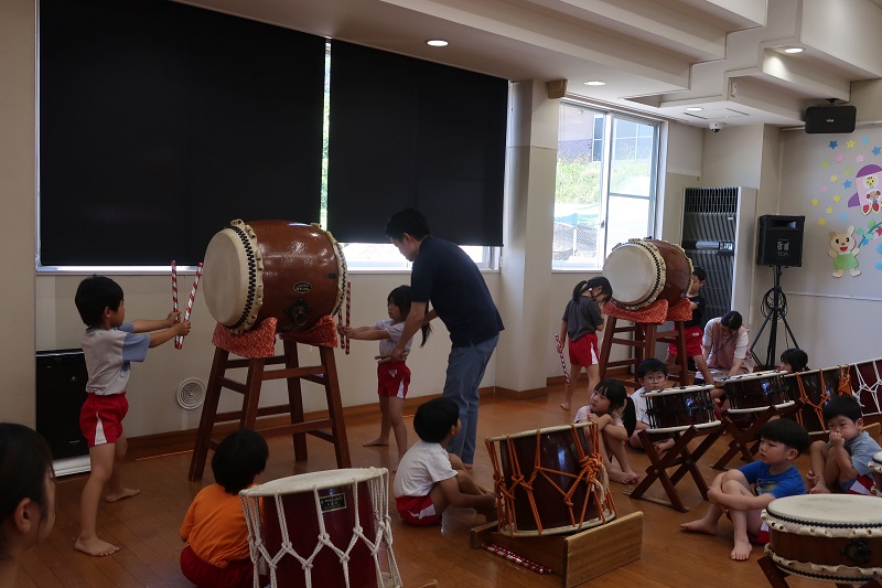 今日は、今年度1回目の和太鼓指導がありました! きりん組、らいおん組それぞれ練習の成果を見ていただき、先生に指導していただきました! 太鼓をしっかり叩くことができるように、股割りの仕方や太鼓の叩き方、基礎的な部分から教えていただきました。 しっかり重心を下げ、身体を支えることができるようにしっかりと足を開き、足の角度も考えること 太鼓の中心で叩けるようにし、腕の高を意識しながら叩くことなど、基礎的な部分を意識しながら叩けるようにし、 まちがいに自分で気づき、直すことができるようにすること 自分だけではなく、周りの音と合わせることを意識すること しっかり集中して話を聞くこと が課題です! きりん組、らいおん組、それぞれ課題がありますが、運動会までに今日教わったことを意識しながら練習し、本番ではカッコイイ姿を見ていただきたいなと思います(*^_^*) これからも子どもたちと一緒に頑張っていきたいと思います♪ |