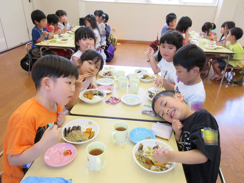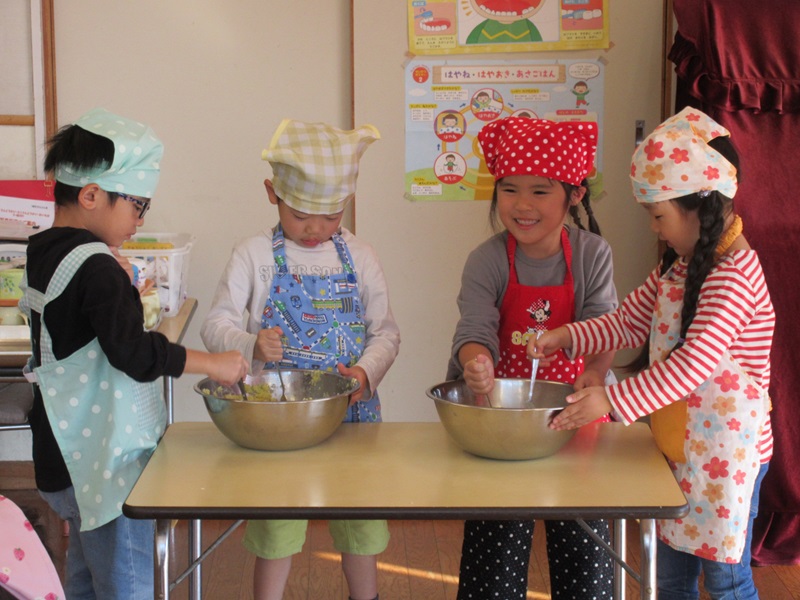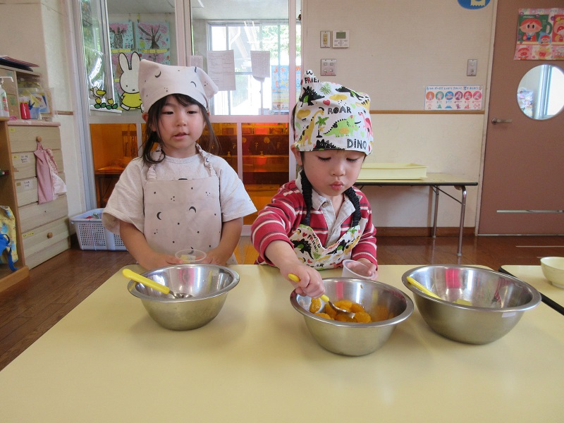 今日は子どもたちが楽しみにしていたクッキングがありました!! 今回クッキングで作ったのは「スイートポテト」です。 材料のさつまいもは先日らいおん組・きりん組が掘った さつまいもを使用しましたよ!! 【スイートポテトの材料】一人分 ・さつまいも・・・50グラム ・砂糖・・・5グラム ・牛乳・・・7.8グラム ・バター…2.5グラム 【スイートポテトの作り方】 ①さつまいもの皮をむいて茹でる。 ②茹でたさつまいもにバター、砂糖、牛乳を入れさつまいもを つぶしながら混ぜる。 ③混ぜ合わせたものをお弁当カップに入れ、オーブンで10分程 焼く。 ④完成♫ ぞう組さんは・・・ きりん組さんとらいおん組さんが掘った さつまいもを使ったクッキング(^^♪ さつまいもをつぶしてると、形が変わっていったり、 美味しそうな匂いがしてきたり、 その中で「小さくなってきたね」「いい匂い~」と 会話を楽しみながらクッキングしました! 自分たちが作ったのでいつもより特別なおやつに、 喜びながら、美味しくいただきました(#^.^#) きりん組さんは・・・ おいもほりでみんなが収穫した らいおん組さんは・・・ きりん組さんと一緒に掘ったさつまいもを使っての クッキング♬ 昨日からとーっても楽しみにしていました(*´▽`*) 給食室でふかしてもらったさつまいもに 牛乳、バター、砂糖を入れてみんなでまぜまぜ~♪ バターを見せるとチーズ?と不思議そうならいおん組さん よく知っているお友だちにバターだよ! と教えてもらいました( *´艸`) みんなで協力して混ぜて、名前の付いた旗を差したら完成~!! 自分たちで作ったおやつは いつも以上にパクパク食べすぐになくなってしまう らいおん組さんでした! 出来上がったスイートポテトは、15時のおやつで美味しくいただき ましたよ(#^.^#) 自分で作ったスイートポテト、「おいしい~!!」と言いながら あっという間に完食でした♪ |