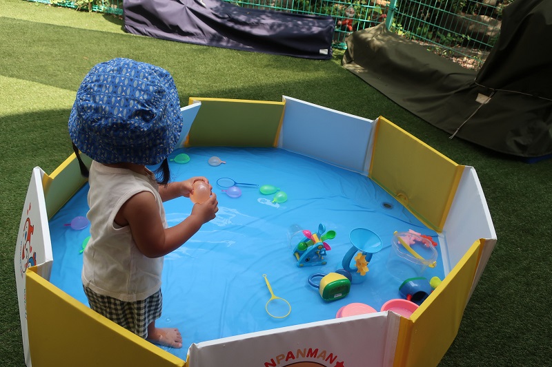 気温が高い日が増えてきて、今年の夏も暑そうですね!! 水分補給をこまめに取りつつ、しっかり食事をとって元気に過ごしていきましょう!! 今日は、中庭で水あそびをしましたよ!! 程よく影になっていて、日差しの心配もなく遊べました♬ プールの中に少しだけ水を入れて、おもちゃや水風船を入れて遊びました! 水温もちょうどよく気持ちよさそうに遊んでいましたよ♪ 来月も園庭開放を予定しています!次回は、『室内サーキットあそび』をしようと 思っていますので動きやすい服装でぜひ!お越しください♪ ご予約お待ちしております(^^♪ |