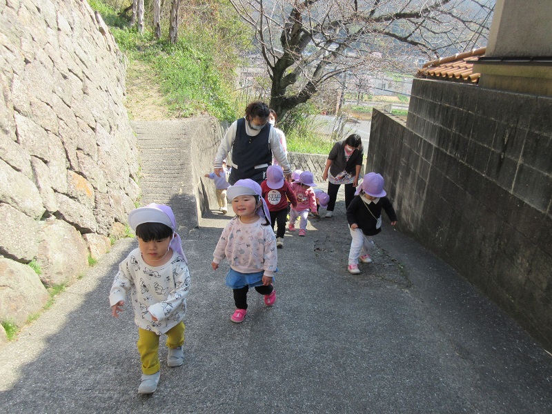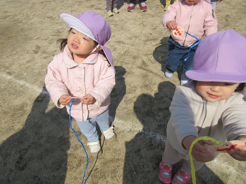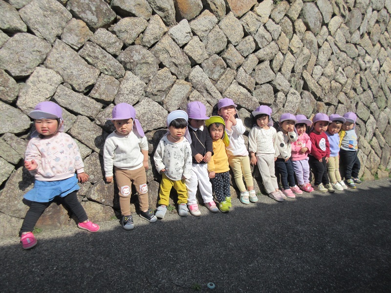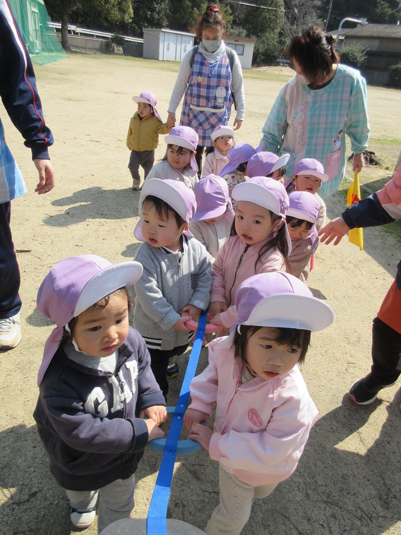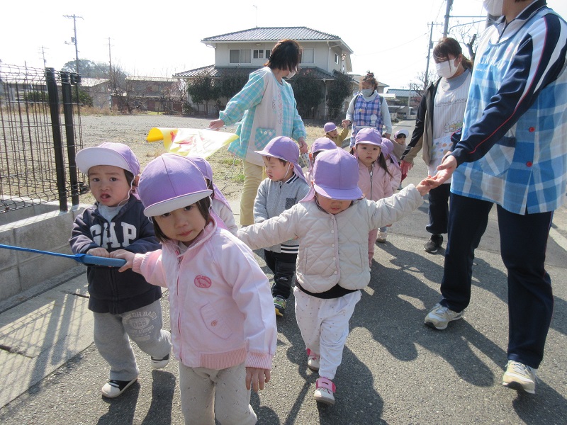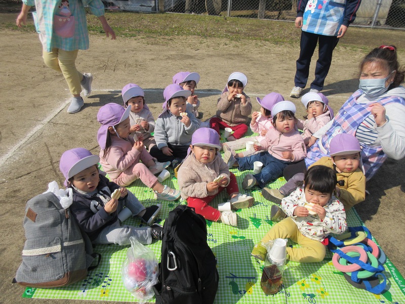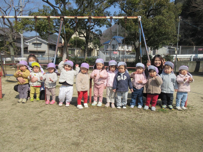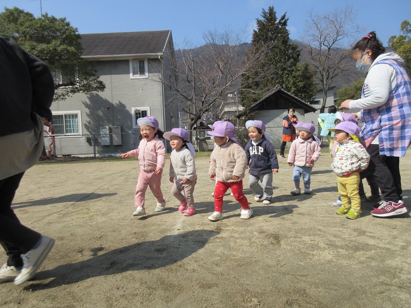 今日は気温も高くポカポカ陽気でお散歩日和✨ 楽しみにしていた、おもいで散歩に行ってきましたよ! 今年度のりすぐみさんにとっては一番長い距離のお散歩です! リングひもを持って「レッツゴー!」 杏の木にお花が咲いていたり、スイセンのお花を見つけたりと、 春を沢山感じながら歩きました❁ ショベルカーに清掃車、ダンプカーにバス…など、 大好きなはたらく車にもたくさん会えましたよ(*´▽`*) 公園についたらレジャーシートに座っておやつタイム♩ 外でいただくおやつの美味しい事♡ 口の周りにたくさんつけておいしそうに頬張っていました( *´艸`) ひと休みした後は、アンパンマンしっぽ取りをしてあそびましたよ。 しっぽにみんなが大好きなアンパンマンがついているので、 「まてまてー!」とGETしようとたくさん走った子どもたちです! 帰り道はちょっぴりお疲れモードでしたが、 最後まで頑張って歩いて帰ってきてくれました。 出発から1時間半の長旅でしたが、たくさん歩けるようになった子どもたちの成長を感じましたよ♡ |