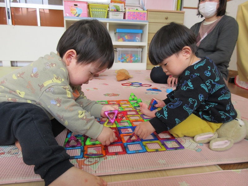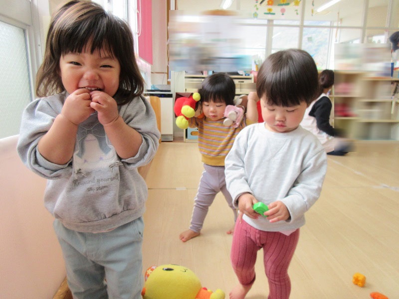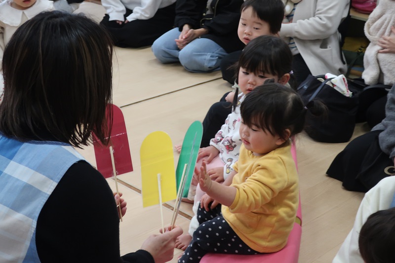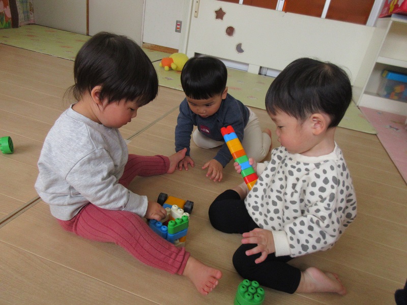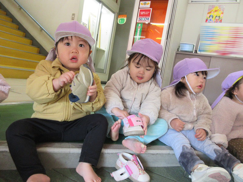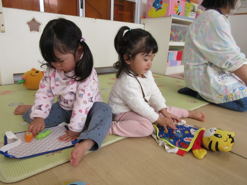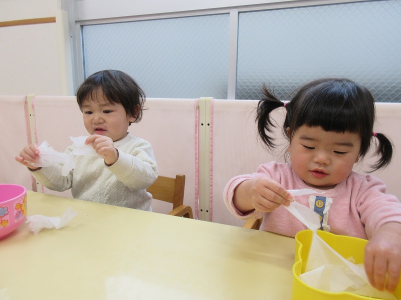 毎日寒い日が続きますね☃ 日中雪が降るときもありますが、いつも降るのは子どもたちのお昼寝タイムで・・・せっかくだから降る雪を見せてあげたいなぁと思っている先生たちです( *´艸`) 今週は気温が低くなかなか外遊びができないので、お部屋でも楽しく過ごせるようにしていますよ♬ ひな飾り作りがスタート☆ 「これなぁに?」と折り紙をジーっと見つめて、お花柄を「かわいい♡」と言ってくれる子もいましたよ(*´▽`*) 初めての折り紙は「はんぶんこ~」と半分に折ってお雛様とお内裏様の着物にしました♬ 折り目は「ヨシヨシ♡」と指で優しくこすってくれましたよ。 かわいいひなかざりができそうで楽しみです♩ ボールハウスやパラバルーン、サーキットなどお部屋の中でも身体を動かしながら楽しめる事をして元気に過ごしているりすぐみさん! お友だちと一緒に遊ぶおもしろさをしっかり感じられるようになってきて、何をやっても一緒に大はしゃぎですよ(*´▽`*)♬ ぱんだ組さんへ向けての準備で、朝の支度も少しずつ始めています! タオルを掛けたり、おしぼりを3つのかごに分けていれたりと、経験を重ねていくと上手にできるようになっています♡ やる気がいっぱいあるので何でも楽しんでしてくれる子どもたちですよ(^-^) |