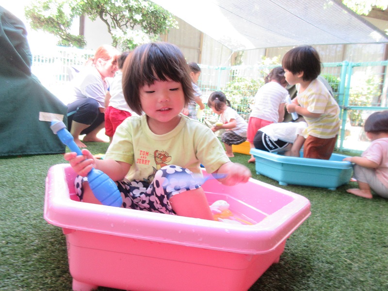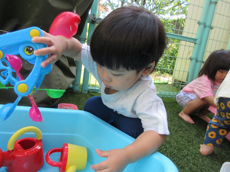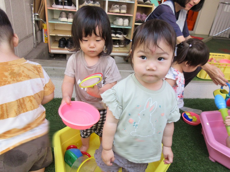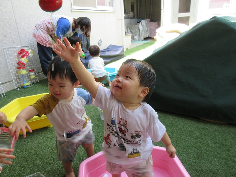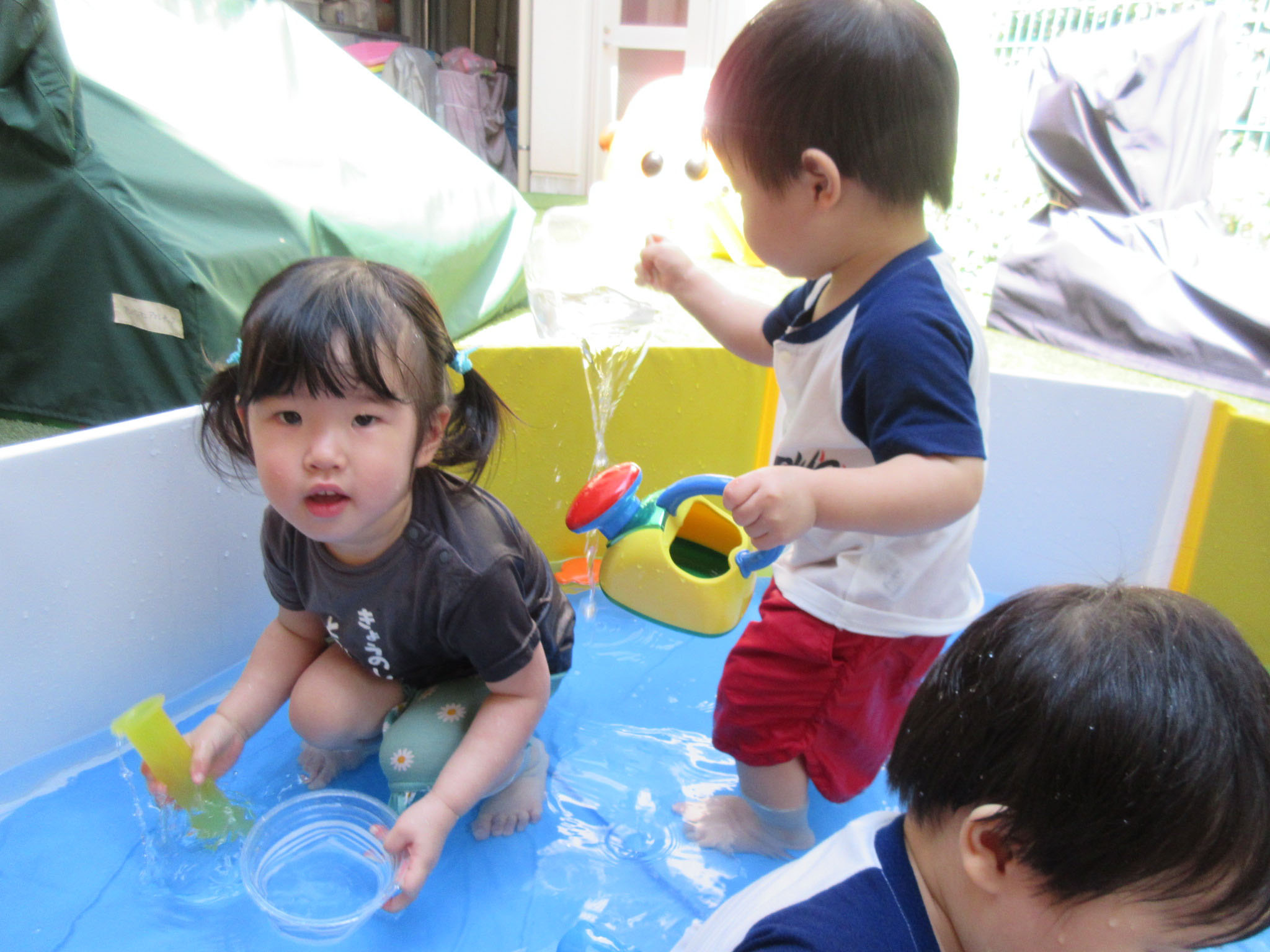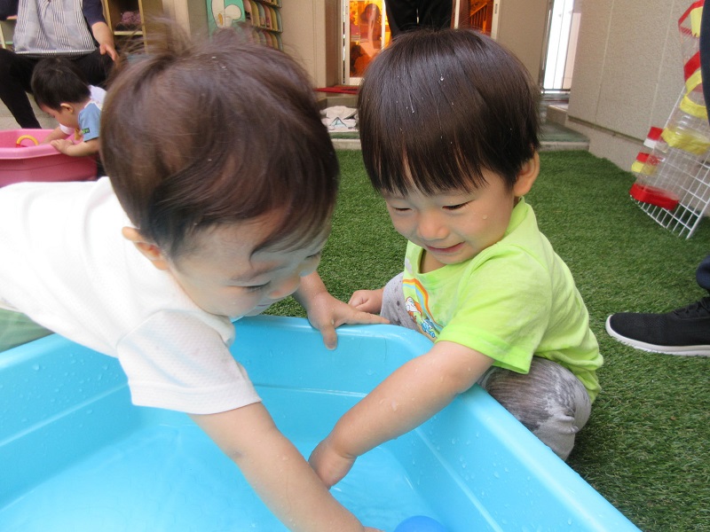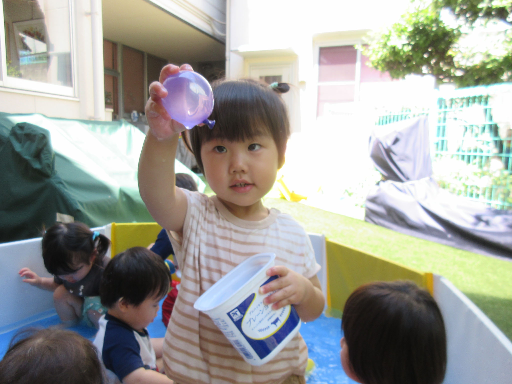 今日は、中庭で水遊びをしました♪ 「水あそびするよ♬」の声かけでみんな嬉しそうな表情を浮かべていました!水あそびの服に着替える時からソワソワ・ワクワク!!早く行きたいよー!!と言っているようでした(*'▽') 水あそびの遊び方を説明して『レッツゴー!』の合図でタライに一直線!!じょうろやカップに水を入れて上からかけてみるととても気持ちよさそうな表情をしていました。水風船にも触れてもみもみと完食を楽しんでいました!水風船が割れてビックリ…。でも先生の「大丈夫だよ」「見て見てこんな玩具もあるよ」の一声で安心していました。寒天遊びや水風船遊びなど色々なおもちゃを用意してこれからも水遊びを楽しんでいきたいと思います!! |