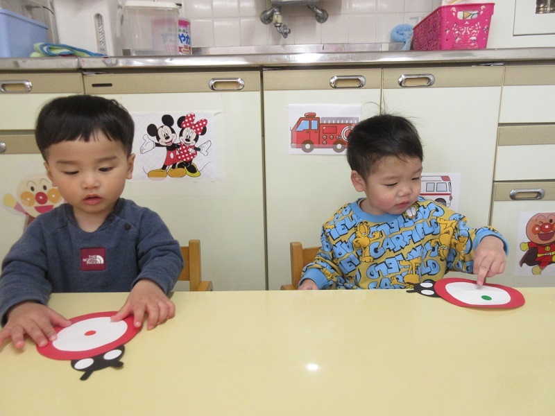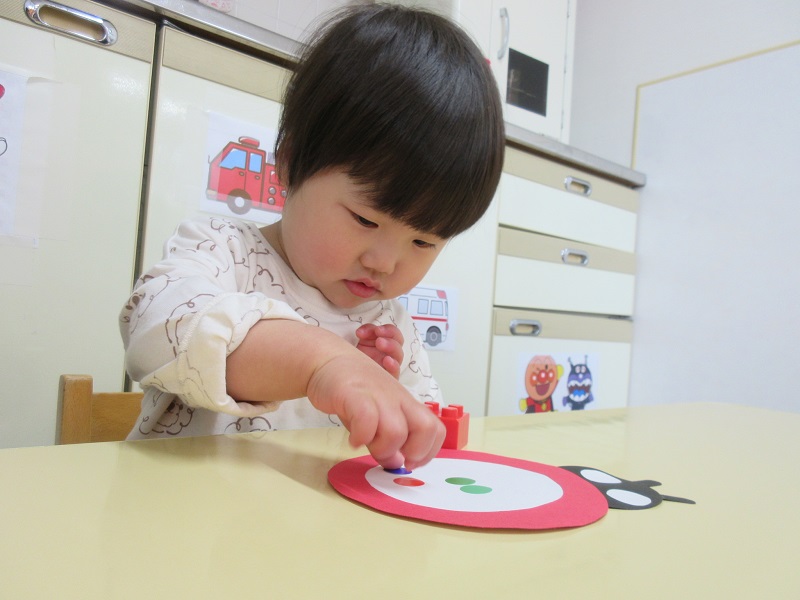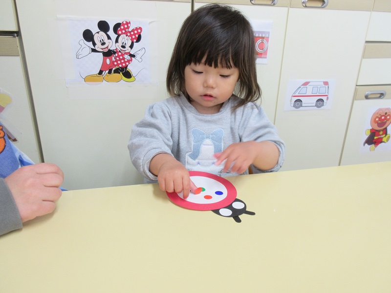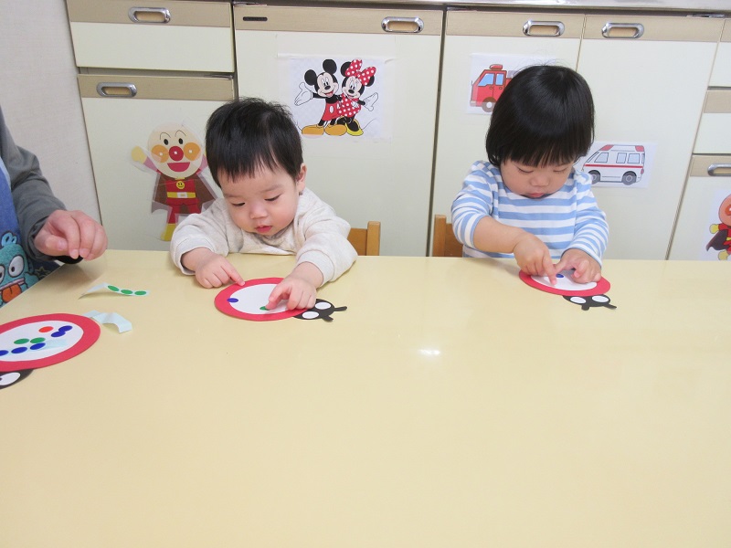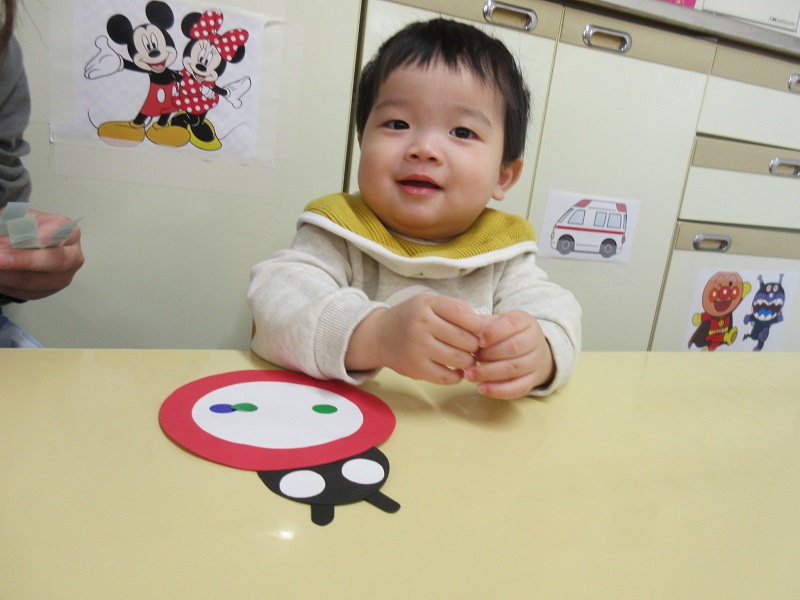 今日は、4月壁面のてんとう虫のカラダにシールで模様をつけて最後に目を作りました♬ シールを見て「これは何だろう?」と不思議そうに見つめたり、真剣な表情で貼ったり、シール貼りは得意だ!と得意げに貼ったりといろいろな姿が見られました。 「できた!!」と先生に見せてくれたり自分で拍手もし楽しんでいました! とってもかわいいてんとう虫が完成しました(*'▽') 今月は後、こいのぼり、兜、5月の壁面とたくさんの製作活動があります!! |