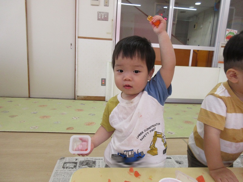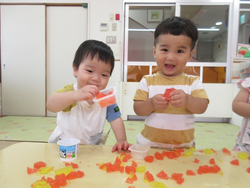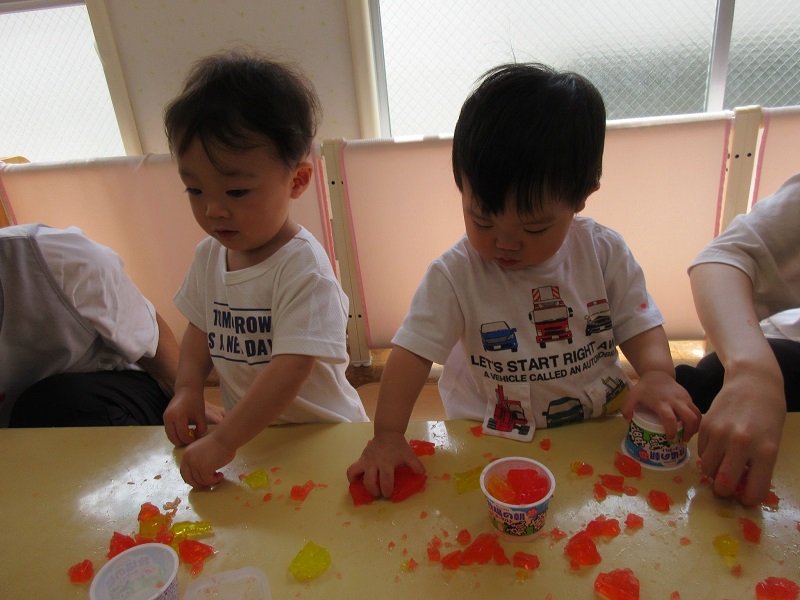 今日は、寒天遊びをしました! 前回、初めて寒天遊びをした時はまだ慣れておらず、腰が引けていたり片手のみで触れていたりあまり触れる事ができなかったりの子もいましたが今回は、「もういいよ!」「レッツゴー!」の合図でみんな嬉しそうに触り、ダイナミックに遊んでいました(笑) 赤色・黄色・オレンジ色3色を用意して順番に出していくと、みんな大喜びで「わあ♡」と声をあげながら寒天を手に取り、カップに入れたり出したり、違うカップに移し替えたりしながら遊んでいましたよ♬握りしめて細かくする遊びにもハマり、全身で楽しんでいました(笑) 水遊びもみんな大好きで水遊びをするよと声をかけると目の色が変わったりしてとてもかわいいです(*'▽')水遊びでも少し違ったおもちゃを出してみたり、プールあそびもあるので夏ならではの遊びを一緒に楽しみたいと思います♬ |