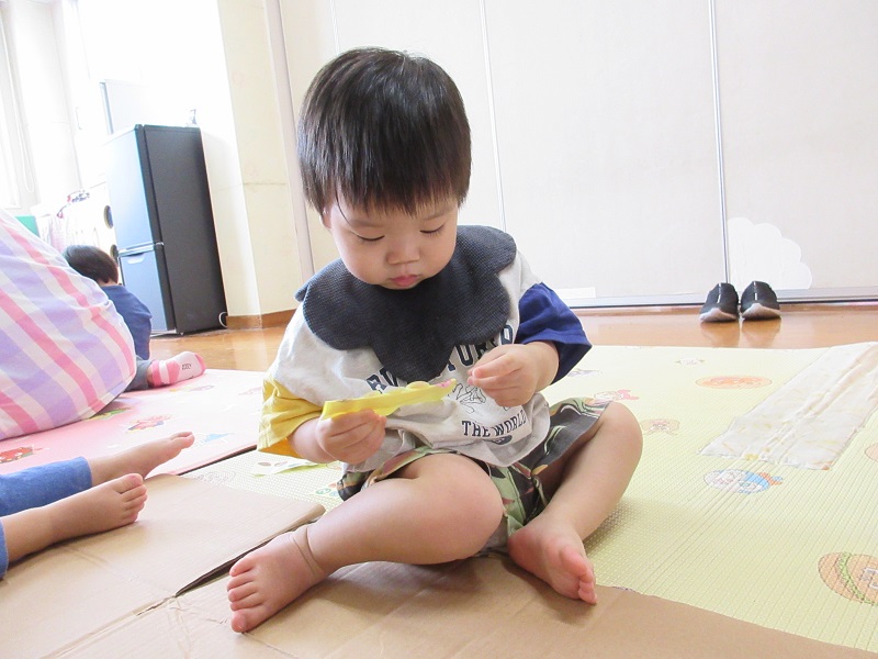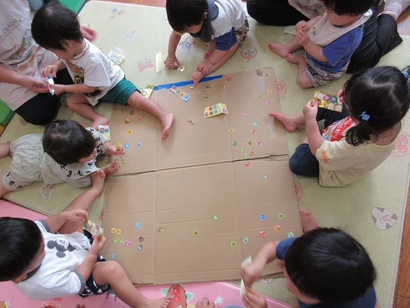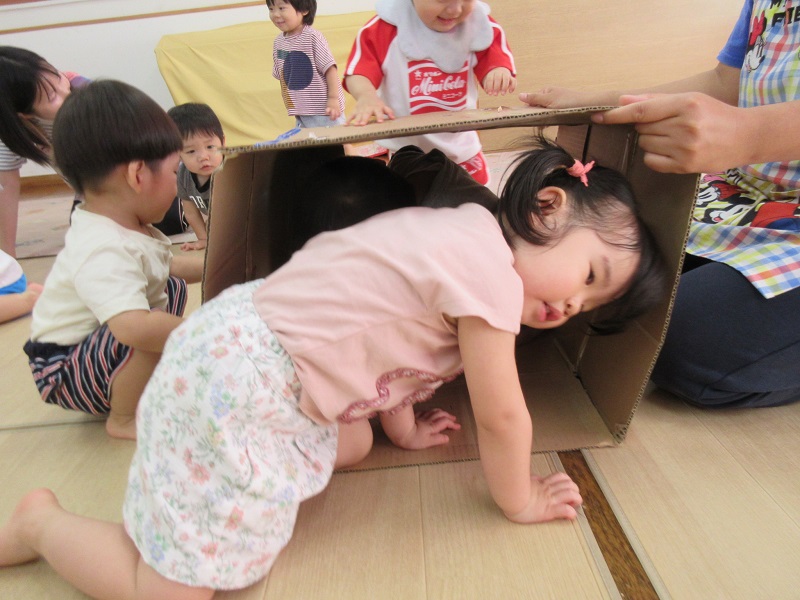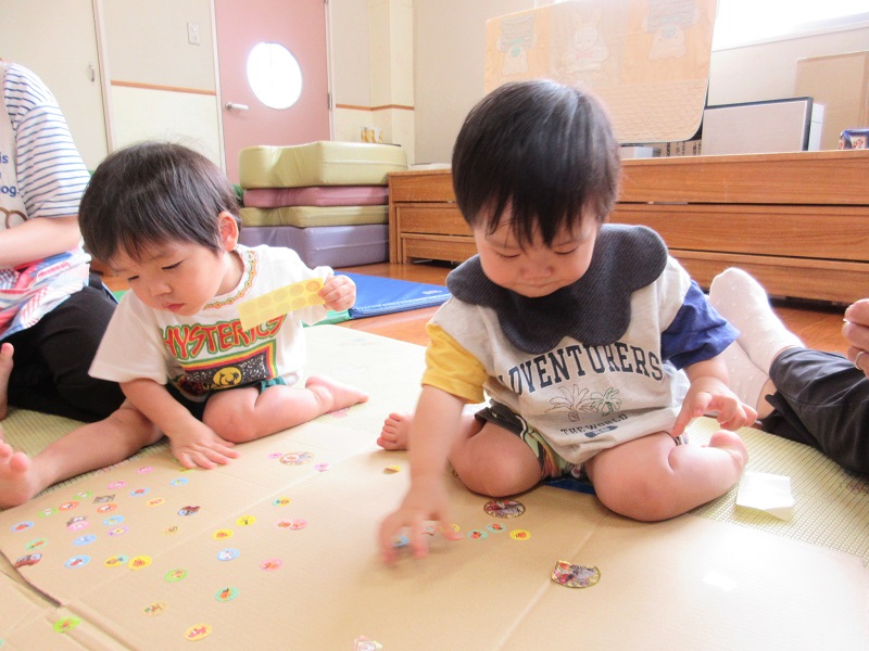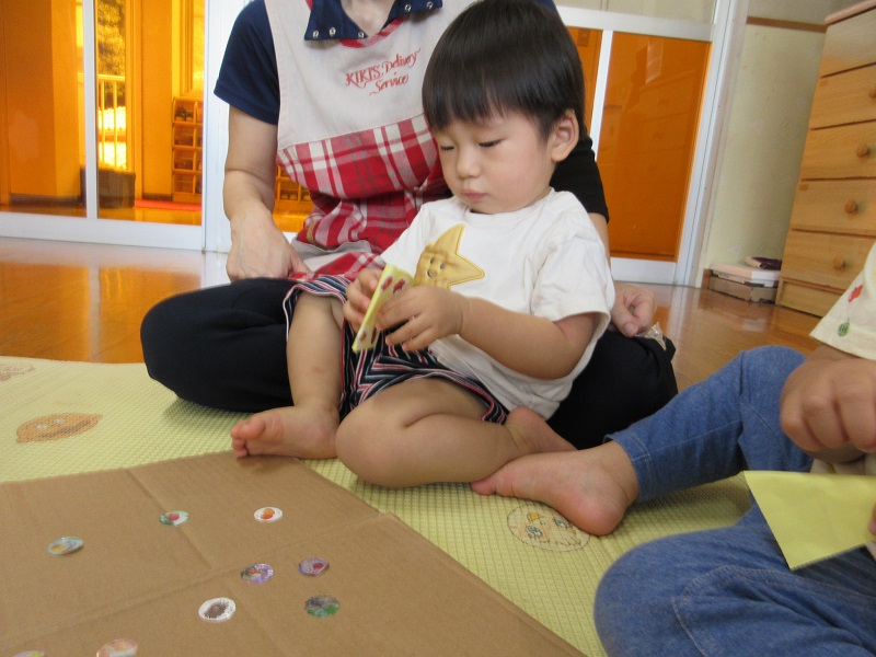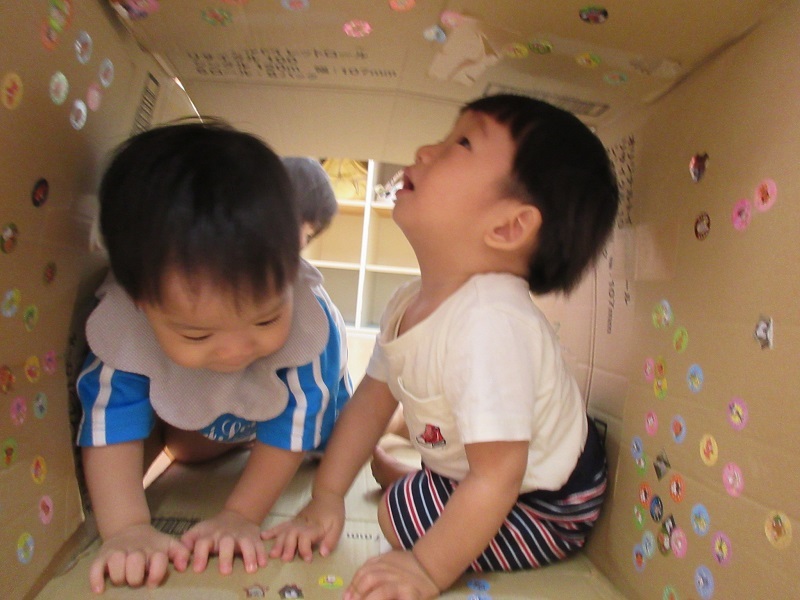今日は、画用紙ではなく大きな段ボールにシール貼りをしてみました(*^-^*) アンパンマンのシールや食べ物のシールなどたくさんの種類のシールを用意して子どもたちに段ボールとシールを渡すと嬉しそうに貼っていました!いつもと違った遊びでとても楽しんでいました!ノールックで貼ってみたり自分のズボンに貼ってみたり、マットに貼ってみたり…。自分で剥がせるようにもなったり、なくなると先生に渡して新しい紙をもらおうとしたりと子どもたちの成長も感じられました☆ みんなで貼って装飾をした段ボールをトンネルにして遊んでみましたよ♬二人同時に入ろうとしたり、逆走したりとハプニングも起きましたがみんな楽しく繰り返しトンネルを通っていました(*^-^*) 次回はトンネルを通っている姿をupしようと思いますのでお楽しみに~!!(*'▽') |