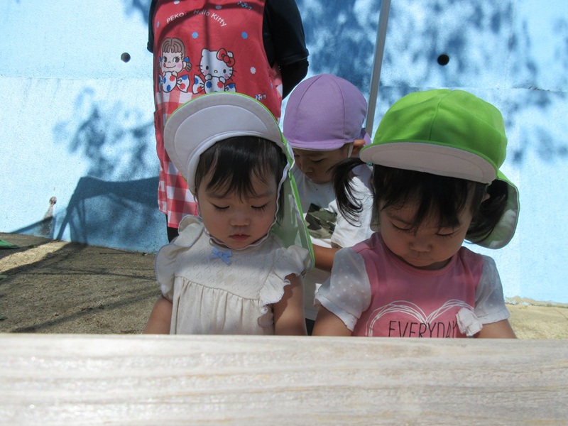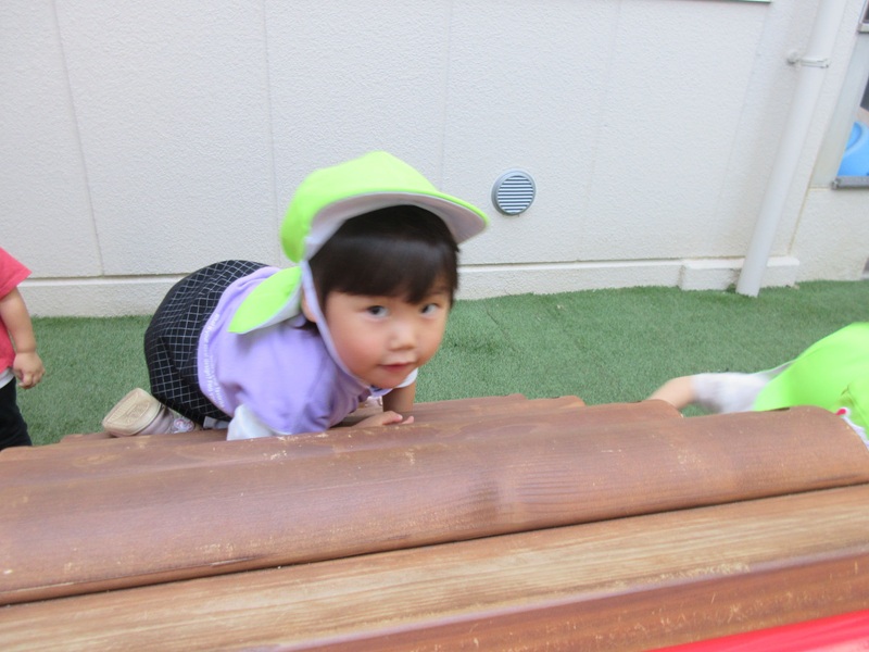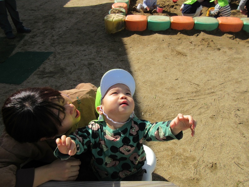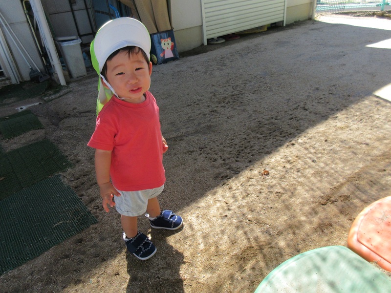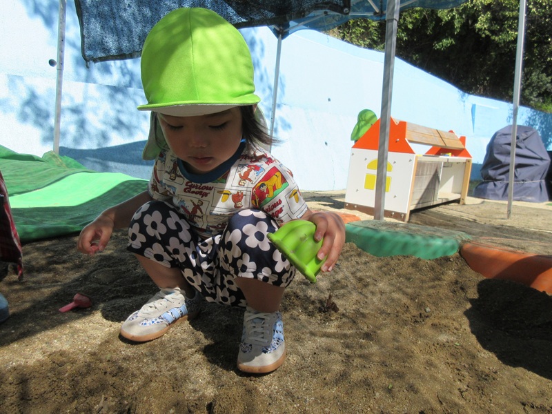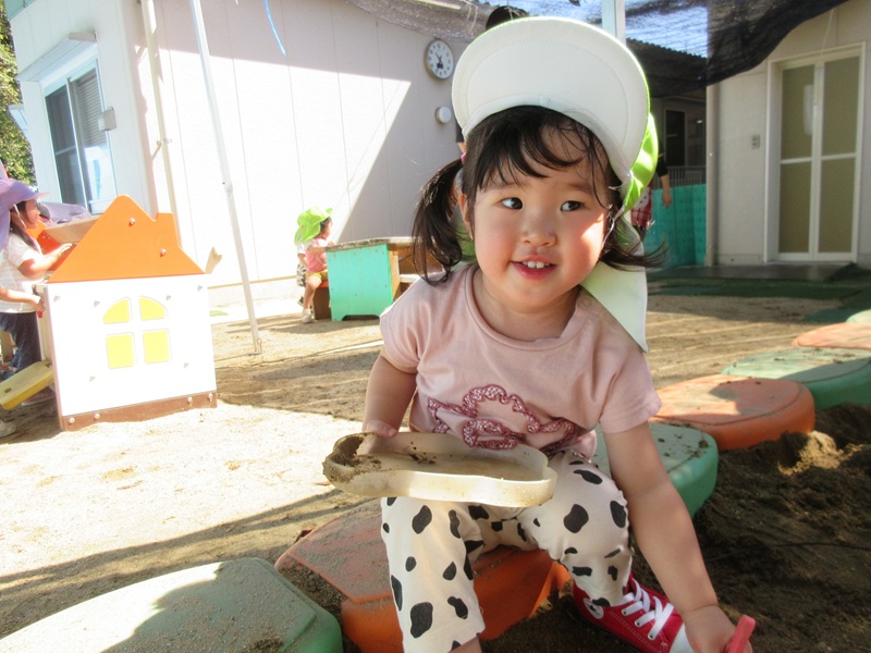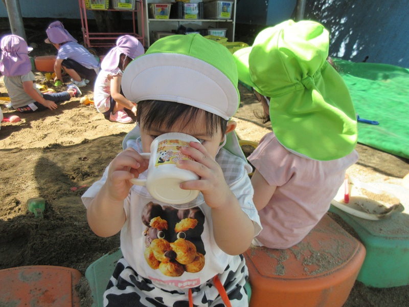 今日は、砂場で遊びました~! 砂場に行くときは、階段を登っていきます!お約束として、「先生と手を繋いで手すりを持ってゆっくり登る」ことを伝えています。抱っこで階段を上がっていた子も歩いて自分の力で登る事ができるようになりました☆ 階段を登ると自分の靴を探し、自分で履こうと頑張っています!みんなどれが自分の靴か分かるようになりました!季節の歌を歌を歌いながら履いています。今月は「どんぐりころころ」「大きな栗の木の下で」を歌っています♬ 型抜きをしたり、山を作ったり、キッチンに立って料理を作ったりと自分の好きな物を見つけ楽しんでいます(^▽^)ぱんだ組のお兄ちゃん、お姉ちゃんとも仲良く遊んでいます! 砂場遊びだけでなく、砂場の回りを歩いて散歩したりアンパンマン遊具で遊んでいるお兄ちゃん、お姉ちゃんを見たりもしていますよ♬ 水分補給もしっかりしていますよ☆ |