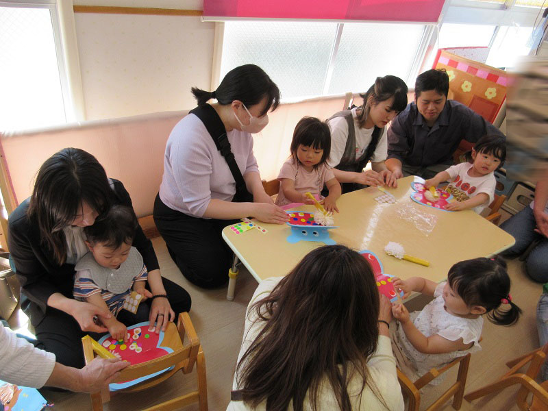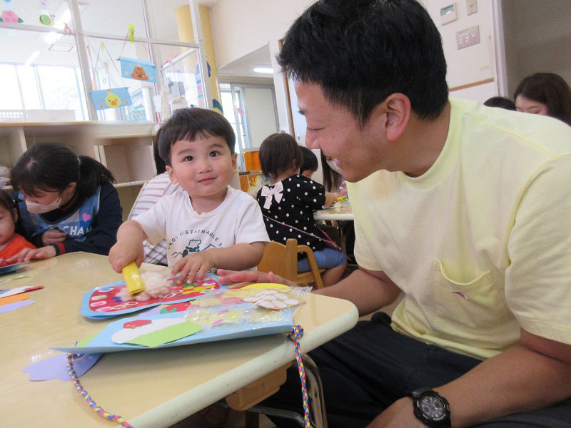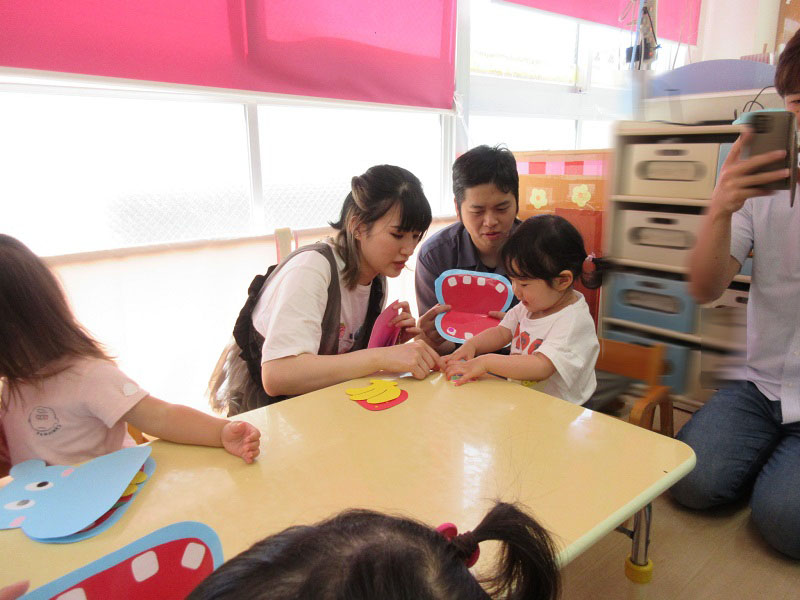 今日は初めての参観日でした(*^-^*) まずは朝の会で朝のお歌・季節の歌のかえるのうた、でんでんむしを歌いました!順番に名前をお返事をする時は、少し恥ずかしそうにしていたり、普段通り手を挙げて答える姿も見られました☆「はーい♬」とお返事した後は先生とハイタッチもしましたね! 今日6月4日は「虫歯予防デー」ということでカバさんにご飯「ポテト・キャンディー・きゅうり・いちご・バナナ・ケーキ」を食べさせてあげて食べ物の色のシールを貼り、歯磨きをしてカバさんの歯をきれいにしてあげましたね!集中してシールを貼っていて楽しんでいましたね! 最後は親子でふれあい遊びをしました!ぱん屋さんにお買い物に行くのに「ばすにのって」を歌いながら行きました♪みんなでゴーゴー!と言ったり、3・2・1とカウントダウンもしてパン屋についてからは「ぱんやさんにおかいもの」を歌いながらパンを買って帰りも「ばすにのって」を歌いながら帰りました♪ 本日は、お忙しい中保育参観に来ていただきありがとうございました。お家でもシール貼りや歯磨きをしてみてくださいね~(*^-^*) |