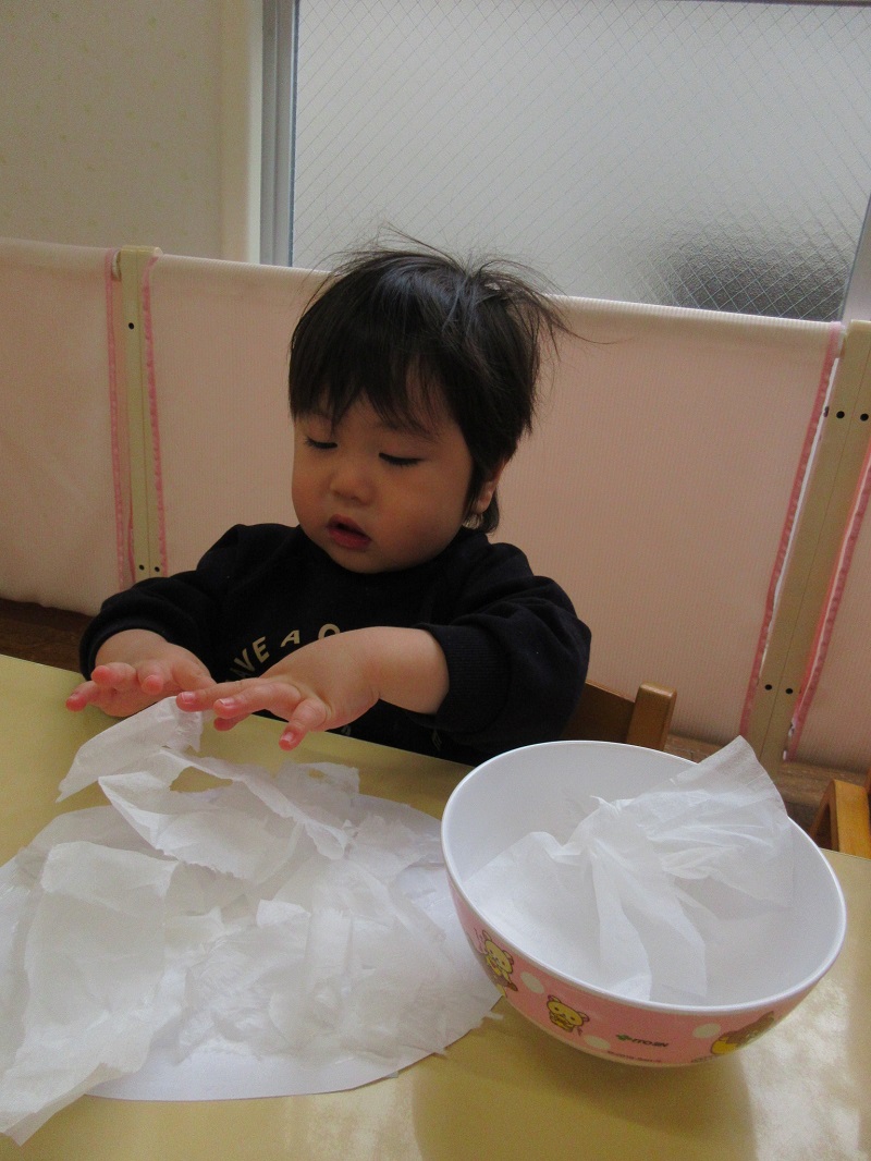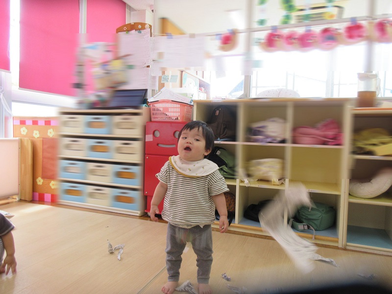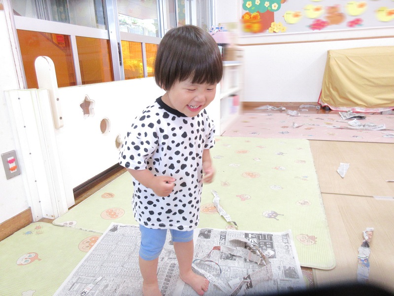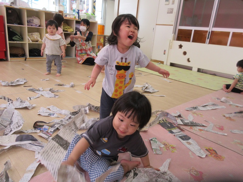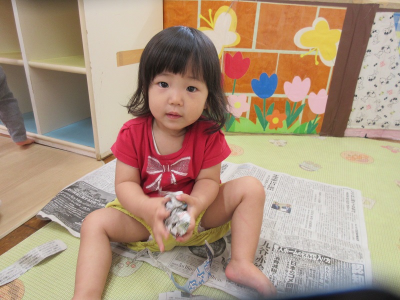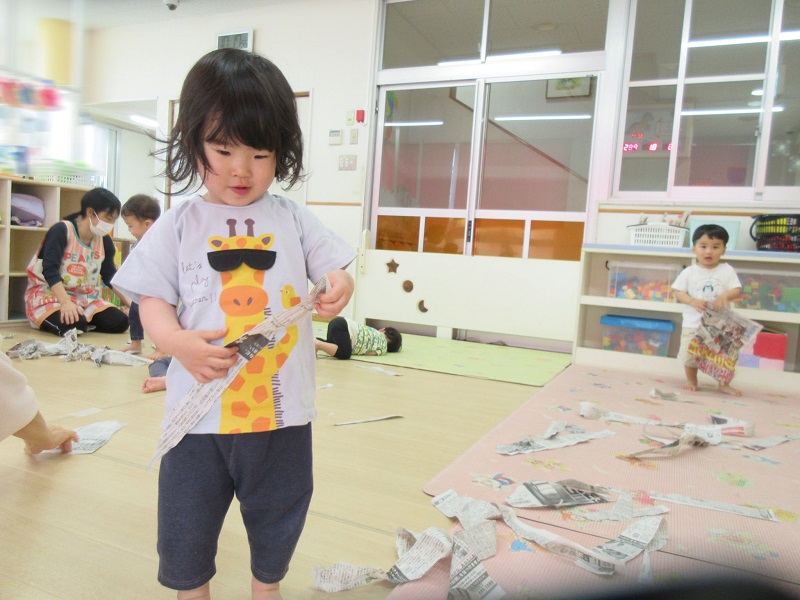 今日のりす組さんは新聞紙遊びをしましたよ~!! 上手にちぎったり丸めたり、投げてみたりと楽しんでいました! カゴを用意して新聞紙をたくさん集めて丸めて玉入れもしてみました(*'▽')上手く入らないと残念そうな顔をしたり、入ると拍手をしてとても嬉しそうに笑顔だったりと表情もとても豊かでした。上手く入らなくても諦めずに入るまで何度も繰り返し挑戦していました! ブロック遊びやシール遊びなどでもハマらなかったり取れなかったりするとすぐに諦めていた友だちも何度も挑戦したり、先生に手伝ってと言えるようになったりとどんどんできる事も増えてきていますよ♬ |