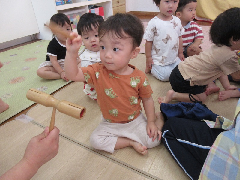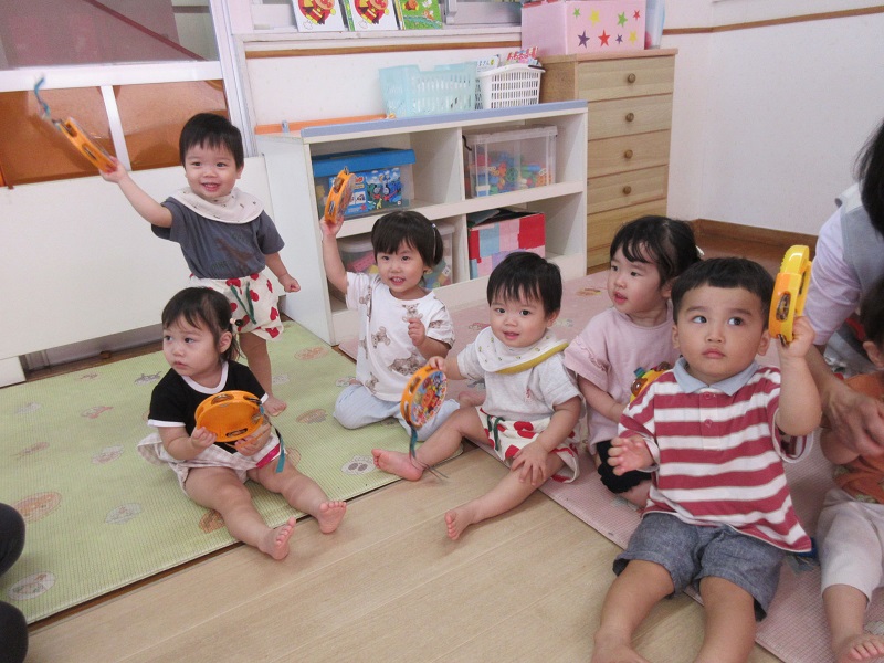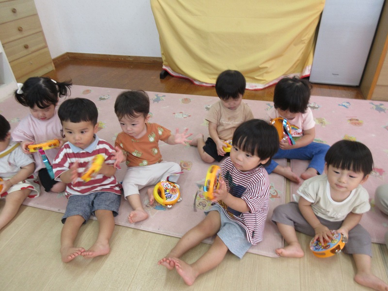 今月はプール開きがありました♪ みんな大好きで「水バシャバシャしに行こう!」と声をかけると嬉しそうに駆け寄ってきてくれます!水遊び用の服に着替えるとまだかなまだかなと外を眺めています(*'▽') アンパンマンのプールを見つけるとアンパン♪アンパン♪と言いながら向かっています!!浮かぶおもちゃや金魚すくい、水鉄砲にジョーロなどたくさんの玩具があって毎日目を輝かせています(*^^)最近は、スポンジや水風船など変わった玩具を出して遊んでいます。 水遊びやプールあそびの他にも楽器にも触れてみました。タンブリン・ウッドブロック・カスタネット・トライアングルの4個の楽器を鳴らしてみましたよ♬タンブリンでおもちゃのチャチャチャを演奏して楽しんでいました!他の楽器は一人ずつ順番に鳴らしました。みんな上手に座って順番を待つことができました☆みんな楽しく演奏していたのでまた出してみようと思います(#^.^#) |