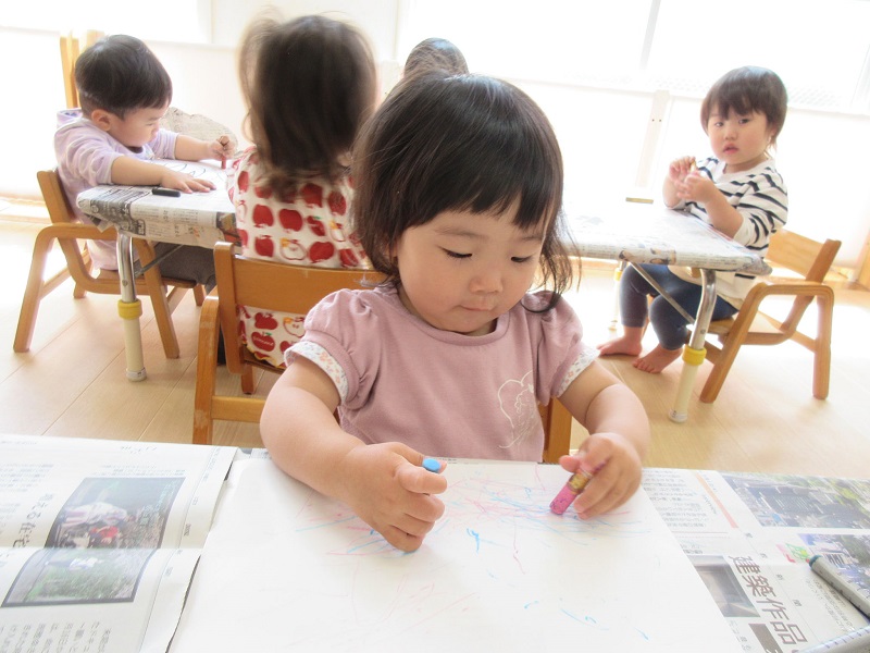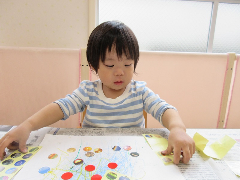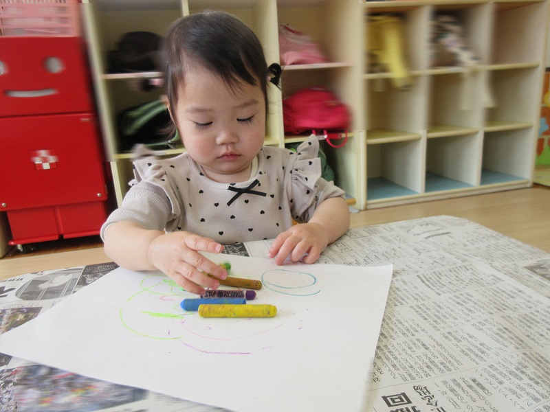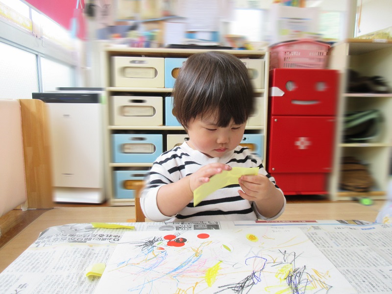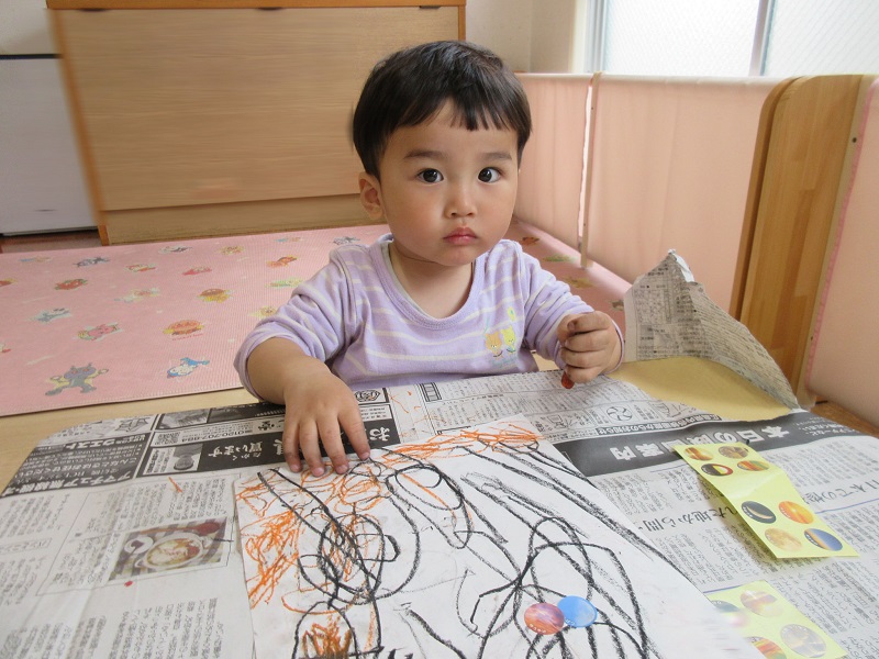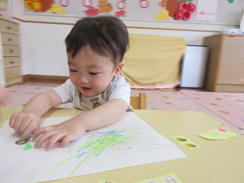りす組さんになって初めてお絵描きをしました! クレヨンを見ると嬉しそうに持ち、描き始める子もいれば始めて見るクレヨンに少し警戒している様子の子もいました。一緒に持って描き始めると楽しさが分かり自分で持って自由に描き始めていました♪ 決まった色を持って塗ってみたり、色々な色を持って見たりしながら初めてのお絵描きを楽しんでいましたよ! シールを渡してみるととても喜び、自分で上手に剥がしながら好きな所に貼っていました!重ならないように貼ったり、同じ所に何枚も重ねて貼ったりと個性あふれる作品が完成しました!!自分で剥がせなかった友だちや上手く貼れなかった友だちもだんだんと上手になって自分で貼れるようになりました(*'▽') 持ち帰っているのでぜひ、見てみてください。 |