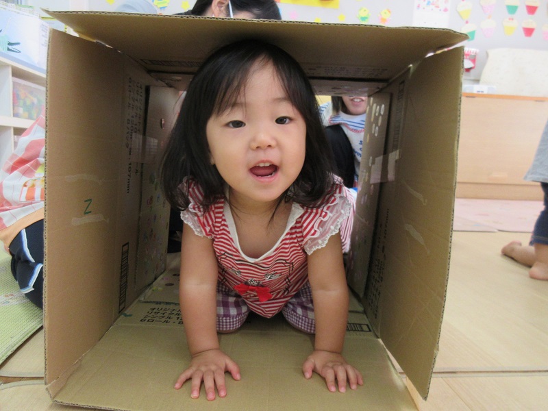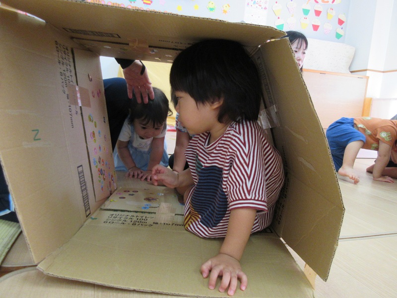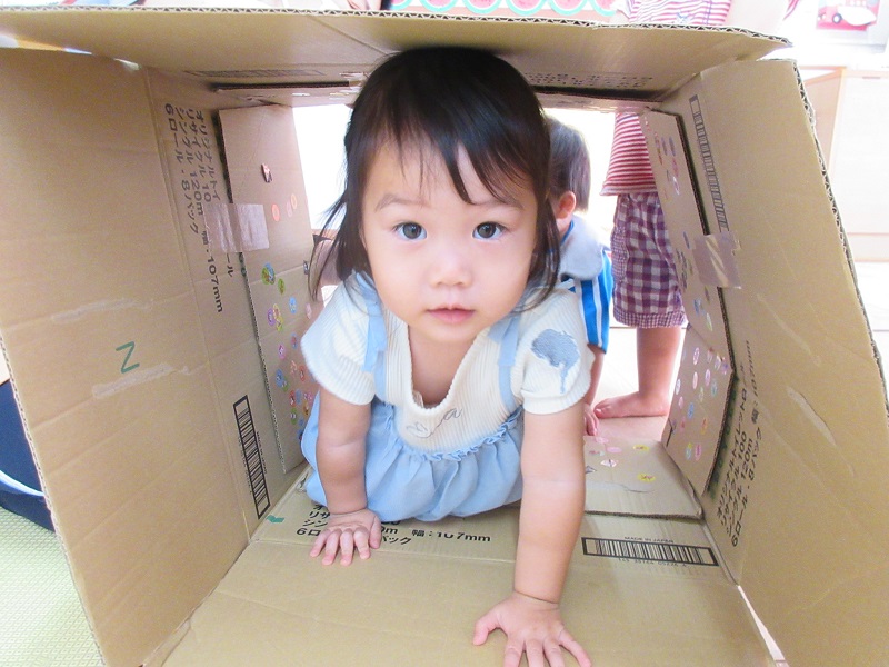 今日は、みんなでシール貼りをした段ボールでトンネルを作ってあそびました!! トンネルが完成すると大喜びのりす組さん!順番を守ること、先生がいる側からくぐることのお約束ごとを伝え、守りながら楽しく繰り返しくぐっていました♪ みんなでシールを貼ったことを覚えており、シールに興味深々で真剣な顔で眺めていました!「これはぼくが貼ったやつかな?」「アンパンマンだあ!」と一生懸命伝える姿がとてもかわいかったです♡ 素早くくぐってみたり、なかで休憩しながらくぐってみたりと自分なりに楽しみ方を見つけて遊んでいましたよ♬「こっちおいで」と声をかけると満面の笑みで向かってきてくれたのでとても癒されました。みんな楽しんでくぐってくれていたので普通のトンネルでも遊んでみようと思います!! |