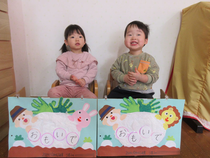 あっという間に3月になり、りす組で過ごすのも残り3週間程となりました。 今日は、思い出帳の表紙が完成したのでみんなで写真を撮りましたよ♬ 一年間、様々な製作活動をして完成していった作品たち♡ 貼ったり、剥がしたり、ちぎったり、描いたり・・・と手指が上手に動かせるようになり、製作が大好きな子どもたちは、いつも楽しく取り組んでくれました♡ そんな思い出がいっぱい詰まった思い出帳の表紙は、発表会でした「おおきなかぶ」を作りましたよ☆ 演じた役の動物の顔を貼ったり、かぶはティッシュを貼って立体に☆かぶの葉っぱはかわいい手形葉っぱになりました(*´▽`*) 一年間の思い出が飛び出してきそうな作品ができてみんなニコニコです♡ 持ち帰る日をお楽しみに~♬ 最近は、ごっこあそびが大好きな子どもたち☆ お医者さんごっこにお世話ごっこと、大忙しに楽しんでいますよ! 残りのりすぐみでの日々も子どもたちと笑顔いっぱいに過ごしていきたいなと思います( *´艸`)♡ |