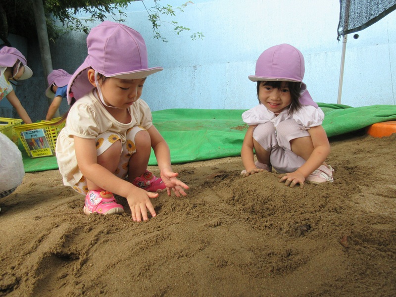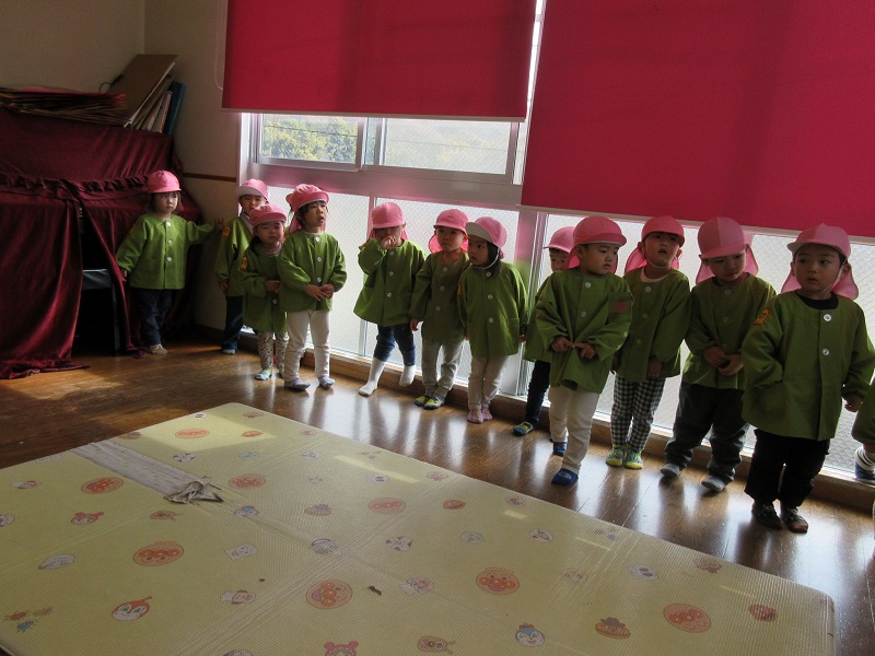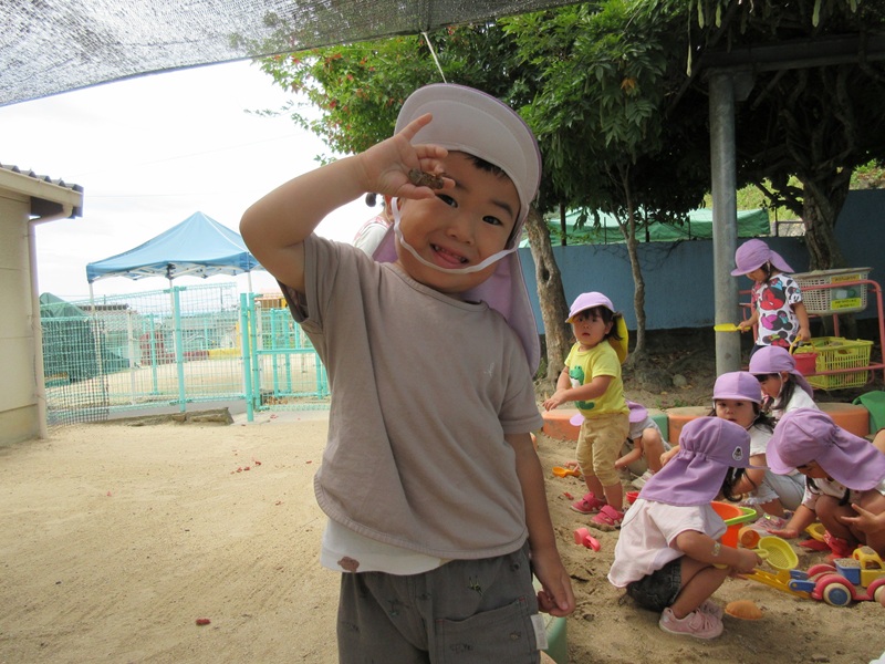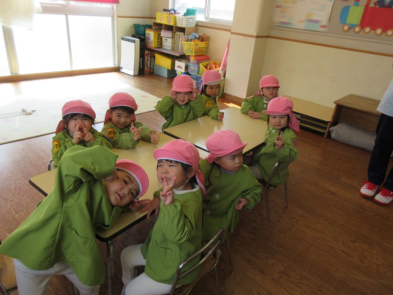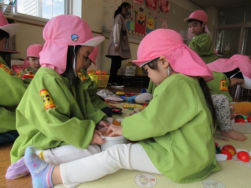 もうすぐ運動会ですね! ぱんだ組さんは初めての大きい会場に行くのでドキドキワクワクですね! 今日はお部屋でフルーツバスケットをしました! 1度しているのでルールを説明しなくてもお手の物です! 首から下げている果物を覚え、自分の果物が言われたら席を移動します。 動くのを忘れているお友だちがいたら「○○ちゃん!移動して!」とお友だち同士で教え合っていましたよ(^^)/ 今回は「バナナとブドウ」という感じで、2つの果物を一緒に呼んでみました! 最初は戸惑っていましたが、慣れてくると先生の言葉をよ~く聞いて移動できていましたよ☆ フルーツバスケットのあとは砂場遊びへ! 木の下にきのこが生えているのを見つけ、「うわ~!きのこが生えとる~!」と大興奮な子どもたちでした(*^-^*) キッチンに立って「いらっしゃいませ~!」とお店屋さんごっこをしたり、虫探しをしたりと楽しんでいました! |