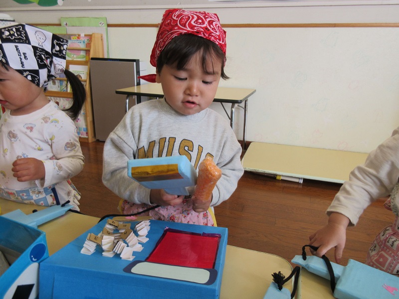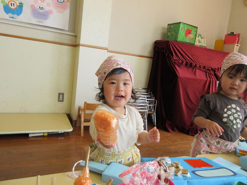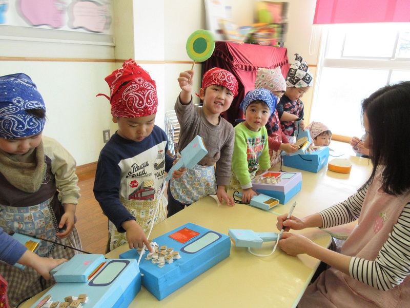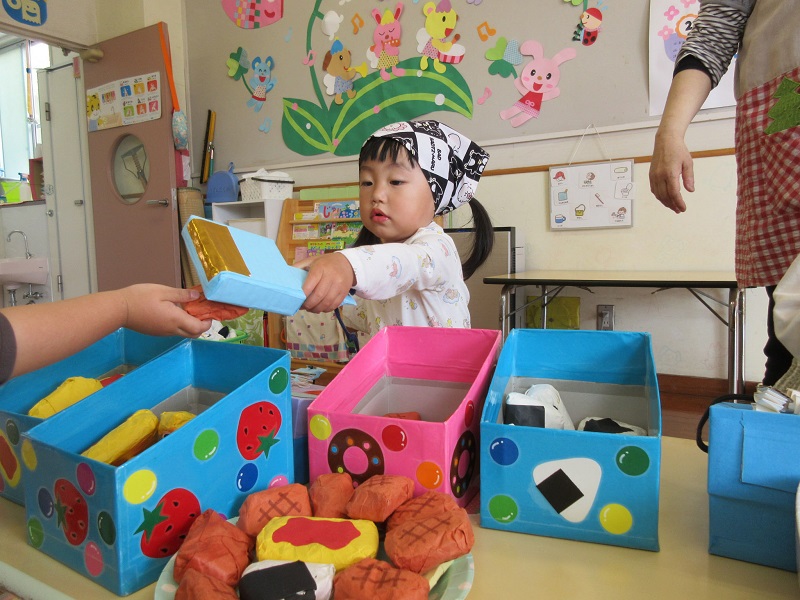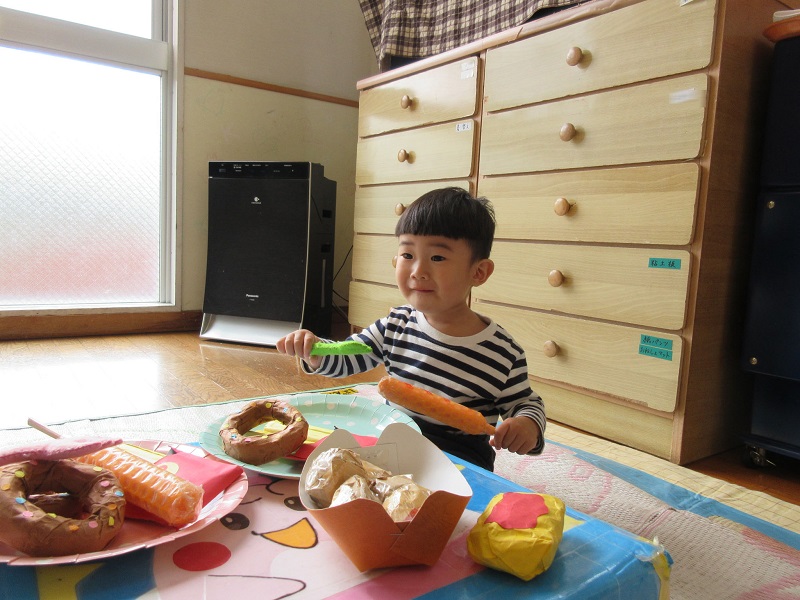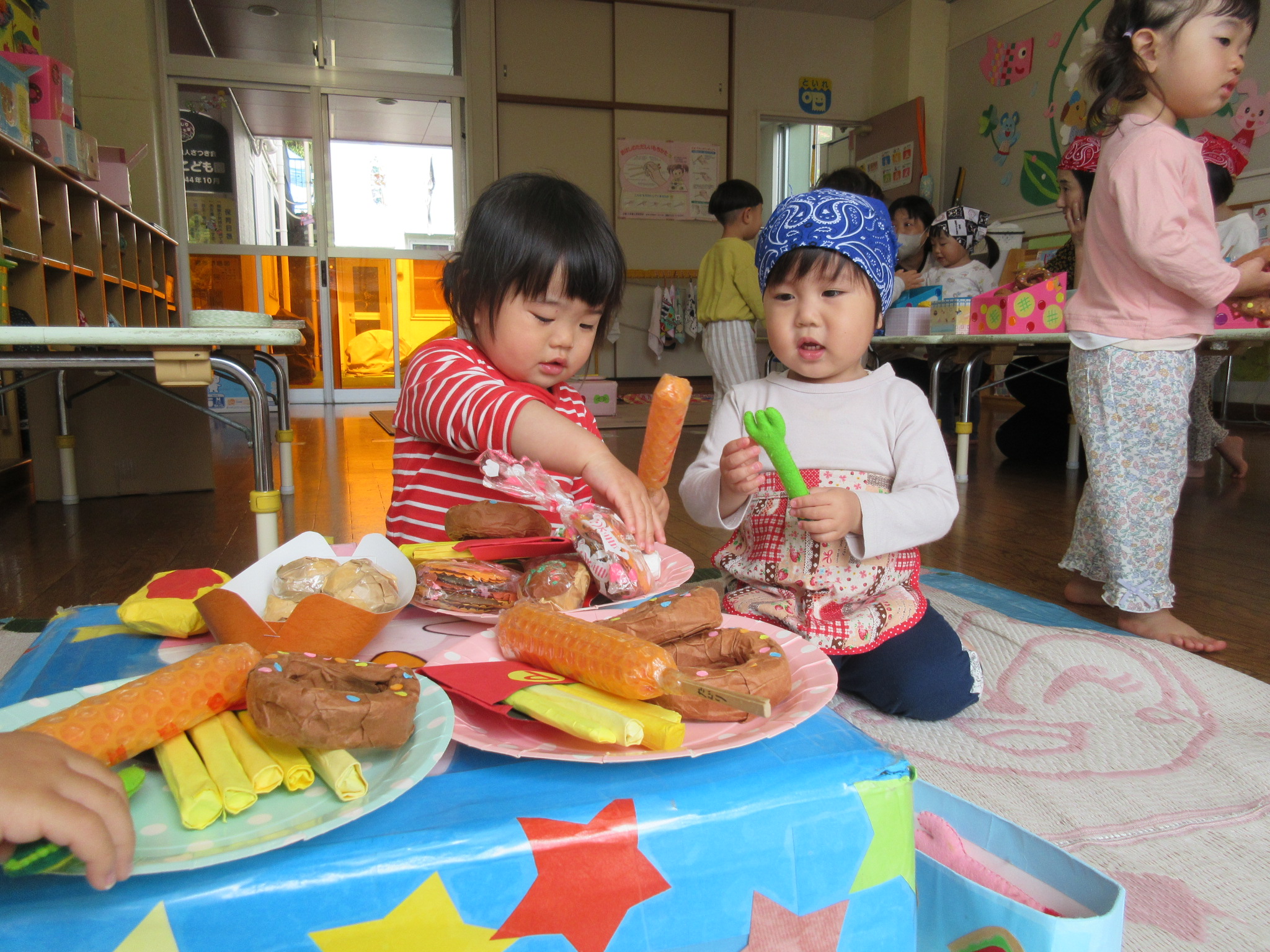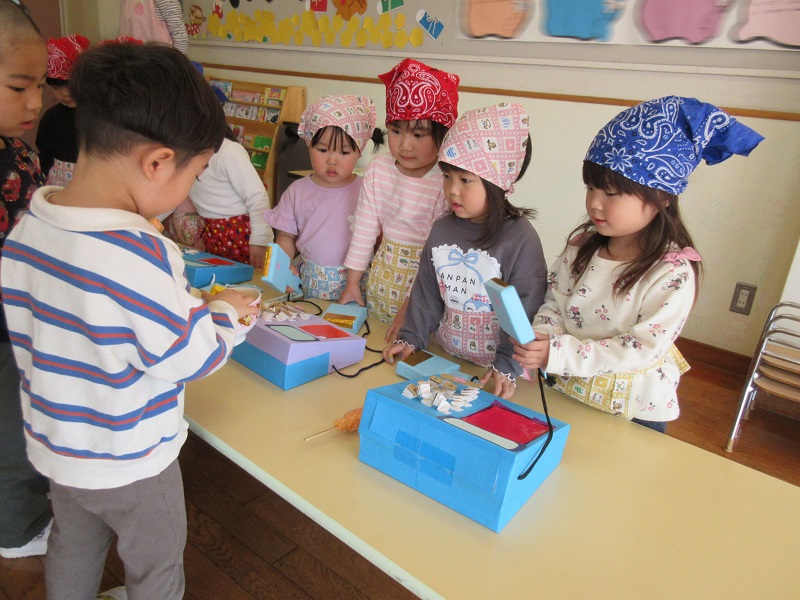 ぱんだ組になってもう1ヶ月が経ちましたね!進級当初に比べるとお兄さんお姉さんになった気がします( *´艸`) 今日は初めてのお買い物ごっこをしてみました!りす組にあるおままごととは違い、いろんな食べ物があり、レジスターもあります! お客さんと店員さんに分かれてごっこ遊びスタート! 店員さんは「いらっしゃいませ~!」とお客さんを呼び込み、渡されたものをピッとレジに通しました!「これもどうぞ♡」とおまけをくれるお友だちもいましたよ♪ お客さんは「どれにしようかな~」とたくさんある食べ物の中から好きな物を選び、店員さんにピッとしてもらいました!買ったものは机に持っていき、みんなでパーティーをしていましたよ! 「まだしたい~!」と言っていたお友だちもいたので、また今度しようと思います(^^)/ |