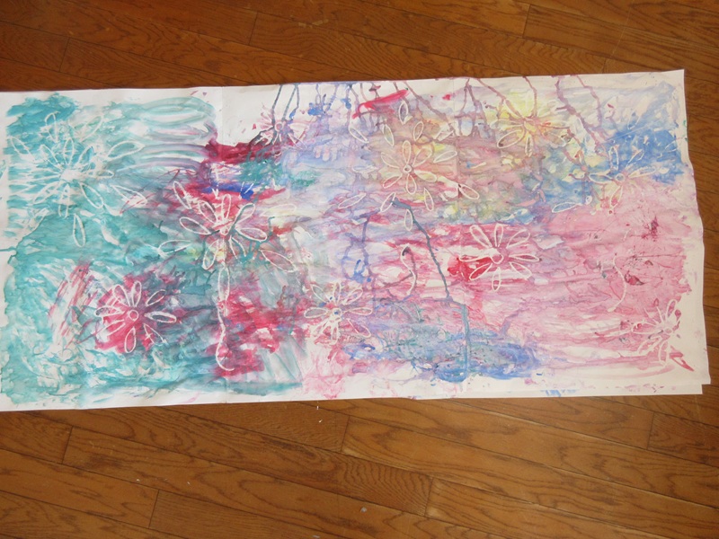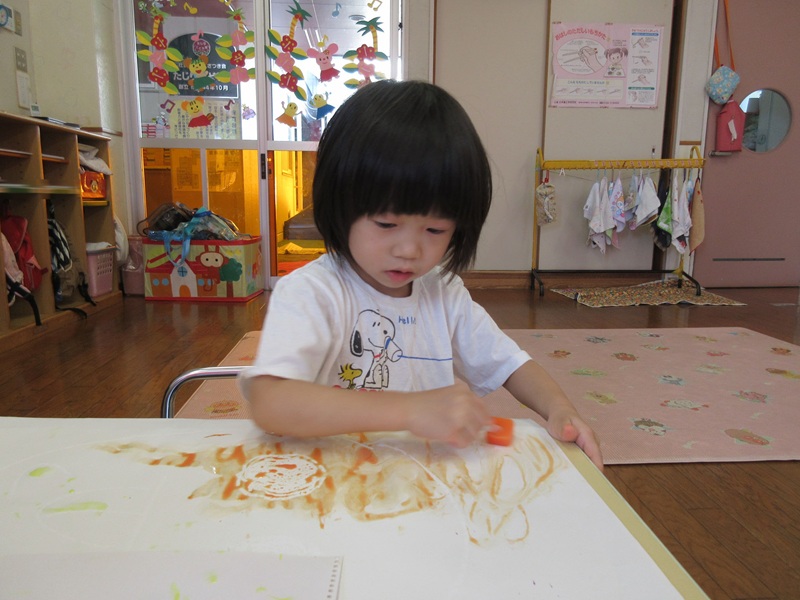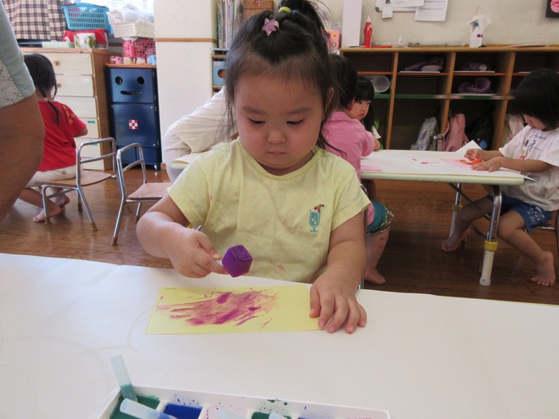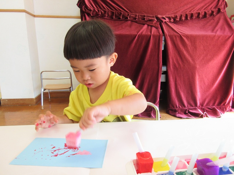 お盆休みも終わり、八月も後半戦に入りましたね~! まだまだ暑い日が続きそうなので、今日は氷絵の具で遊びました! 水に溶かした絵の具を凍らせてお絵描きをするのですが、初めてなのでまずは子どもたちに説明から! ・赤や黄色、緑に青のいろんな色の氷で美味しそうに見えてもお口に入れないこと ・クレヨンと同じで使った色はもとあった場所に戻すこと ・お友だちと順番こで使うこと この3つのお約束をしてお絵描きスタート♪ 白い紙に白い絵の具で絵を描いておいたので、ぱっと見は真っ白な紙だけど・・・。 氷で色を塗っていくと不思議なことに絵が浮かび上がってきます! ひまわりや花火、アイス等夏らしい絵が完成しました☆ お部屋に飾っているのでお時間ある時にぜひ、見てあげてくださいね! |