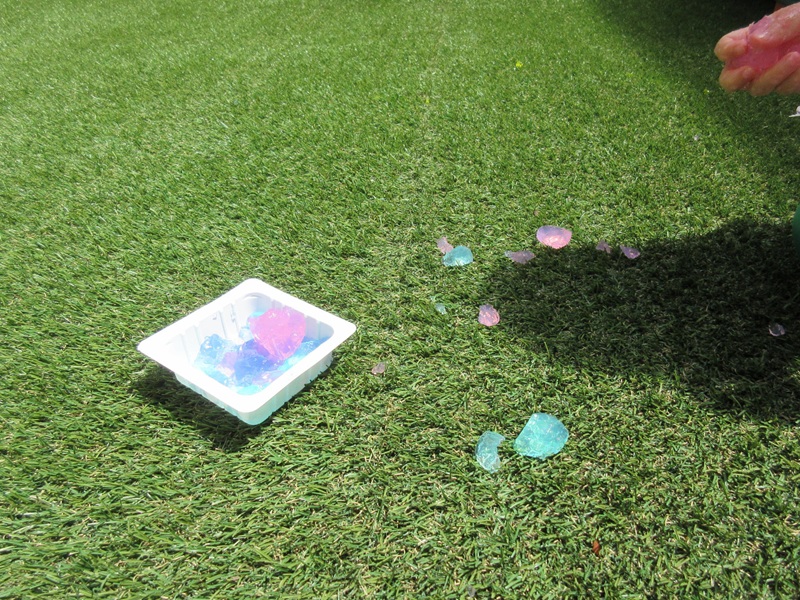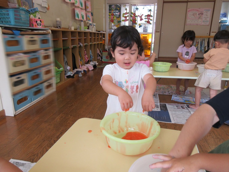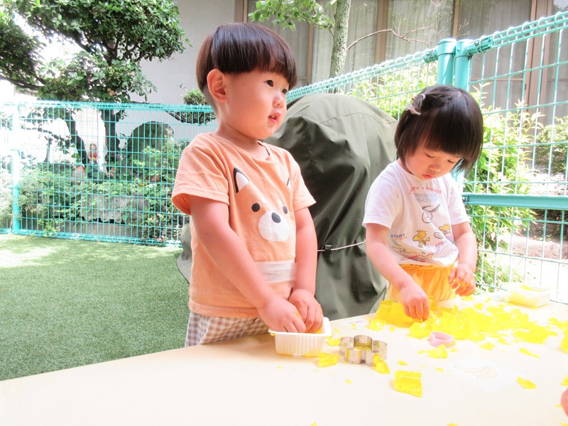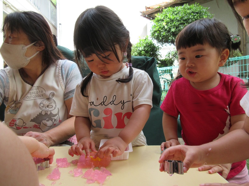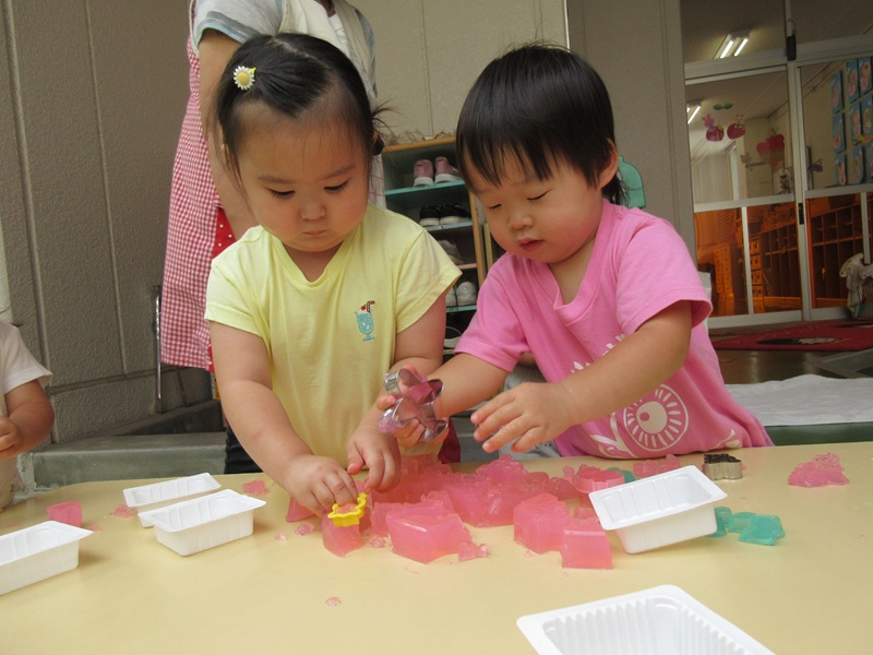 暑い日が続き、水遊びが気持ちいいですね! 今日のぱんだ組さんは寒天を使って感触あそびをしました♪ 赤・青・黄・緑の寒天の中から自分の好きな色のところに行きました! まずは型抜きから!ハートや星、飛行機等の型抜きを思う存分楽しんで、寒天が小さくなってきたら握ってみました! 普段は味わうことのない感触に少しビックリしていましたが、とっても集中して楽しんでいました(^^)/ 小さくなった寒天を器に入れてカラフルゼリーを作ってみたり、おひさまに透かして見たりしました! お日様に当てるとキラキラして綺麗でしたよ☆ 寒天遊びを楽しんだ後は水遊びをしました! 冷たい水が気持ち良さそうでしたよ! シャワーの架け橋を作ると、橋の下を通ったり、頭から水を浴びて大喜びの子どもたちでした( *´艸`) |