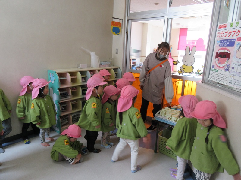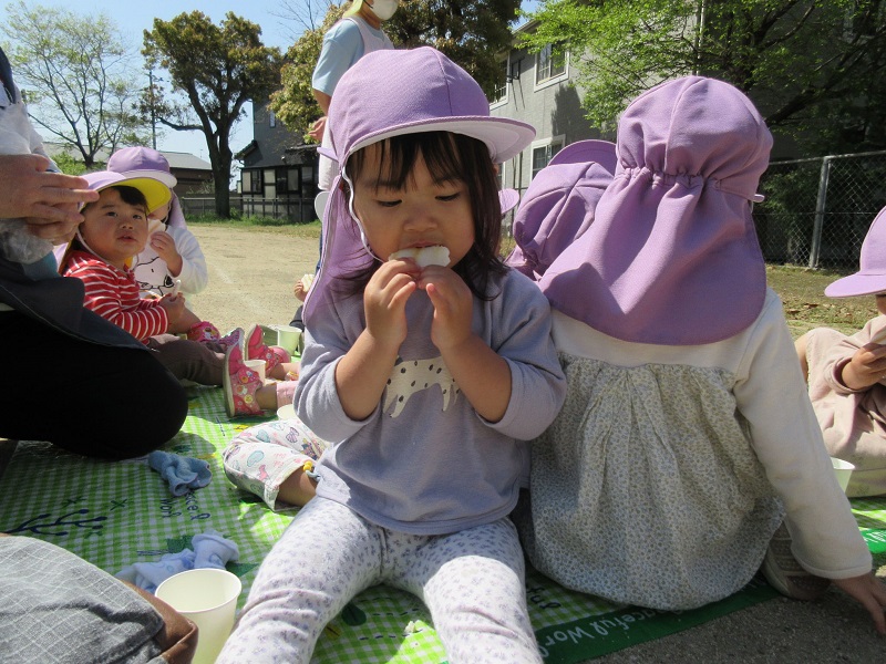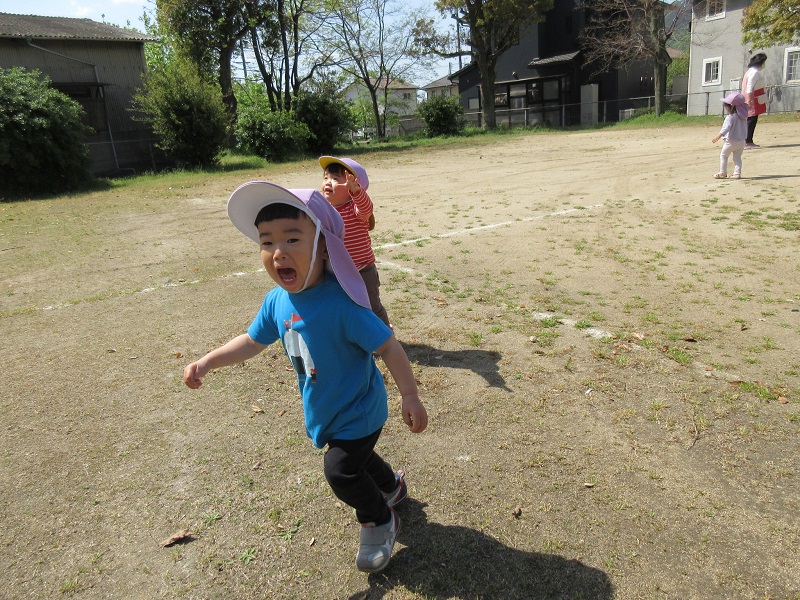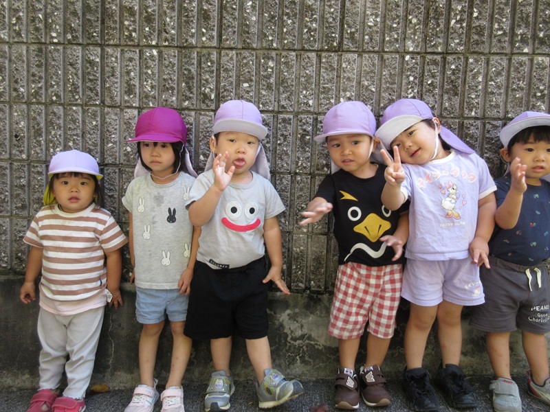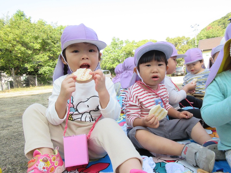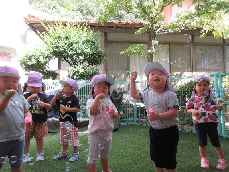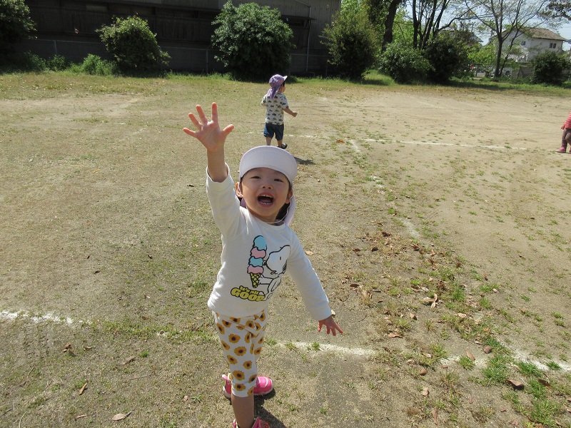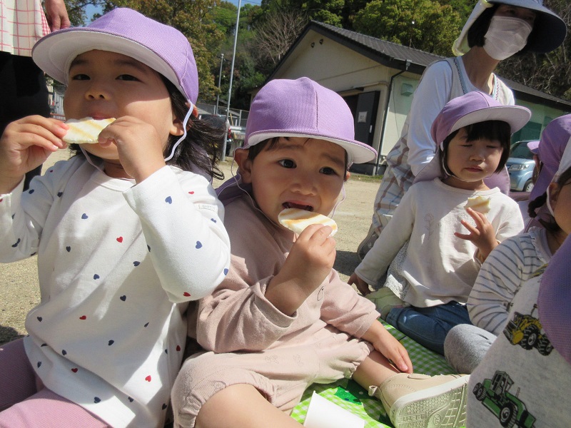 舟入公園までお散歩に行ってきました!お散歩リングを持ってさあしゅっぱーつ! 「あ!トラックだ~」「おはなきれいだね~」と言いながら歩きましたよ!途中の小学校では外で授業をしているお兄ちゃんお姉ちゃんに手を振ってもらい嬉しそうなぱんだ組さんでした( *´艸`) 公園に着いたらおやつ休憩!お外で食べるとピクニックみたいでよい美味しく感じますね!お茶もおせんべいもペロリと食べていました! 休憩の後はみんなでシャボン玉を追いかけました!風が強く、高い所までシャボン玉が飛んでいくと「うわ~!待って~!」とジャンプしていて可愛かったです♡ 帰りは疲れていましたが頑張って歩きましたよ☆ よく歩いて遊んだので給食もペロリと食べ終わりました(^^)/ |