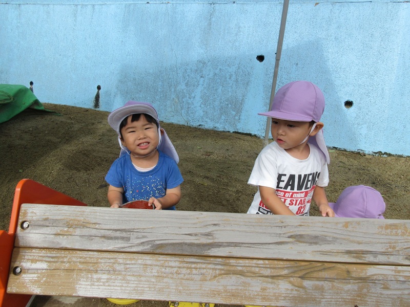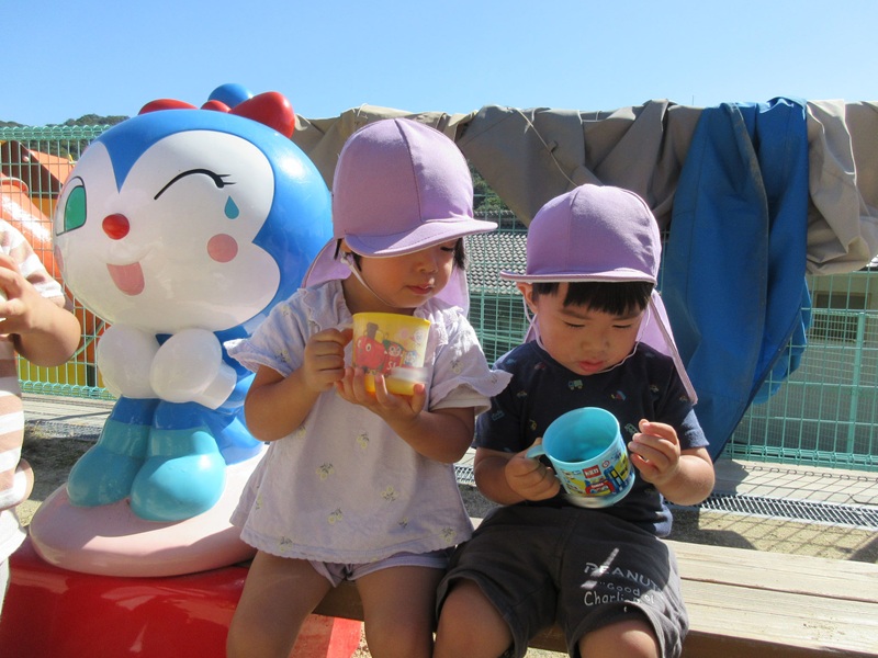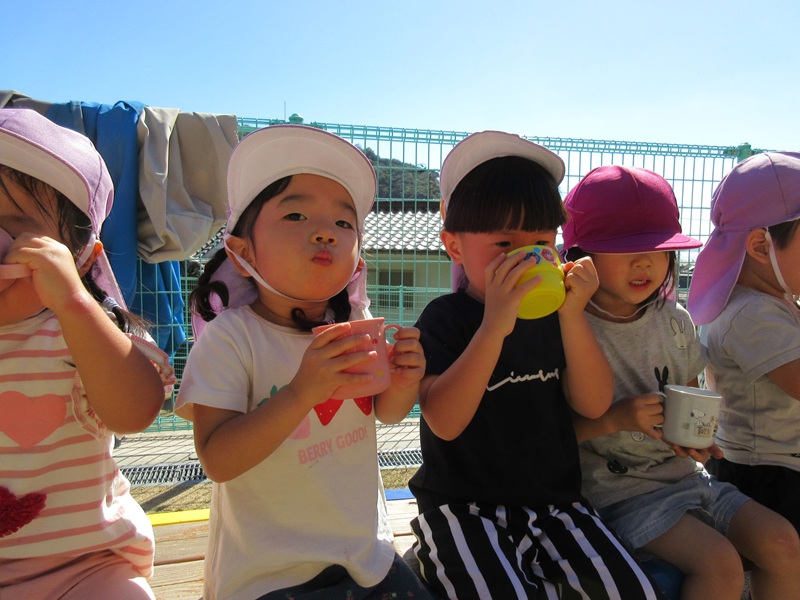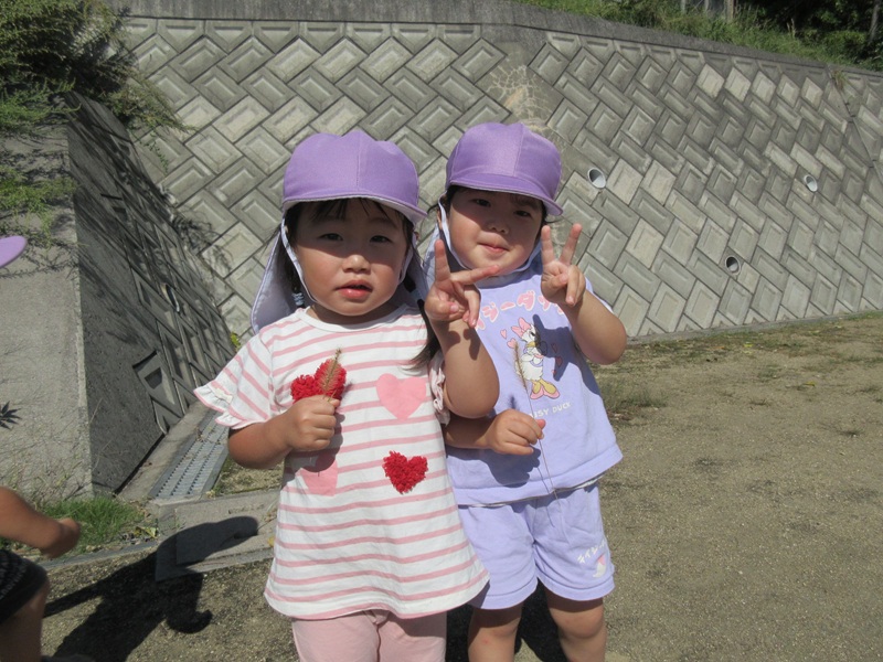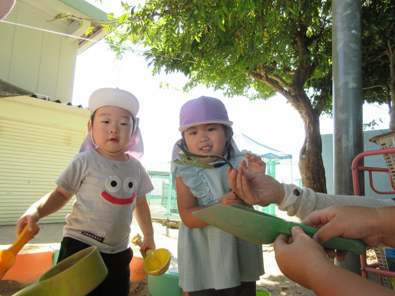 運動会が終わり、一つ成長したぱんだ組さん! 運動会ではかわいい姿を見せてくれましたね( *´艸`) 今日はお外遊びを楽しみました! 秋の風が気持ち良く、過ごしやすい気温になってきましたね! まずはアンパンマン遊具の運動場へ! 運動会でのかけっこが楽しかったようで、お友だちや先生を誘ってかけっこや追いかけっこを楽しんでいます♪ たくさん走った後はお茶休憩! コキンちゃんとドキンちゃんのベンチに座ってお茶を飲みます! その後は砂場でりす組さんと遊びました。 小さいお友だちにおもちゃを貸してあげたり、棚から取ってあげたりと、優しいぱんだ組さんでした(^^)/ カマキリを見つけ、みんなで観察しました! 「歩いてるね~」「登ってるよ!」とカマキリの行動を実況して楽しんでいましたよ♪ |