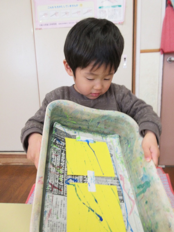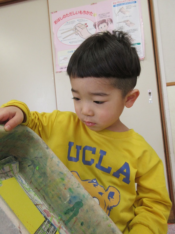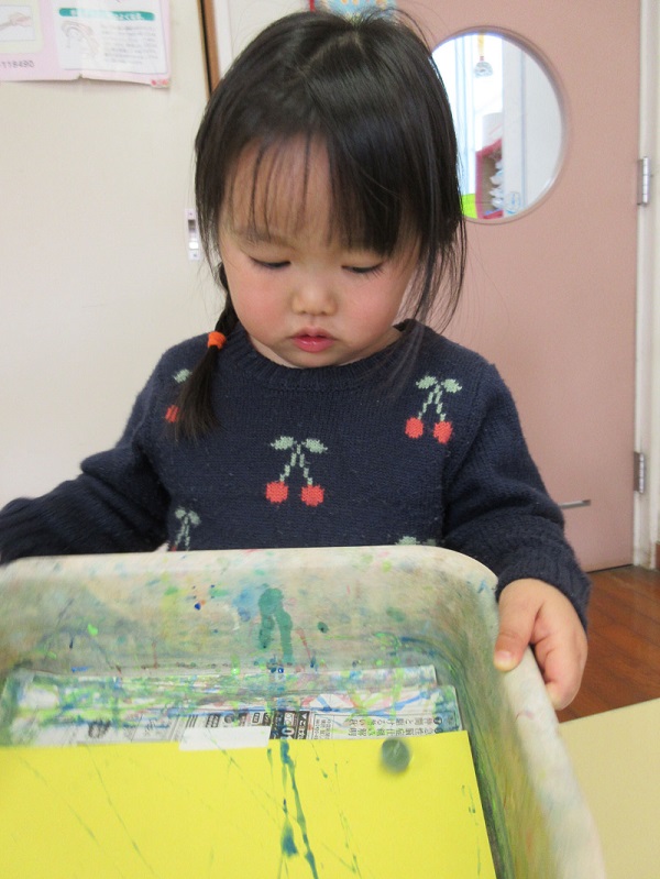 今日のぱんだ組さんは。。 節分の時に被る鬼のお面の製作をしましたよ(*^-^*) 鬼のお面の角の部分は絵の具とビー玉を使い、ビー玉転がしをして可愛い模様をつけます♬ 土台は色々な色の花紙を使い華やかにする予定です! 今日は、角の部分のビー玉転がしの製作をしましたよ! ビー玉がコロコロと転がって模様がついていく様子を見つめながら楽しそうに製作するぱんだ組さんでした(*^-^*) 製作の後はみんな大好きお外あそびの時間です! 寒さを物ともせず、元気いっぱいに遊ぶみんな! 追いかけっこをしたり、お気に入りの遊具で遊んだりして沢山体を動かして遊びました( *´艸`) 4月に比べて「お友だちと一緒にあそぶ」ことが増えたぱんだ組さん♬ 「一緒に遊ぼ~」「いいよ!」と誘い合いながら仲良く遊ぶ姿がとても微笑ましいです(#^^#) |