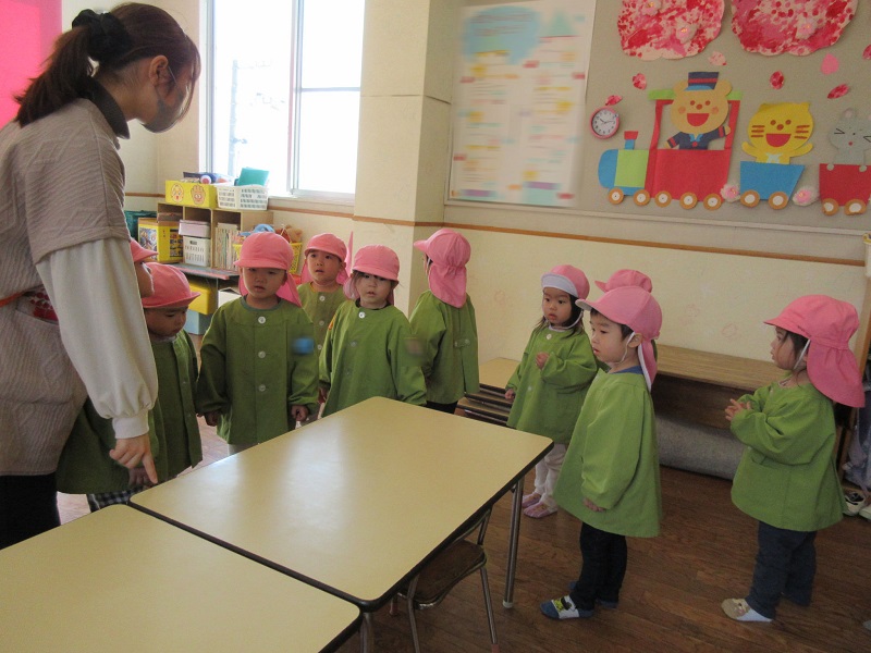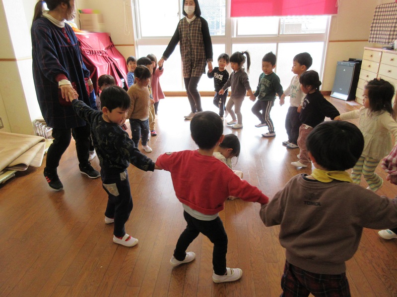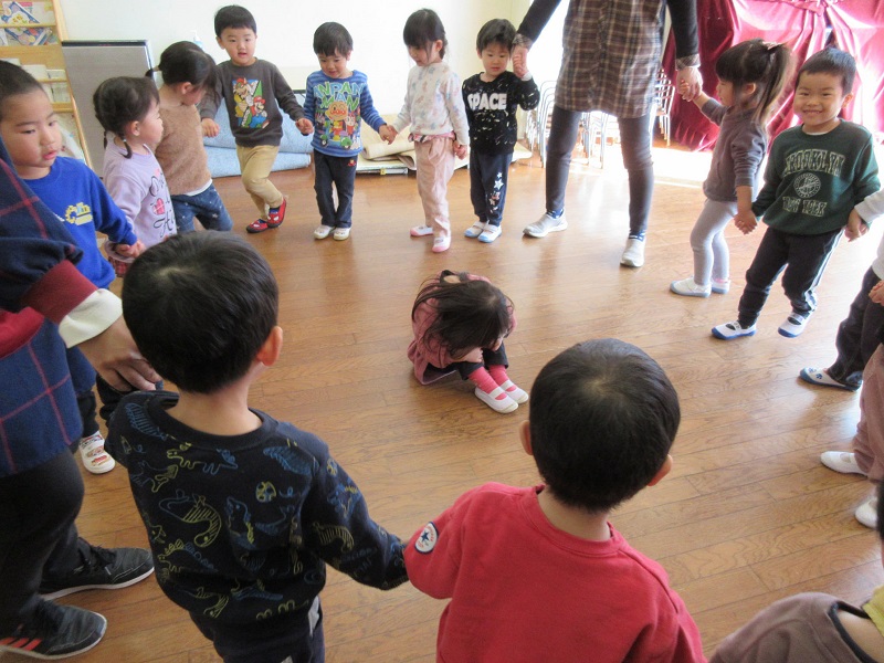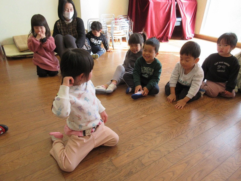 今日は、ぱんだ組さんで集団遊び 椅子取りゲーム&カゴメカゴメをしましたよ! 以前にした事ある椅子取りゲームはみんなお手の物!! ピアノに合わせて椅子の周りをまわり、ピアノが止まったらすぐにお椅子に座る!! というルールを守り、みんなで楽しくゲームをする事ができました(*^-^*) 椅子取りゲームの後は。。初めてカゴメカゴメという集団遊びをしてみました(*'▽') みんなで手を繋いで、『かごめかごめ~♬』のお歌を歌いながら、『後ろの正面だあれ!』で止まり、真ん中に座っているお友だちが後ろに座っているお友だちの名前を答えるというゲームです! 初めての遊びに、『どんなあそびかな~』『楽しみ!』とウキウキなぱんだ組さん♬ 最初は少し難しそうにしていましたが、繰り返し遊ぶうちにだんだんとルールを理解して遊ぶ事ができました!! これからも色々な集団遊びを通して、お友だちと遊ぶ楽しさを知ってほしいなと思います(*'▽') |