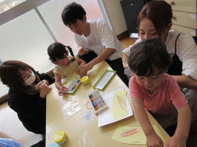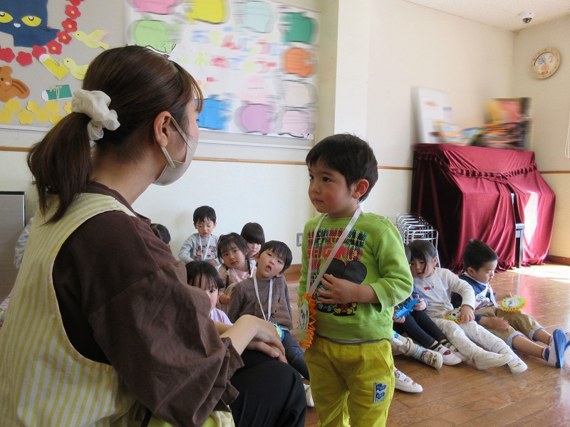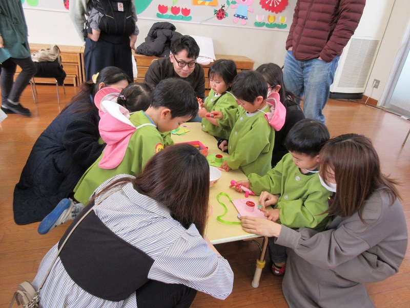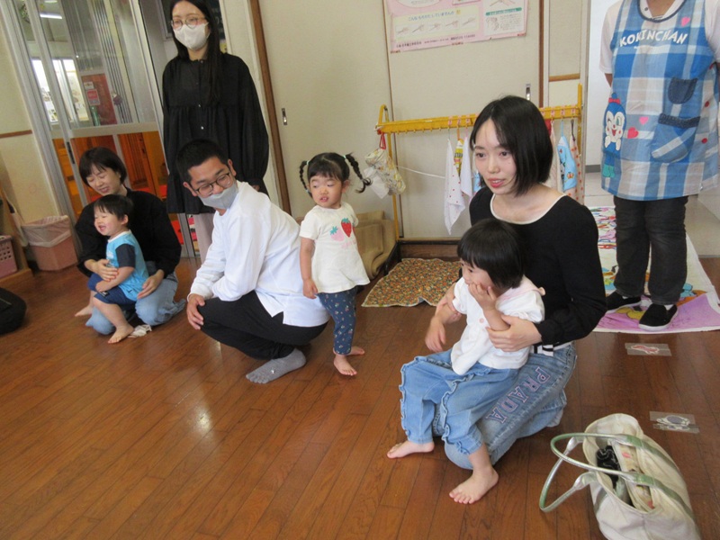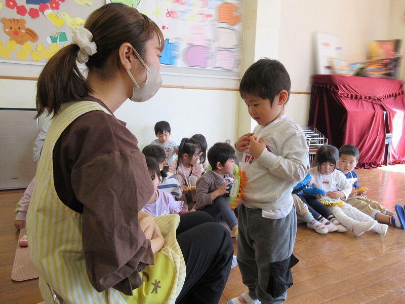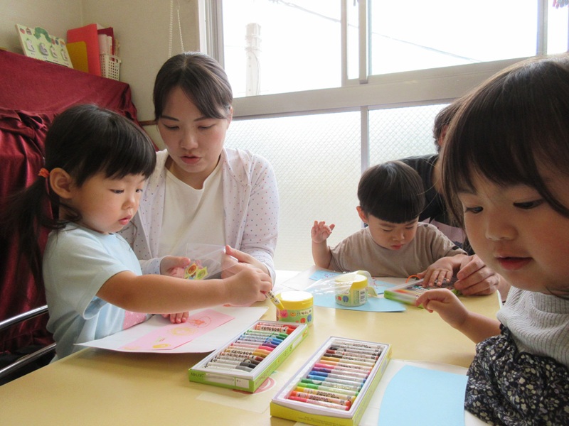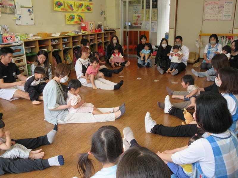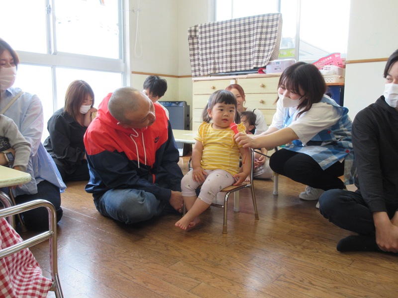 今日は子どもたちが楽しみにしていた参観日でしたね! まずは朝の会!朝のお歌をうたい、今日の天気を確認しました。 今日は緊張していたのか、答えてくれる子が少なかったのですが、いつもは「晴れ!」と元気いっぱいに答えてくれています(^^)/ お天気確認が終わったら子どもたちにお名前を聞いて、保護者の方に『お子さんのかわいいエピソード♡』を聞いていきましたよ! 恥ずかしい気持ちもあったと思いますが、自分の名前をしっかり言ってくれました!子どもたちのかわいいエピソードにも癒されました♡ 朝の会の後は紙コップけん玉を作りました! 画用紙にクレヨンでお絵描きやシール貼りをして、初めての糊付けをしました! 少しづつ糊をとるお友だちや、豪快に糊をとるお友だちもいましたよ! 世界に一つだけのけん玉が出来ましたね☆ 作ったけん玉で楽しそうに遊んでくれて良かったです! 最後は親子でふれあい遊び! 『GO!DOWN!ジェットコースター」と『ひっつきもっつき』をしました。 親子でギューッと抱きしめたり、揺れたりしたときの子どもたちの楽しそうな顔がとってもキュートでしたよ(*^-^*) ご参加、ありがとうございました! |