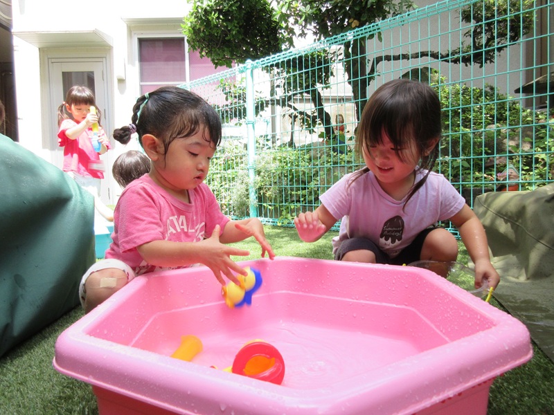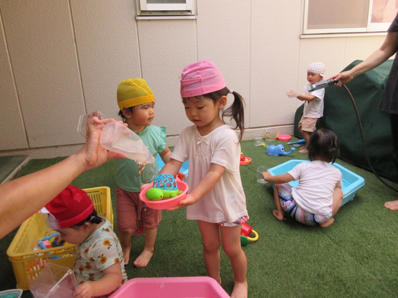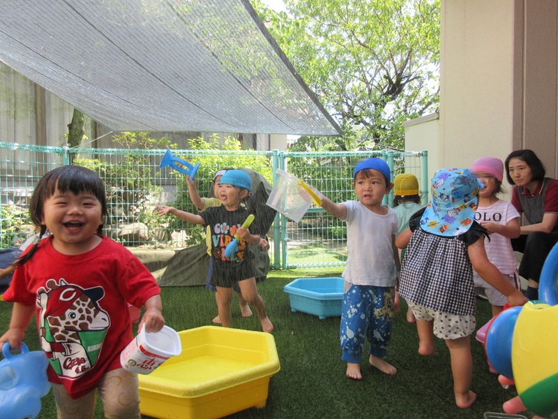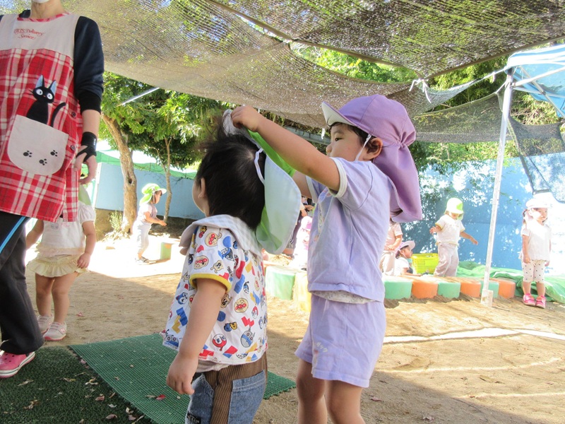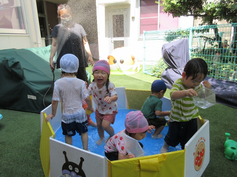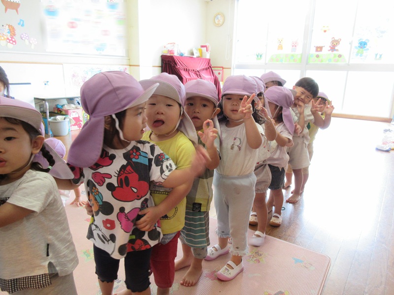 7月ももう中旬になり、せみが鳴き始めて夏が始まりましたね☆ そんなぱんだ組さんは最近、寒天や氷、水遊びをして夏ならではの遊びを楽しんでいますよ! 今日はおおきいアンパンマンプールに入って遊びました! いつもの桶とは違い、全身で水遊びを楽しめるのが醍醐味ですね。 ワニさんのような格好をしてみたり、ジャンプして座って水しぶきをあげてみたりととっても楽しそうな子どもたちでした( *´艸`) 水遊びをするとお腹が空くようで、給食ももりもり食べていましたよ! 給食の後はパジャマに着替えます! 7月から始めましたが、もうみんな慣れてきてスムーズに着替えていますよ☆ 保護者の方が付けてくださったマークを見て、「こっちが前!」と前後ろを意識して履くようになりました! |