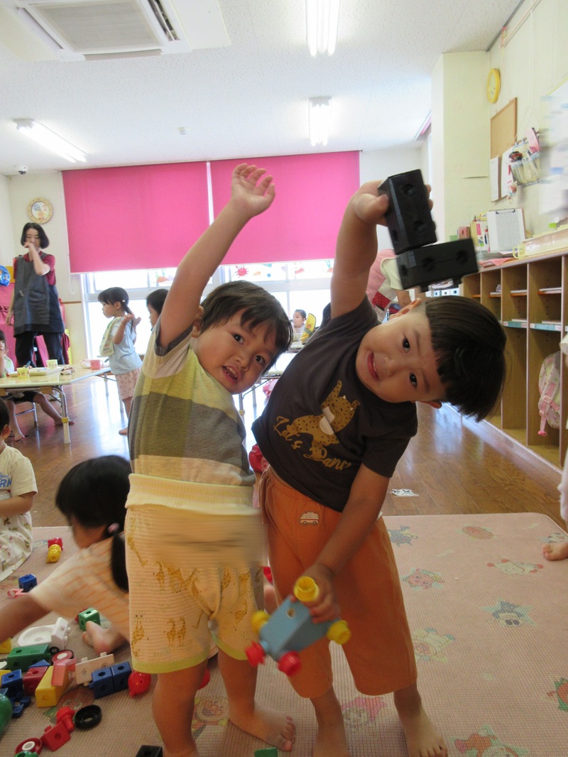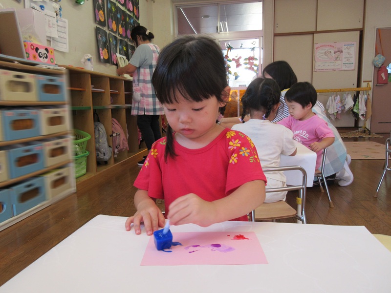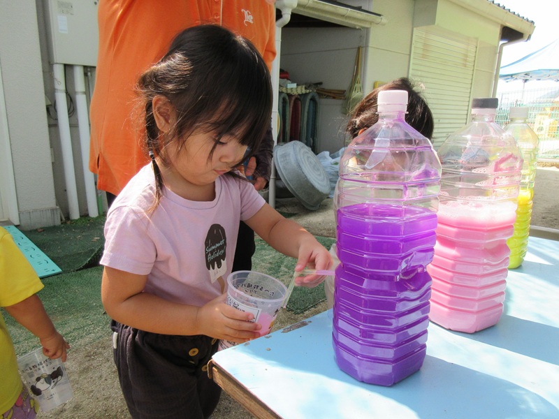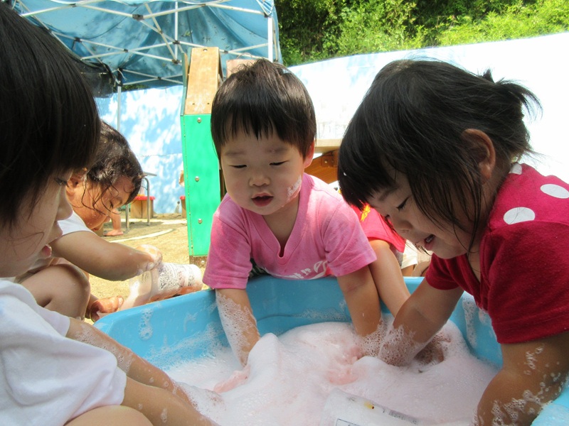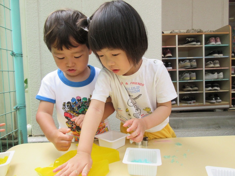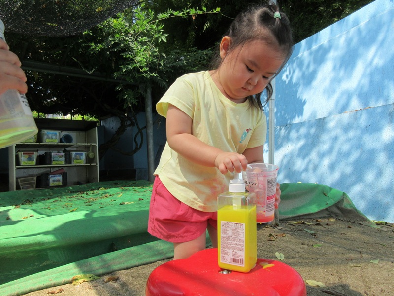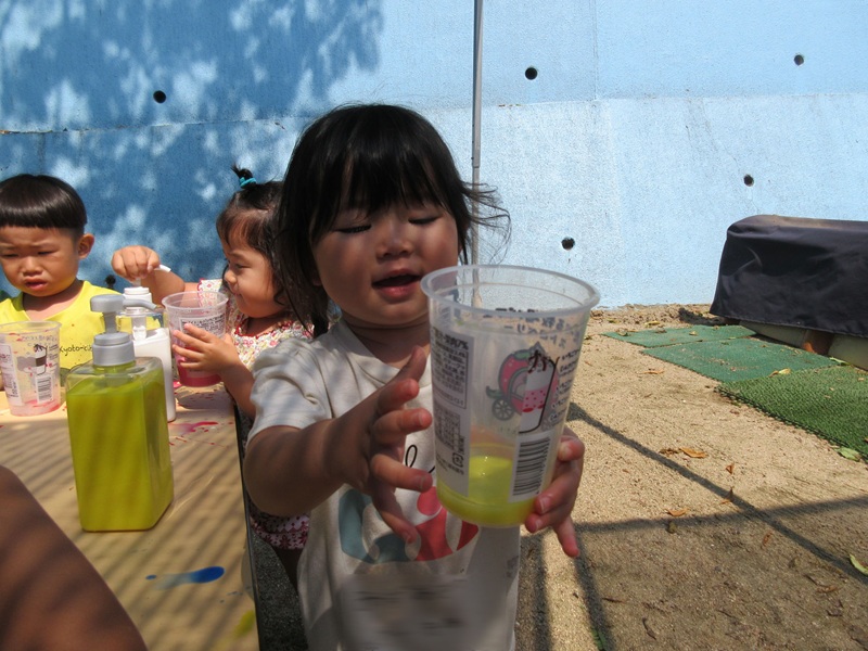 7月ももう終わりに近づき、8月が来ますね! 夏らしい遊びをたくさん満喫している子どもたちです! スライムに色水、泡遊び等、夏ならではの遊びが盛り沢山です(^^)/ スライムは材料を自分たちで桶に入れて作りました。 魔法のお水を入れると液体がだんだんと固まっていくのでビックリしていましたよ! 初めての感触でとても集中していました! 色水遊びでは自分で好きな色を混ぜていろんな色を作りました! 赤と青を混ぜると紫に、黄色と青を混ぜると緑になるので不思議そうでしたよ! 作った色水の上に泡を乗せてジュースも作りました! 泡の感触が気持ち良かったようで全身泡まみれになって楽しんでいました( *´艸`) |