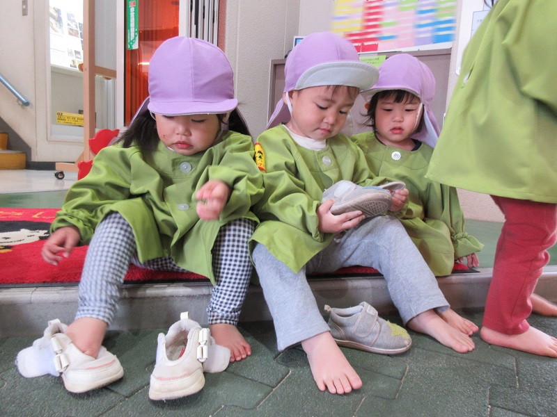 最近のぱんだ組さんは。。 乾布まさつを始めてだいぶ経ち、先生の動きを真似してしっかりとゴシゴシできるようになってきました! 普段は上半身だけ服を脱ぎ、元気に過ごす事ができるように一生懸命乾布まさつをしています(*^^*) 最初と最後にかっこよくご挨拶をして、メリハリをつけていますよ!(^^)! 着脱の練習や服を畳む練習等乾布まさつを通して色々な成長を見る事ができています! 最近は運動会で使用するため、シューズを履く練習もしています! 運動会が終わると、普段からシューズを履いて過ごすようになるので、今からしっかりと履く練習をしていますよ(*^^*) ぱんだ組さんは運動会でトトロをテーマに親子競技を行うので、ぱんだ組さんのお部屋は、トトロ一色になっています✨ 子どもたちが頑張ってひも通しをしたトトロと大きなトトロやめいちゃんがいつも見守ってくれてますよ! |