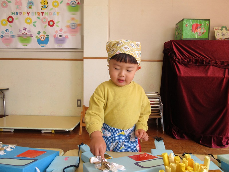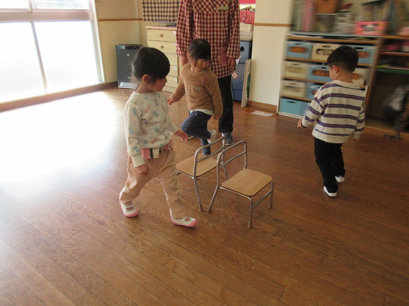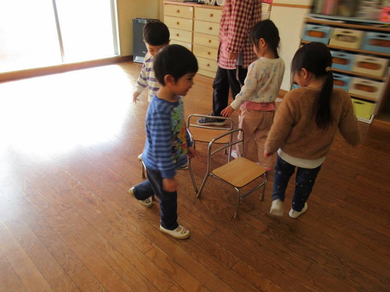 今日は、みんなで初めて椅子とりゲームをしてみました! ピアノに合わせて椅子の周りをぐるぐるし、 音楽が止まったら近くにある椅子に座る!! というルールを説明し、何度も繰り返すうちに椅子の周りを歩いたり、 素早く座るという事が上手になりました(*^^*) これからも集団遊びを活動の中に取り入れていき、お友だちとルールのある遊びをすることの楽しさを知ってもらいたいなと思います!(^^)! 椅子取りゲームの後は、みんな大好きな新聞紙あそび! 小さくビリビリに破いたり、長くちぎってヘビさんを作ったり、ボールを作って転がしたりとそれぞれに楽しみました♪ |