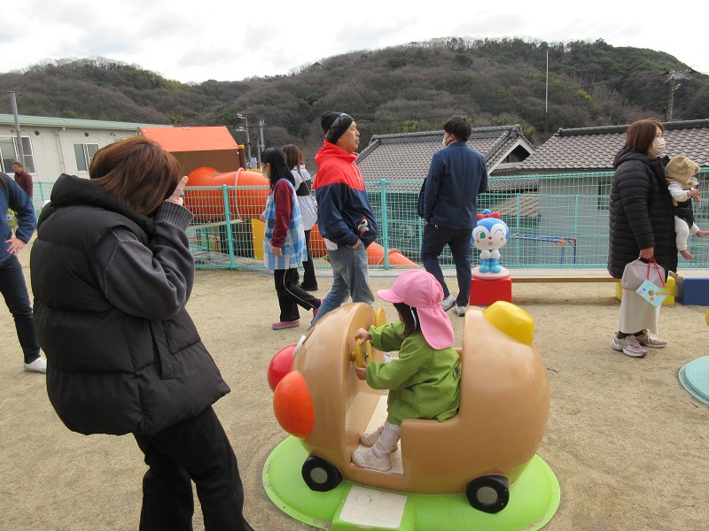 今日は、参観日がありました! ぱんだ組の参観日は今回で最後になります。 今日を『明日参観日だよね~』『楽しみ♬』と前日から楽しみにしていたぱんだ組さん(*^-^*) 朝の会から、集団遊び『椅子取りゲーム』をしている姿を見て頂きました! お父さん、お母さんが部屋の中に入ってくると、ワクワクとドキドキでいっぱいのぱんだ組さん! 朝の会では、今日のお当番さんを紹介したり、大きな声でお返事をしたりして、普段のぱんだ組さんの頑張っている姿を見てもらいました(*^^*) 朝の会の後は、集団遊びの椅子取りゲーム! ぱんだ組になってから集団遊びのルールを理解し、友だちと遊ぶ事の楽しさを知ったぱんだ組さん♬ みんなが大好きな椅子取りゲームをしている姿を見て頂きました(*^-^*) 最後まで残ったお友だちも、残ったお友だちを応援しながら待つことができたお友だちも、みんなとってもかっこ良かったです! 椅子取りゲームをした後は、みんなでカメラの製作♩ 事前に選んでもらった玩具のカメラに、マジックやシールを使ってかわいく飾りつけしてもらいました(*^-^*) カメラが完成したら、アンパンマンの運動場に行って、写真を撮ったり、遊具で遊んだりして楽しみましたよ! 保護者の方と楽しそうに遊んでいる姿を見る事ができて良かったです(*´▽`*) ぱんだ組で過ごすのも残り3週間になりましたが、子どもたちと元気いっぱい笑顔で過ごしていきたいと思います! 保護者の皆様、お忙しい中ご参加いただき、ありがとうございました(*^-^*) |