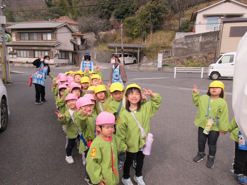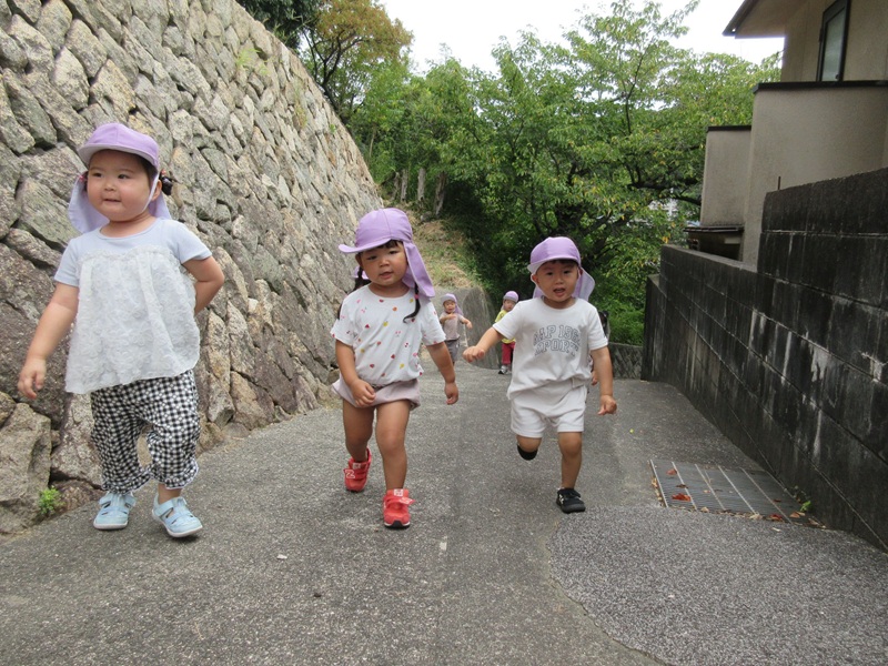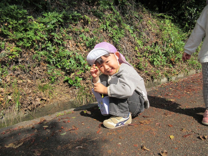 今日はとってもいいお天気だったのでお散歩に行ってきました! 自分たちでつくったお散歩バッグを持ってしゅっぱ~つ! 行きの道中では「お水がキラキラしてる!」「うわ~トラックだ~!」 「ちょうちょがいるね~」と楽しそうにお友だちとお話していましたよ♪ 舟入公園についたらちょっと休憩!お茶を飲んだりおやつを食べて一息つきました。 おやつを食べて元気いっぱいになったら、今回のお散歩のメインイベント! どんぐりを拾いに八幡神社の下の坂道まで頑張りました! 坂道にどんぐりが落ちていて、「あ!どんぐり!」と大興奮でした! お散歩バッグに拾ったどんぐりや木の実をたくさん集めて、お友だちと見せ合いっこをしていましたよ! あまり拾えていないお友だちがいると見つけてきてあげて渡してあげていた優しいぱんだ組さんでした( *´艸`) 帰り道は疲れている様子でしたが、帰ったら美味しい給食が待っていることを伝えると元気になりました☆ みんなの大好きな消防車にも出会えて、消防士さんに手を振ってもらえてうれしそうでした! 次のお散歩が楽しみですね! |