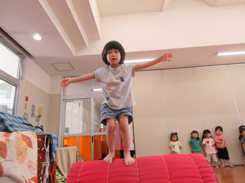 9月に入りましたが、まだまだ暑い日が続きそうですね・・・。 最近のぱんだ組さんは運動会の練習や着替えを頑張っています! 運動会でははらぺこあおむしになって大冒険をしてもらいます! 山登りをしたり、トンネルをくぐったり、一本橋を通ってみたり・・・。 トンネルや平均台は以前もしたことがあるのですが、山登りは初! 最初は恐る恐る登っていたみんなですが、慣れてくると頂上からのジャンプも平気に!かっこよく飛んでいますよ☆ 9月からはパジャマのお着替えが上下になりました! ズボンはもうお手の物ですが、Tシャツがなかなか難しい(-_-;) 先生と一緒にお着替えを頑張っていますよ! ぱんだ組ももう後半に差し掛かり、以前よりも活動内容が増えましたが、毎日楽しそうに活動に参加しています! 運動会、楽しみですね♪ |