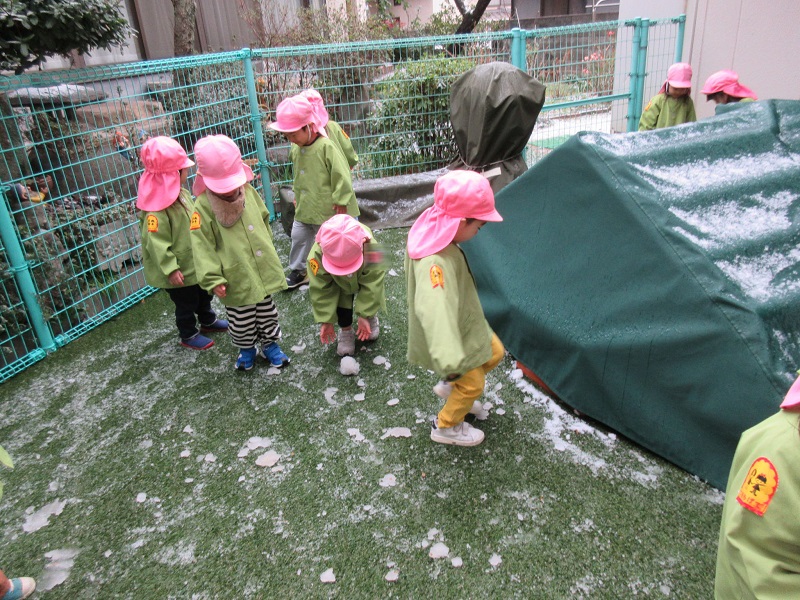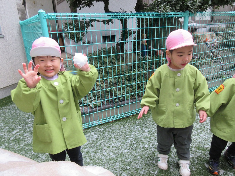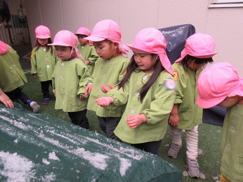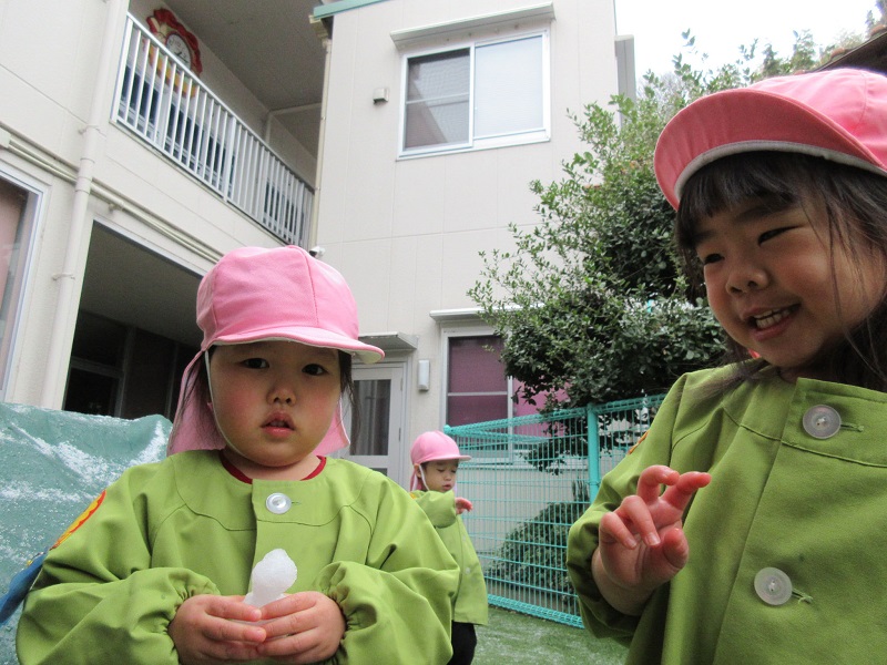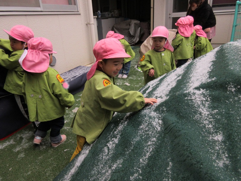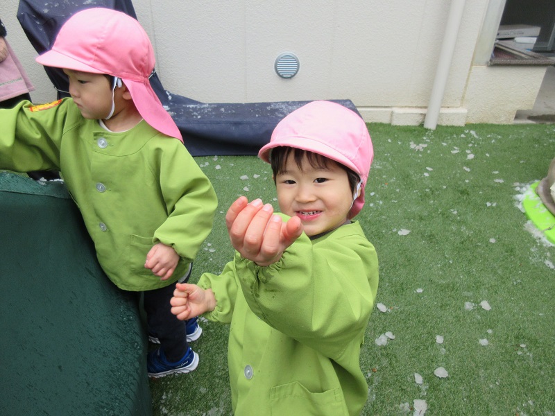 今日は、朝から雪が降っていて、中庭に積もる雪を見て、「雪が降ってるね~」「すごいね!触りたいね!」と大興奮のぱんだ組さん♬ 雪が止み、溶けるまでの少しの間、雪遊びをしました(*^-^*) 雪を集めて、雪だるまを作ったり、丸めてボールを作ったり、、 「つめたい~」「でも楽しいね♬」 と手や足で雪の感触を確かめながら、冬ならではの遊びを楽しむことができました(*'▽') あまり経験する事ができない雪遊びをこども園で楽しむ事ができ、とても新鮮で、ウキウキなみんなの笑顔を見る事ができました(❁´◡`❁) |