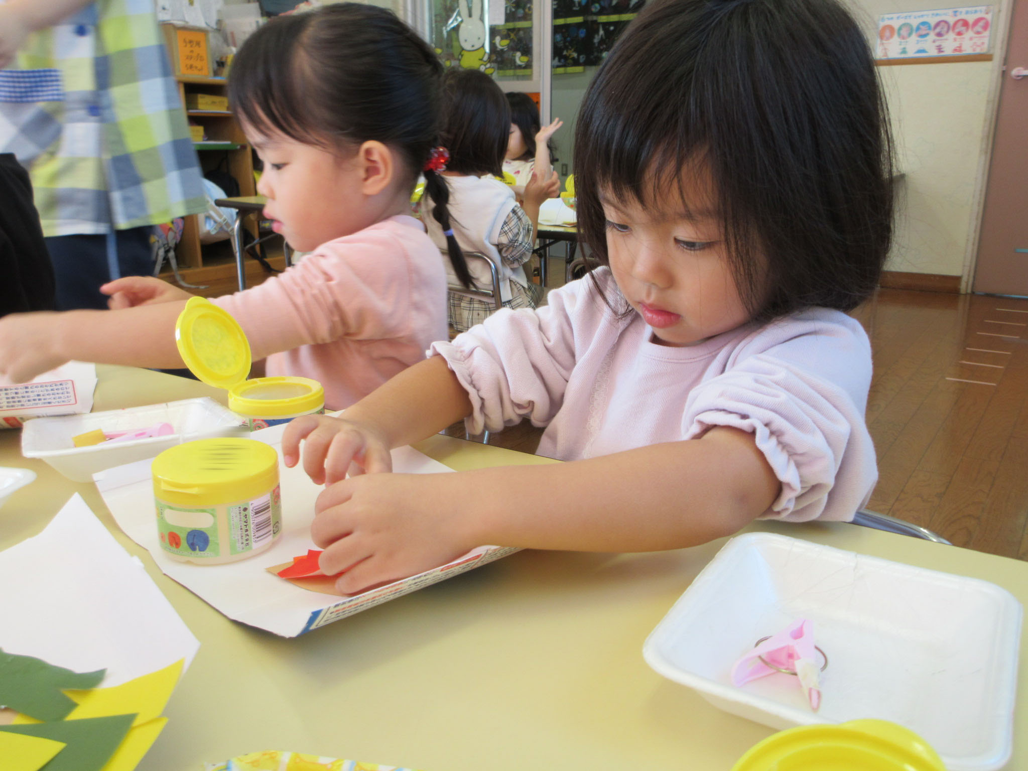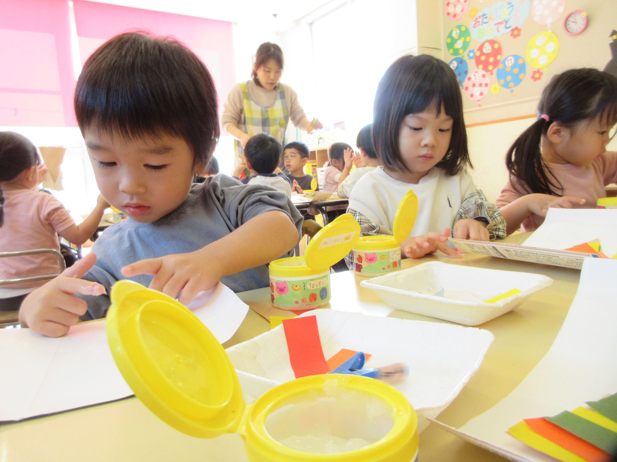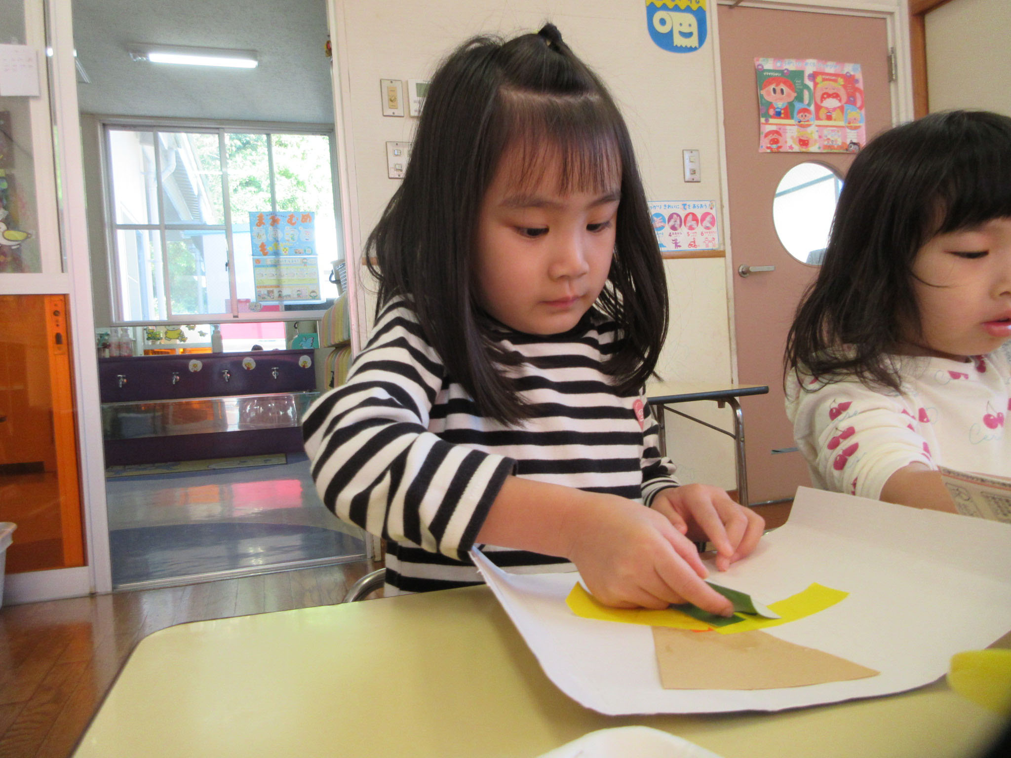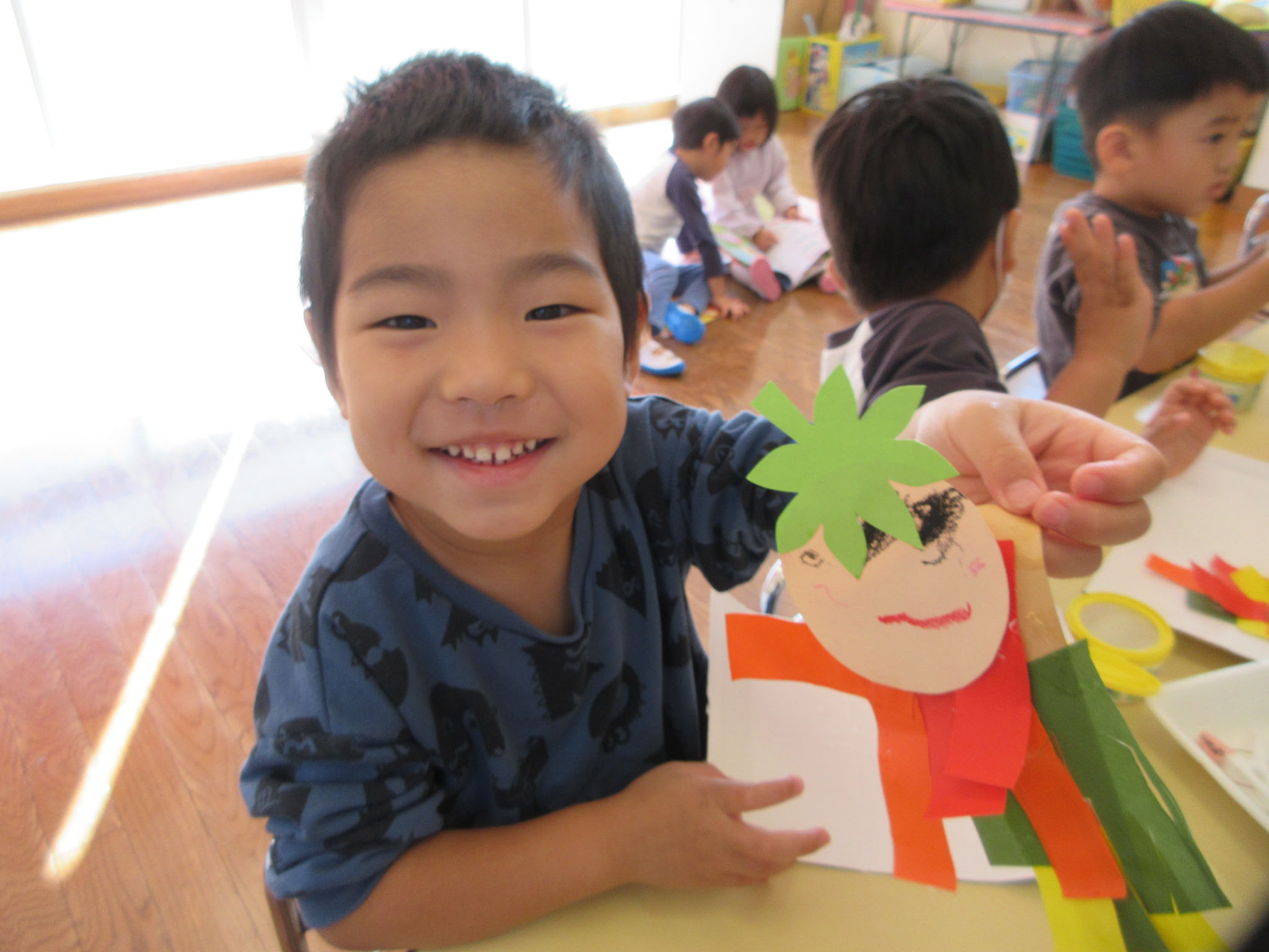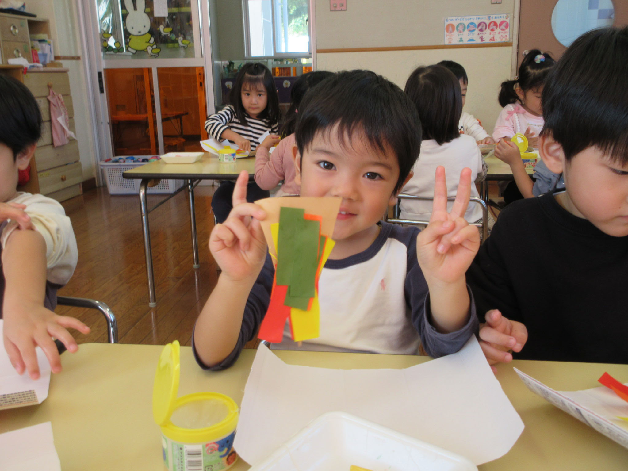 気温が下がり、夏の暑さが嘘だったかのように、 一気に冬の気温になりましたね…(;´・ω・) 今日は11月の壁面に製作しました! 自分で切った赤・黄・深緑・オレンジ色の折り紙を ミノムシの服に見立てて、顔をミノムシを製作をしました! ハサミの持ち方、紙を持つ方の手の位置、 どうすれば真っ直ぐに切れるのかを考えながら切ったり、 のりをつける量、つける位置を確認しながら製作しました! 4月では、上手く持てなかった子どもたちも、線に沿って 真っ直ぐ切れるようになりましたよ~(*^▽^*) 製作の説明もしっかり聞いて、 それぞれ可愛いミノムシが出来ました(#^.^#) これからも製作の中で、 道具の使い方を知っていってほしいなと思います! |