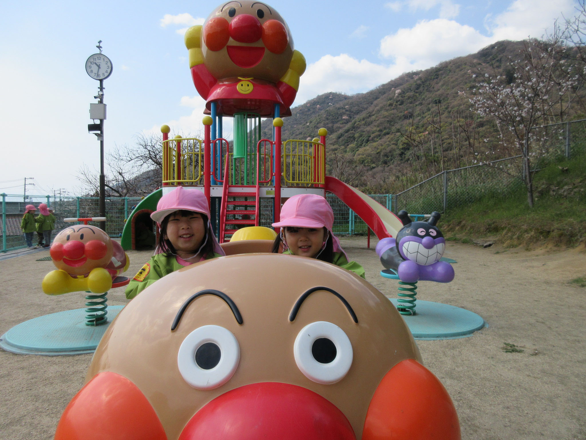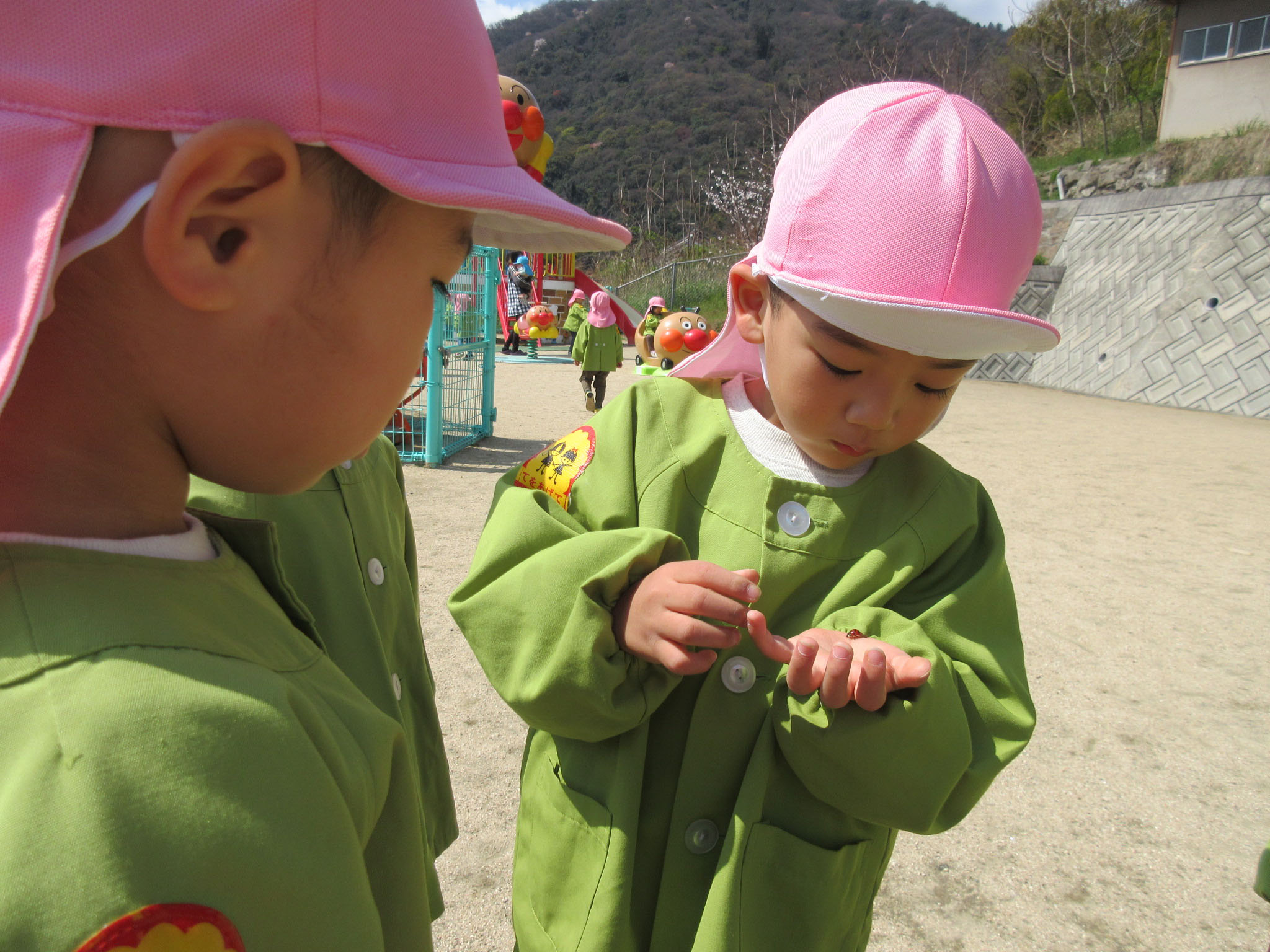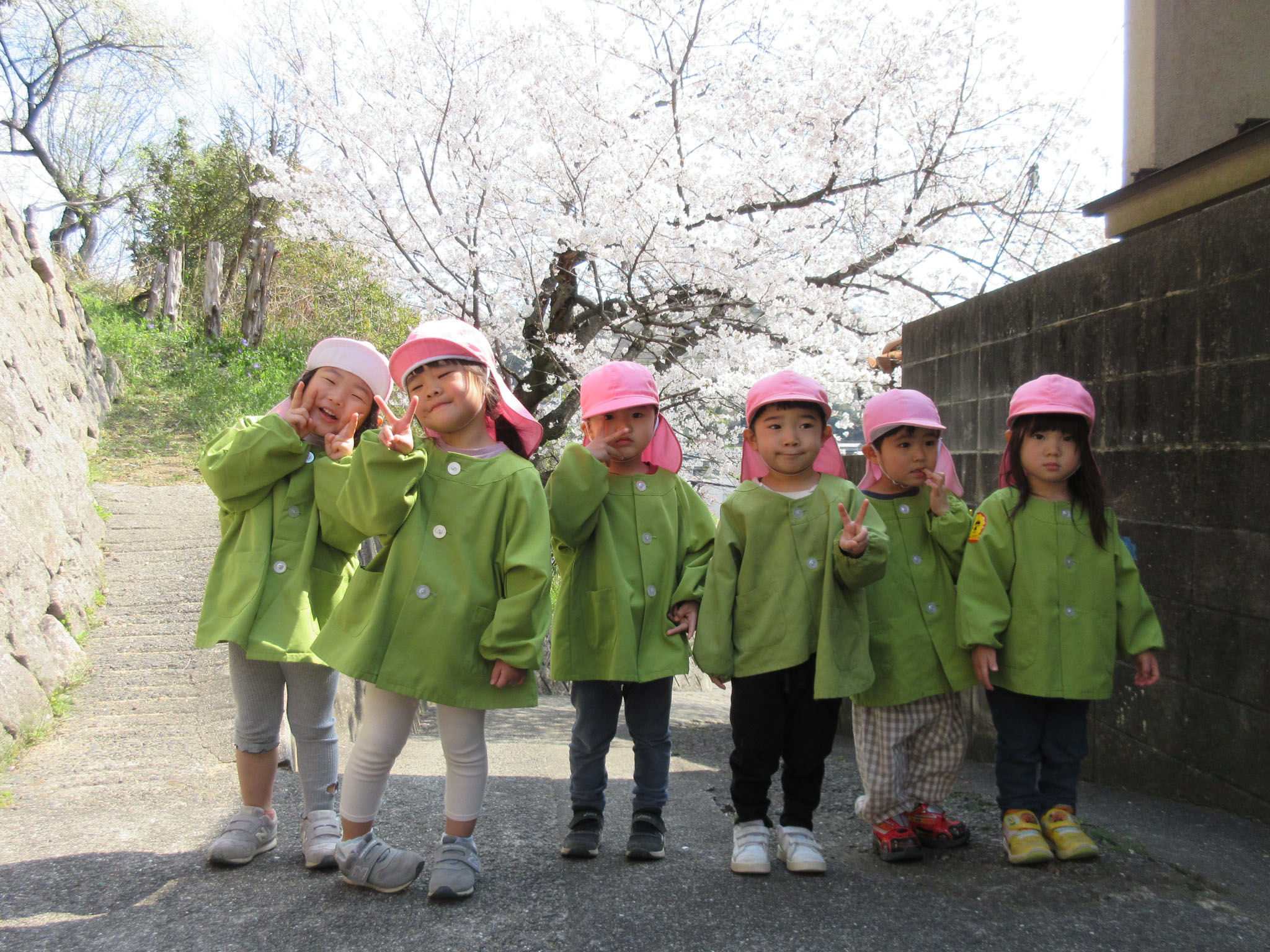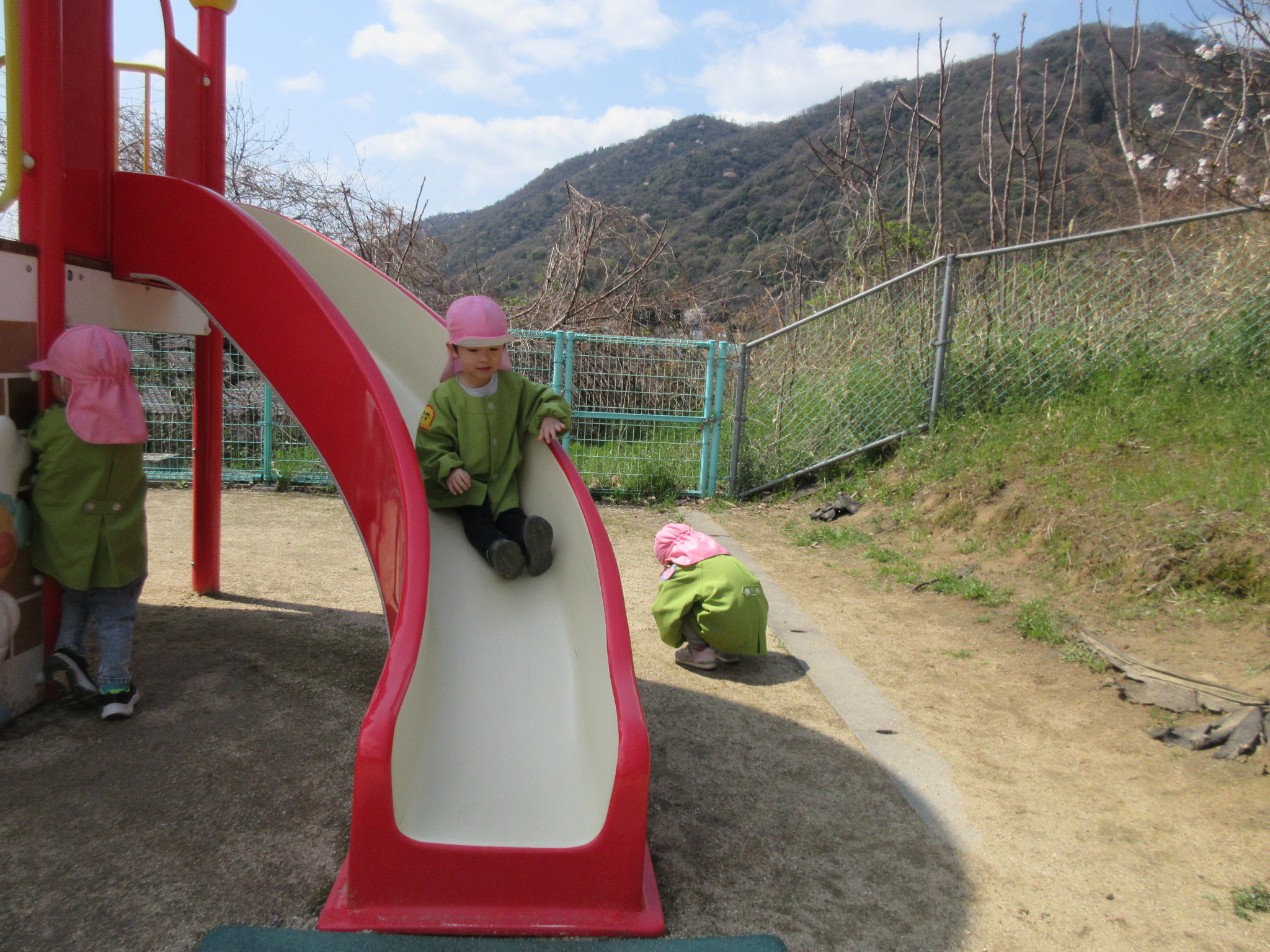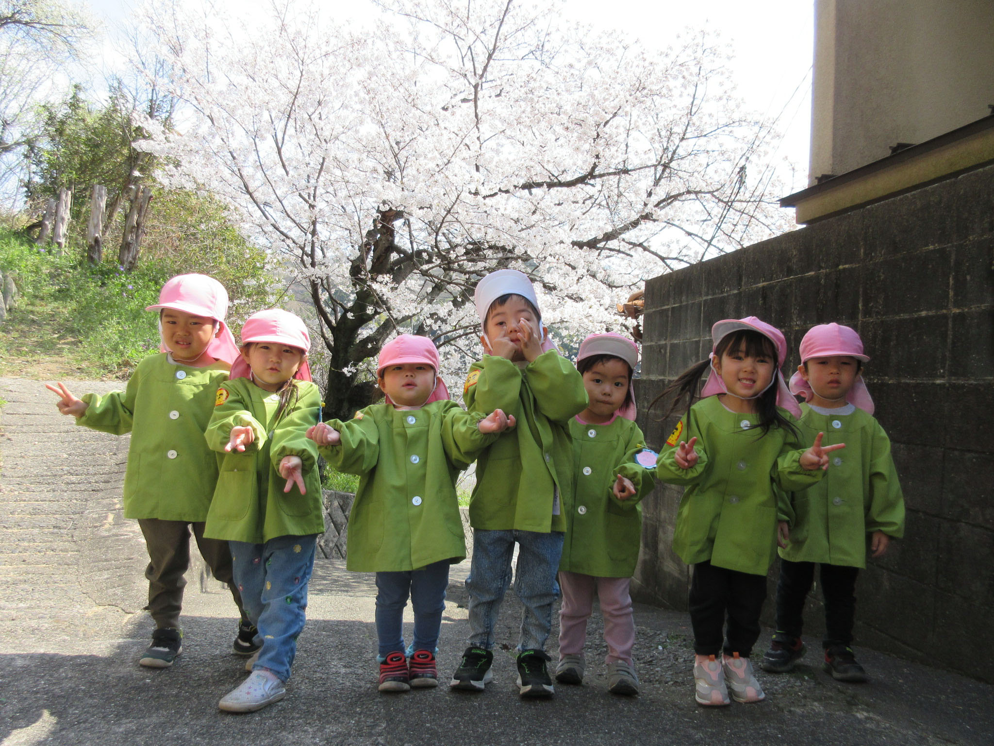 ぞう組さんが始まって早いもので4日が経ちました。 少しずつリュックを持って2階のお部屋に上がるのも 慣れてきたみんなですよ。 今日は坂道に咲いている桜の木が満開だったので、 みんなで写真を撮りにいきました!! 満開の桜が見えると「すごーい!!」「きれだね~!!」と 桜に見入るぞう組さん。とってもいい写真が撮れましたよ。 桜と写真を撮った後はお天気が良かったので、 アンパンマンの遊具のある運動場で遊びました。 友だちと追いかけっこをしたり、滑り台を滑ったりアンパンマン・ バイキンマンのロッキングの遊具を楽しんだり。春の虫探しを したり。途中自分の水筒で水分補給をしながら外遊びを楽しみ ましたよ!! |