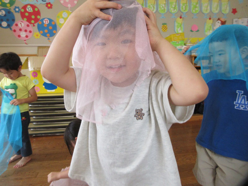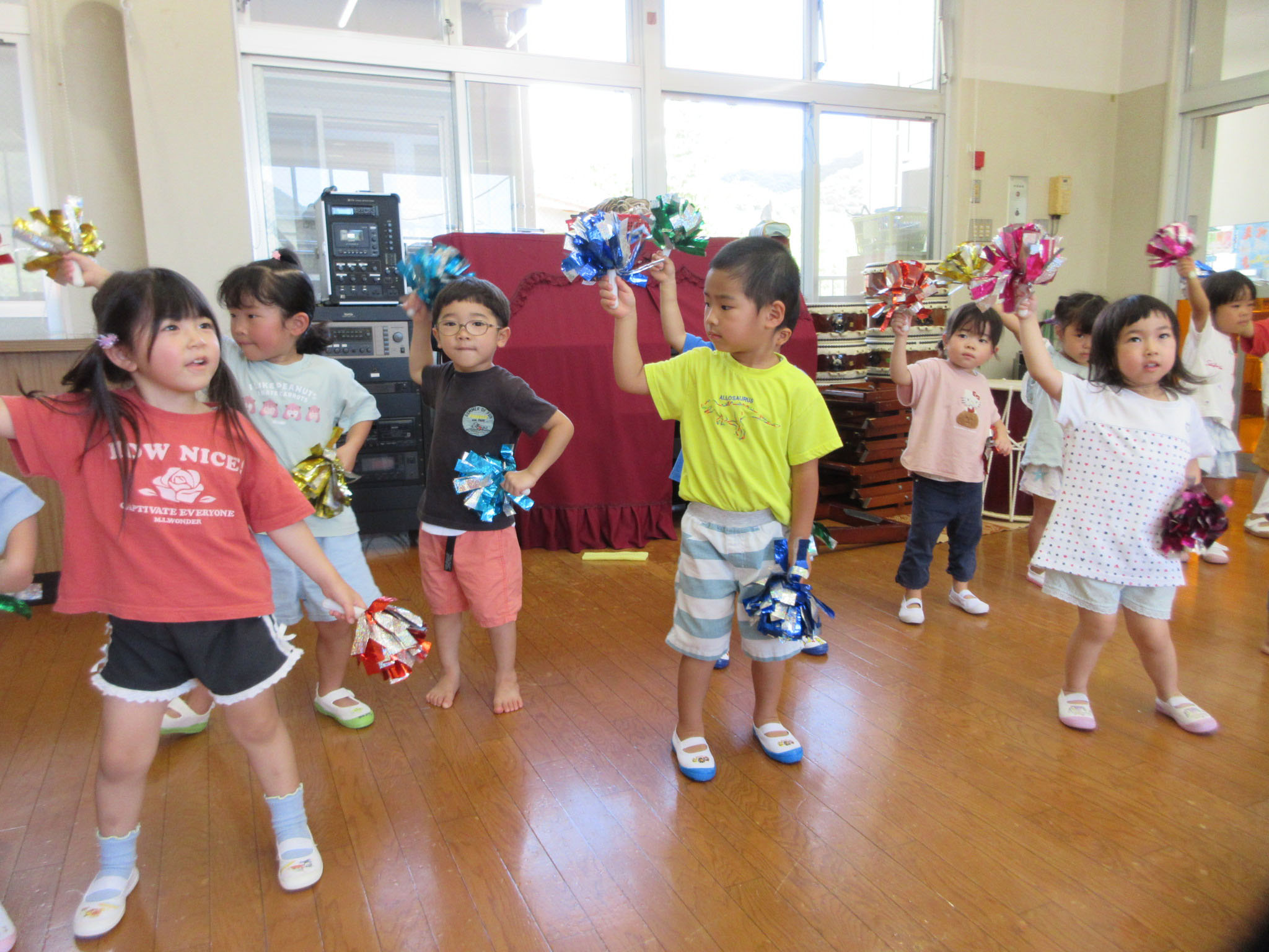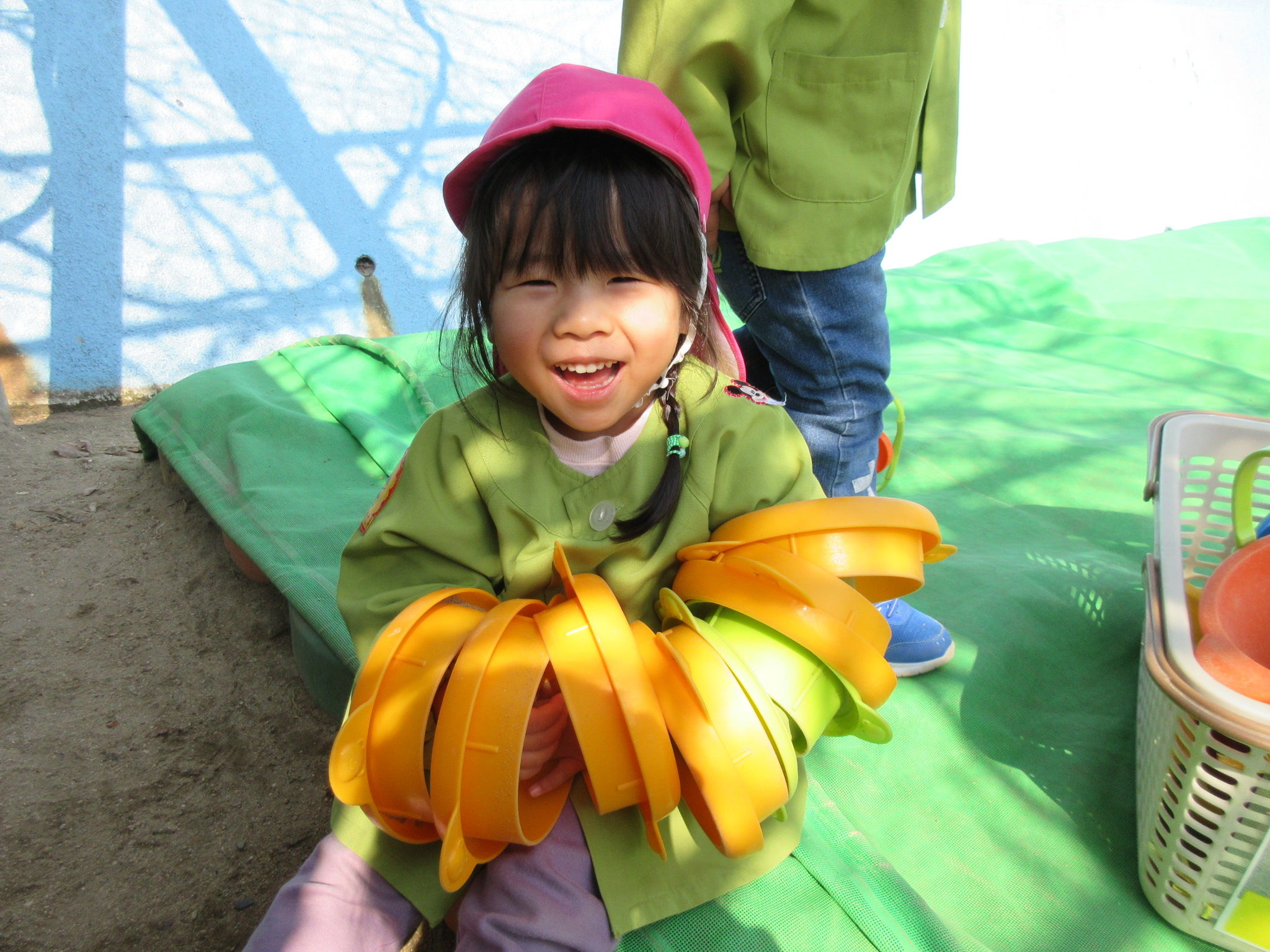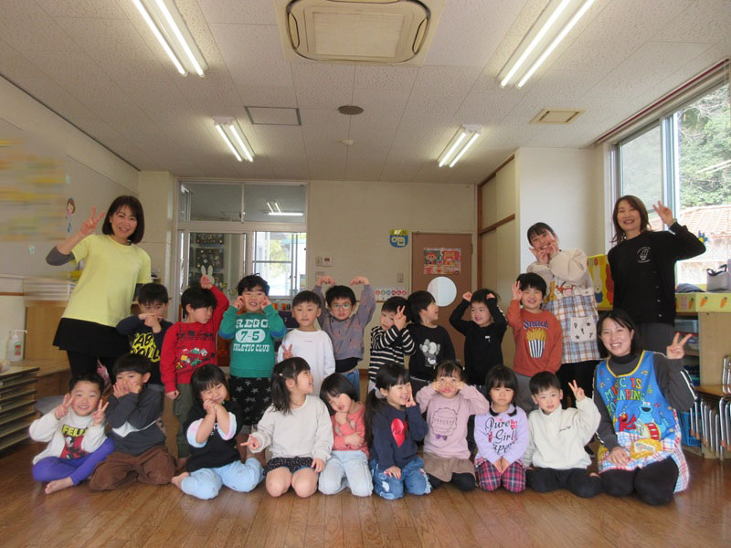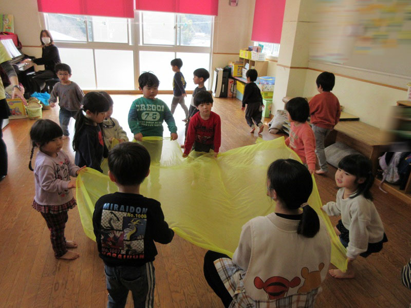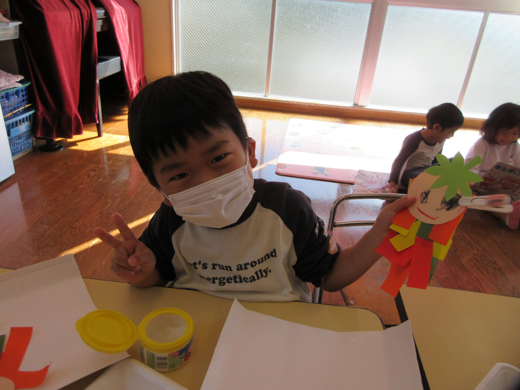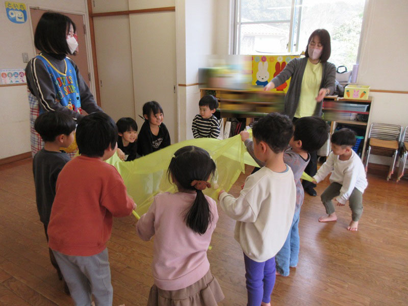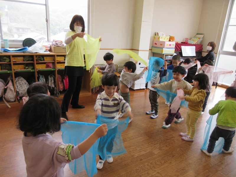 今日で1月が最後ですね。2月は節分がありますね。鬼のお面が完成しこども園にも鬼がきたら「やっつける!」と張り切っている子どもたちです(^^♪ 2人組になって、布を揺らしたり、布を絡ませて前後に動かしたりしました。 「1,2,1,2,!!」と掛け声を出してやってみたり、阿吽の呼吸でタイミングが揃っていたりしました。 途中でからまっているのがほどけると「あれ!?」「もう一回しよう」とどうやったら出来るか試行錯誤をしていました。 同様にタンバリンもして、交互に鳴らし拍子をつかめるようにしてみました。 「はい!はい!次は~ちゃん、くんね」と教え合ったり、音がなるのが楽しいぞう組さんでした。 発表会でした劇「おむすびこりん」で着た衣装で写真撮影♡ 「もう1回着れるの!?」と喜んでいました。写真を撮る時のポーズは個性豊かでとてもかわいいです( *´`) |