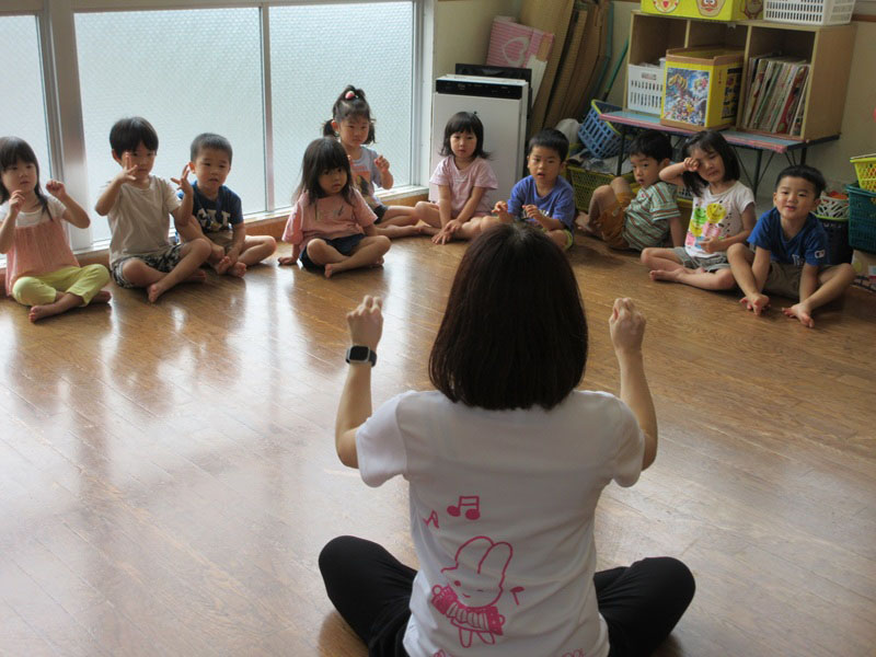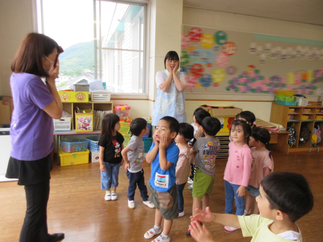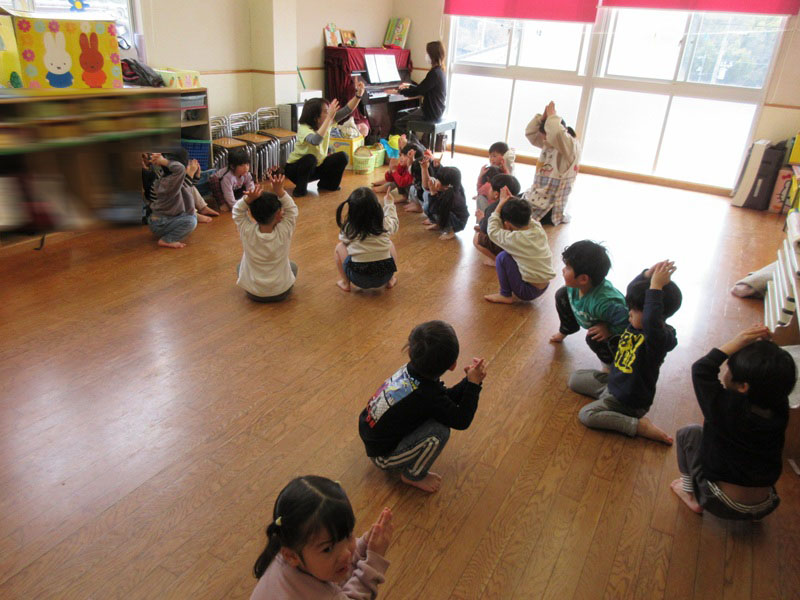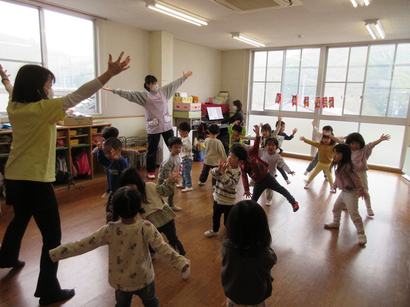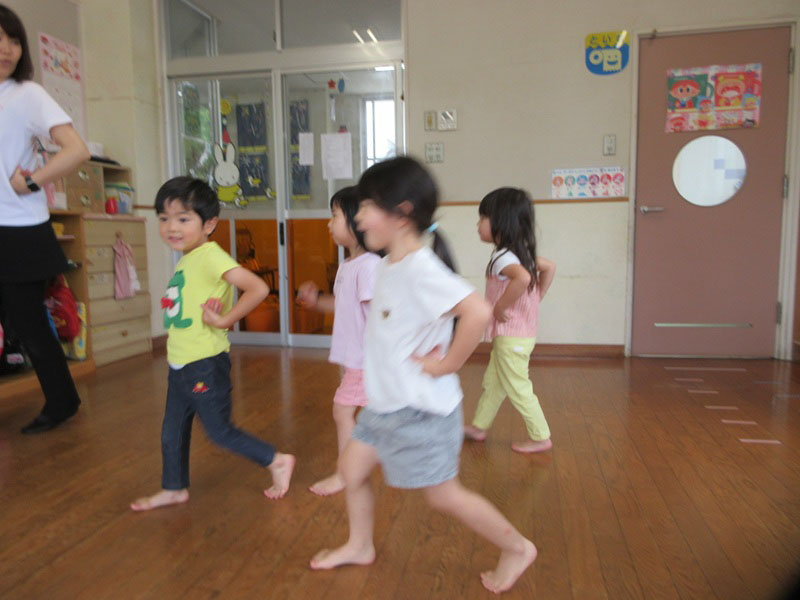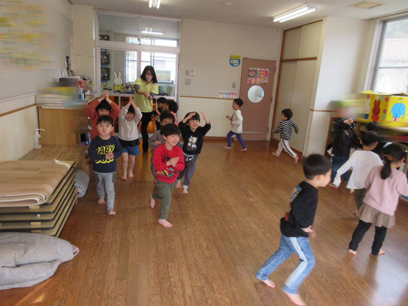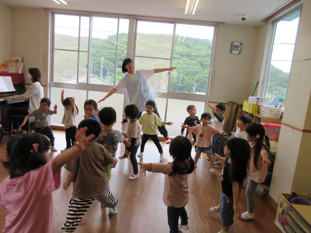 保育参観日は月2回しているリトミックを行いました。「今日は、リトミックでしょ☆彡」「ママ、パパがくるんの~」と楽しみにしていました。 「チョット、グット、パー」を参観日バージョン! 親子で向かい合って「チョキ、グー、パー」を手指を合わせながら行いました。指を合わせようと「あれ!?」となりまがら一所懸命する姿がほほえましかったです。 手をつないで「おうまのまんま」「おつかいありさん」の歌に合わせてステップしたり、円になりぬいぐるみをまわしたりしました。まわしている時にどこで止まるかドキドキでした! 大好きな忍者をイメージしてしました。忍び足で歩いたり、素早く走ったりしました。大きな音が聞こえると岩になりしゃがみました。手裏剣を「シュシュシュ」と素早くとばしていました☆彡 リトミックでは、音を集中して聴き、4拍子・2拍子の音楽を聴き分けてみんなで楽しく身体を動かすこと等行っています。今年度の参観日は今回で終了しましたが、1年の集大成として発表会がありますのでお楽しみに! 保護者のみなさま、ご理解・ご協力いただき子どもたちも楽しんで参観日を終えることができました。ありがとうございました。今度ともよろしくお願いします。 |