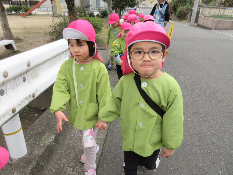 今日は、公園を目指してお散歩をしました(^^♪ ぞう組になって初めてのお散歩で、 朝からみんなワクワクしている様子でした! 公園までの道には、イチジクやザクロ、金木犀、紅葉している葉っぱ など秋を見つけながら、歩きました! 「飛行機雲だっ!」「あ、パトカー」と 公園に着く前でも楽しそうな様子でしたよ。 公園に着いてからは、園とは違う遊具もあり、 お友だちと順番を守りながら、過ごしました! 遊具だけでなく、木の実を見つけたり、砂にお絵描きをしたりして お友だちと楽しく過ごしました(*^_^*) 帰り道は、疲れ+上り坂と言うこともあり、 行きに比べてペースダウンしましたが、 給食を励みに頑張って歩きました!! |
