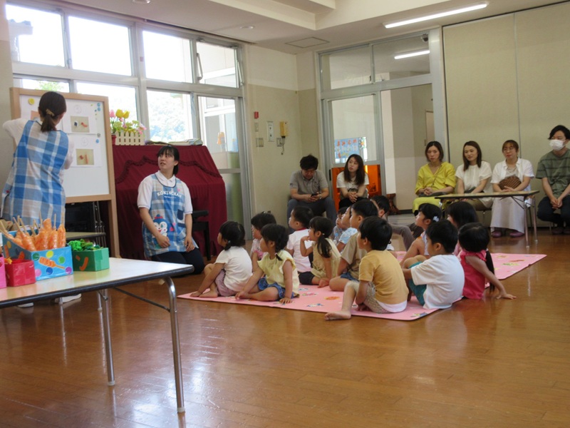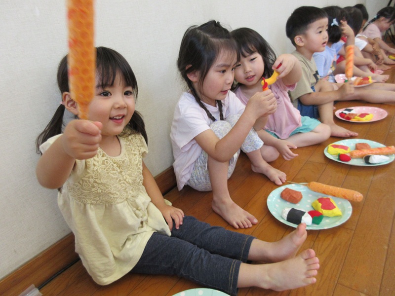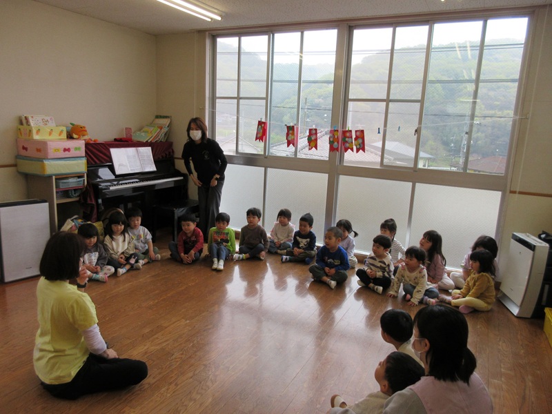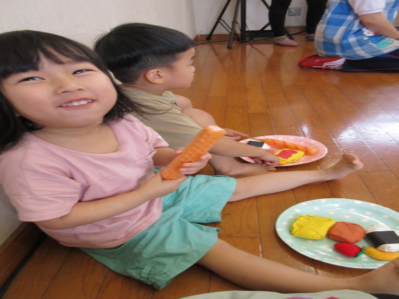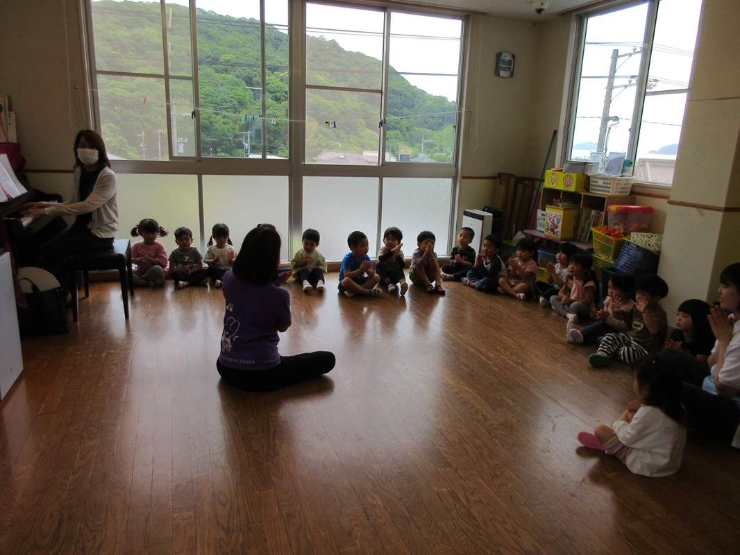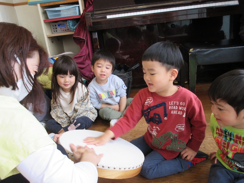 今日は今月2回目のリトミックがありましたよ!! 朝から「今日、リトミック♬」と楽しみにしていたぞう組さん。 リトミックの先生と朝のご挨拶をして、リトミックの時間。 お父さん座りをしてまずは、ウオーミングアップ。 「トントンパ」のリズムに合わせてトンの部分ので手拍子、パの 部分で手を開くというリズムあそびをしました。 次にハンドドラムとウッドブロックを使って初めてのお返事ハイを しましたよ。 その後は「ことりのうた」に合わせて2拍子のリズムで身体を 揺らしたりピアノの音でくるっと身体の向きを変えたり、 「しょうとつ 列車」では4・2・8拍子を聴き分けたり、わらべうたの 「おせんべいやけたかな」でステップを踏んだりしましたよ。 リトミックの後はおいしい給食の時間!! 19日からスタートした給食のご褒美スタンプをゲットしようと 頑張って45分間内の完食を目指しているぞう組さんですよ♬