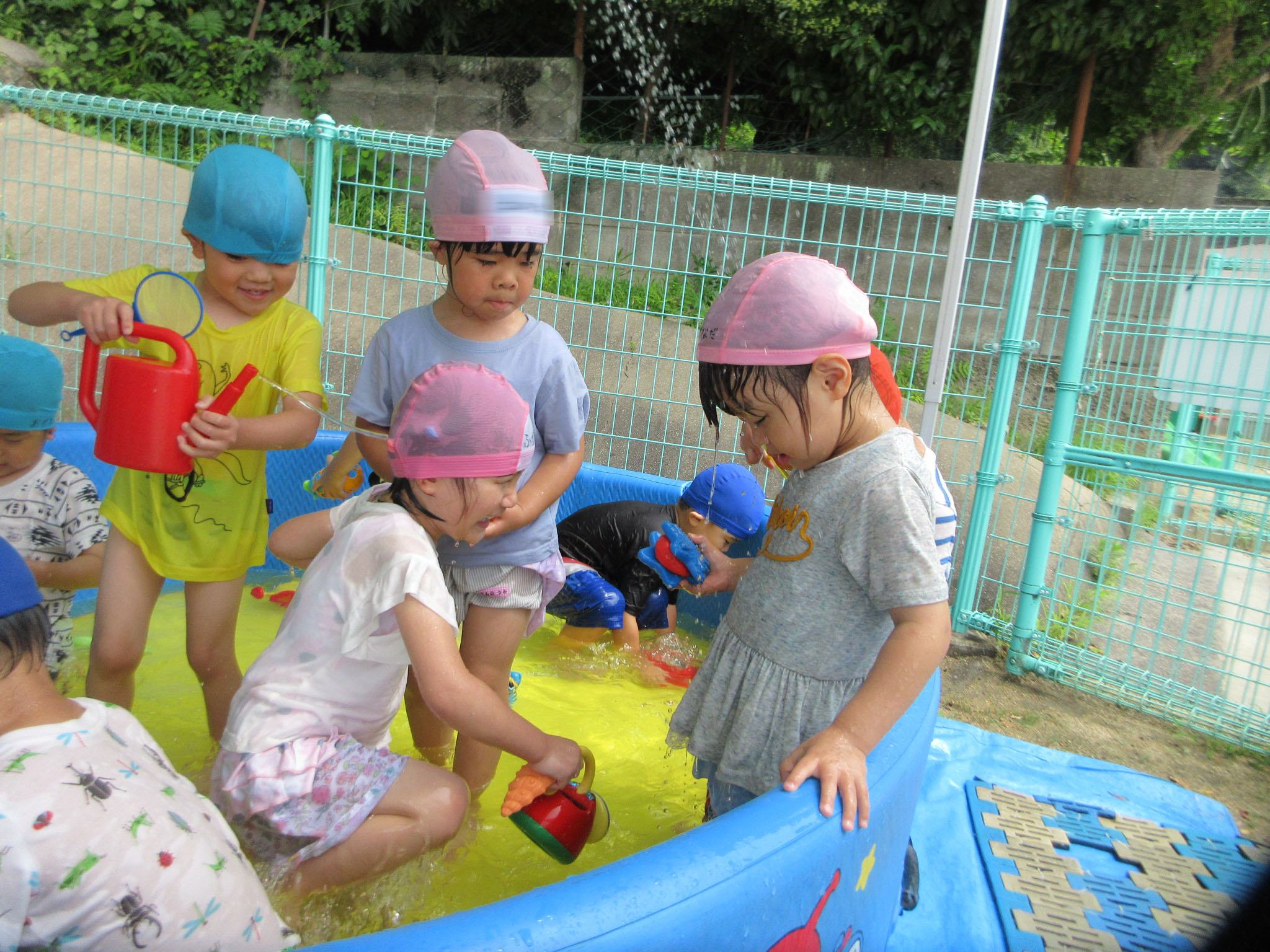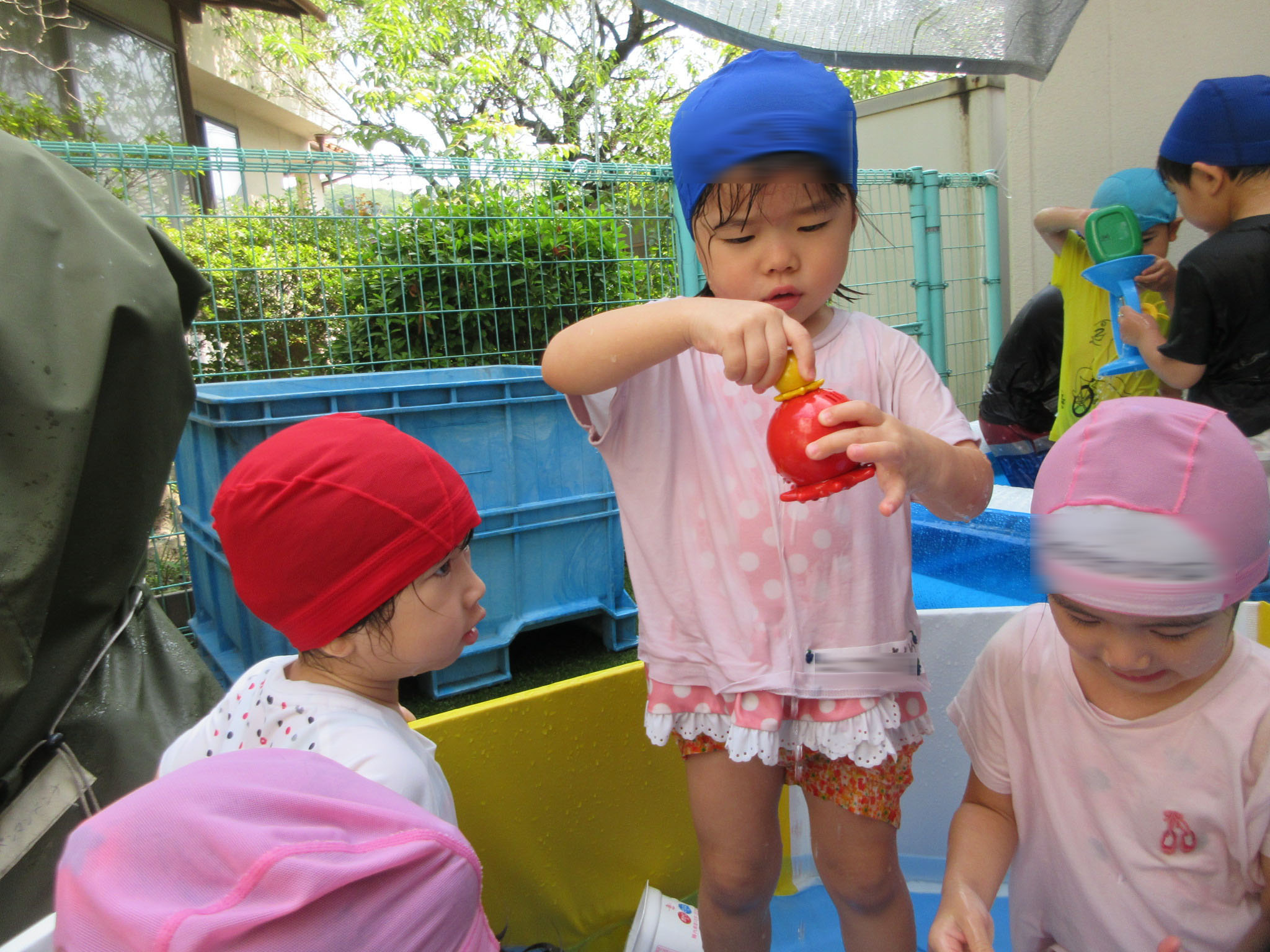 今日は、ぞう組さんが大好きなプール遊びをしました! いつもは運動場ですが、今日は中庭で(^^♪ 久々のプールがいつもと違う場所に、いつもと違うおもちゃで、 いつも以上に楽しそうでした!! 最初に比べるとお水にも慣れ、 お水への恐怖心がなくなってきたのか、 お友だちとお水をかけ合って遊んだり、ごっこ遊びをしたり、 プール遊びを楽しんでいる様子でした(*^^*) もう少しでプール遊びが出来なくなってしまうのが 残念で悲しそうにしていましたが、 残り数回のプール遊びを楽しもうと思います(^^)/ |