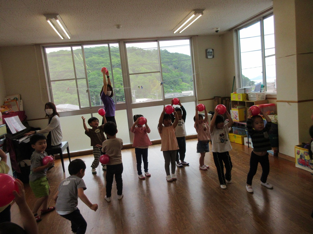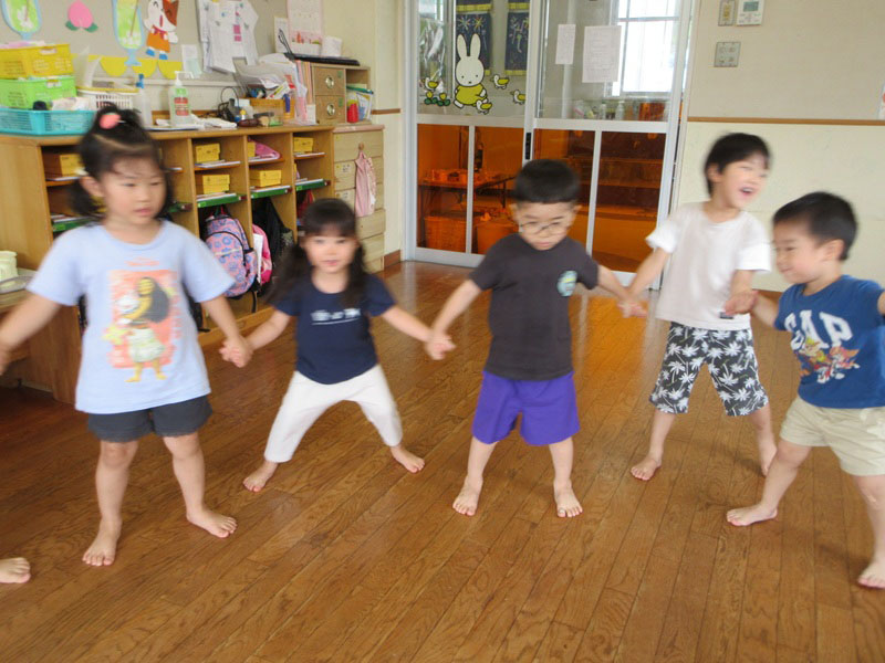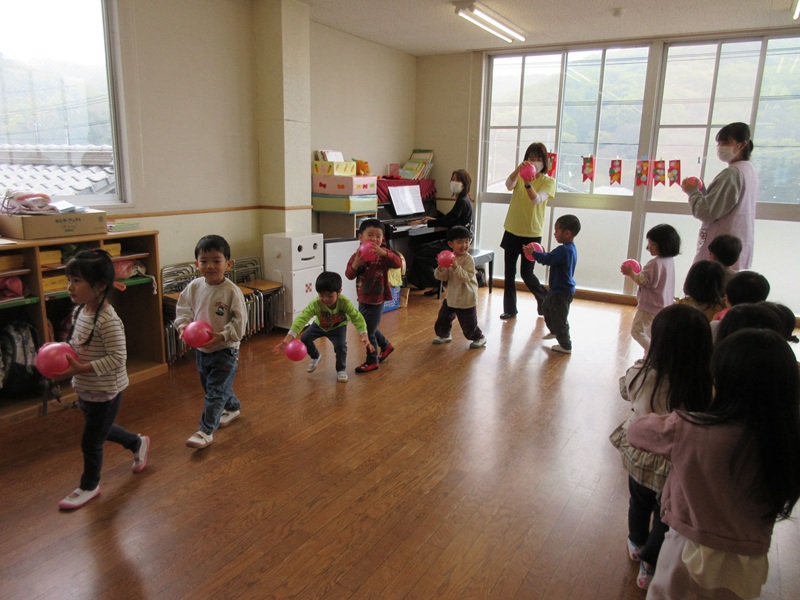 ウォーミングアップは、「グット、チョット、パー」を行いました。グー、チョキ、パーを歌に合わせて動かしながら、今日は友達と2人組でしました。 向かい合ってやってみると、「意外と難しいな」「チョキからなら簡単」と順番によってかわってくるようです!歌詞に合わせてやろうと真剣モードで指をしっかりと動かしていました。 その後は、ボールを使いました! 「おうまはみんな」「おつかいありさん」の歌に合わせてボール回しやボール同士でタッチをしました。 ボール回しで曲が止まったお友だちは円のまわりをスキップやギャロップでまわってみました。 最後にわらべうたの「いっちくたっちく」♪ 言葉のリズムに合わせてステップしました。「はっ!」と両手片足を思いっきりあげて楽しみました(^^ 次回のリトミックは保育参観日で行います。子どもたちが音楽やイメージを膨らませて、身体を動かして楽しんでいる姿を見ていただきたいと思います。親子で楽しむ内容もありますので、お楽しみに! |